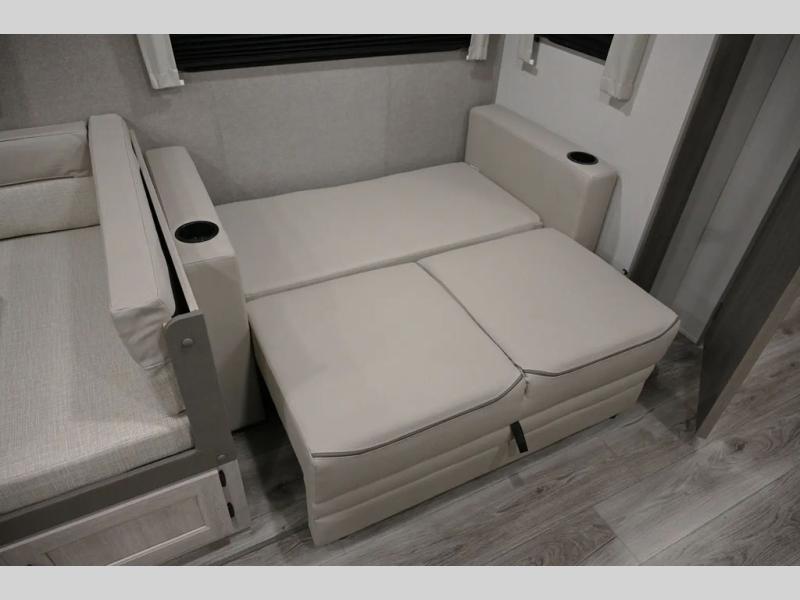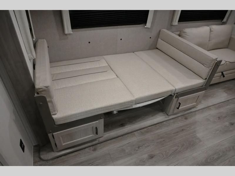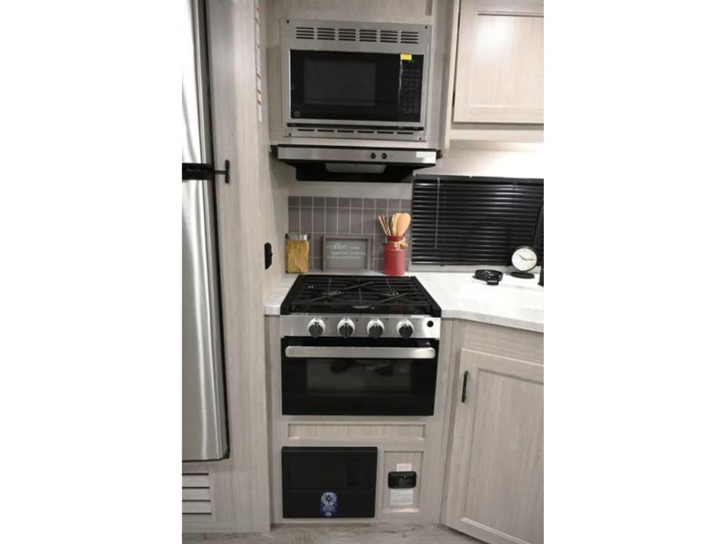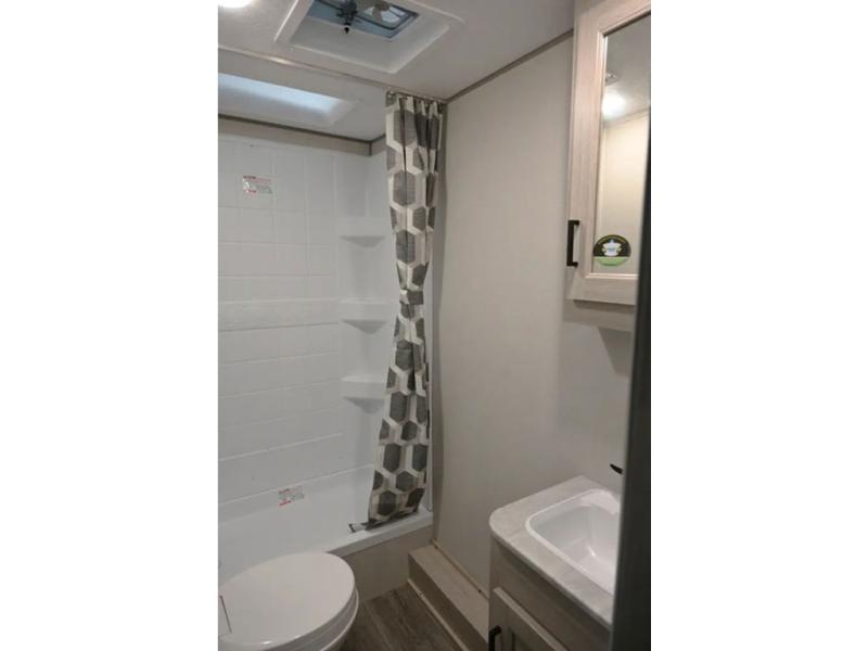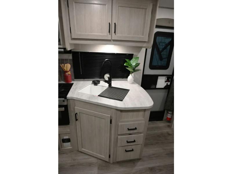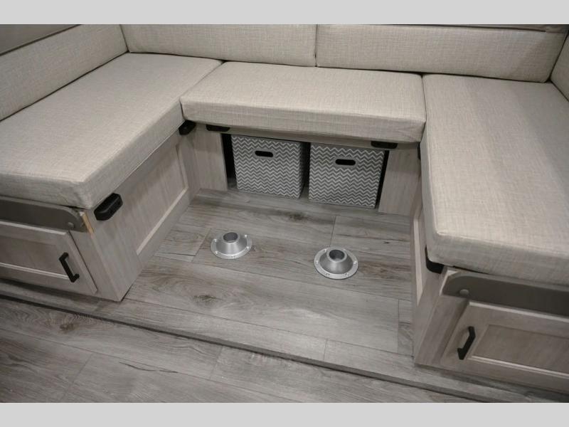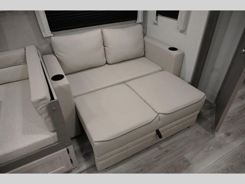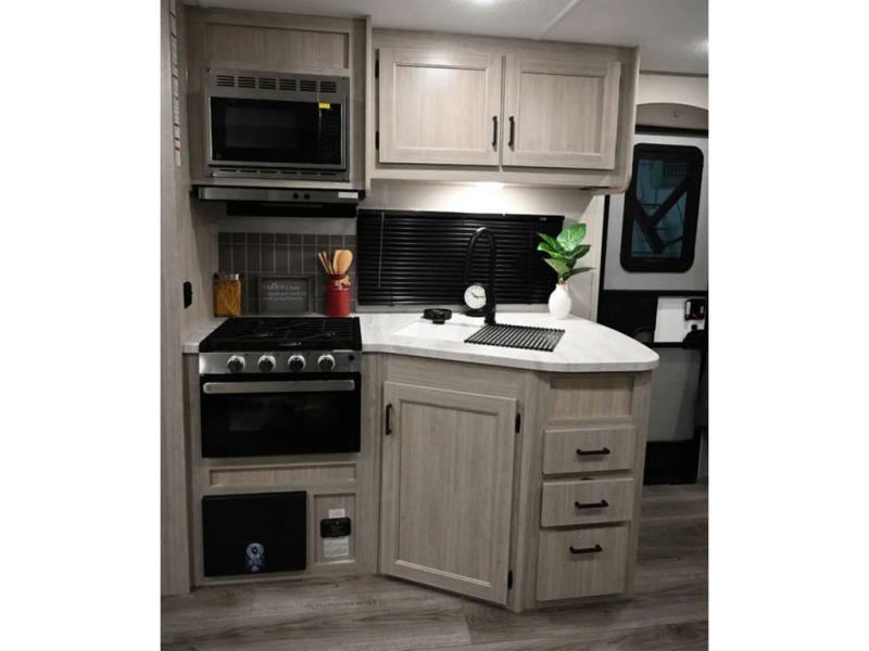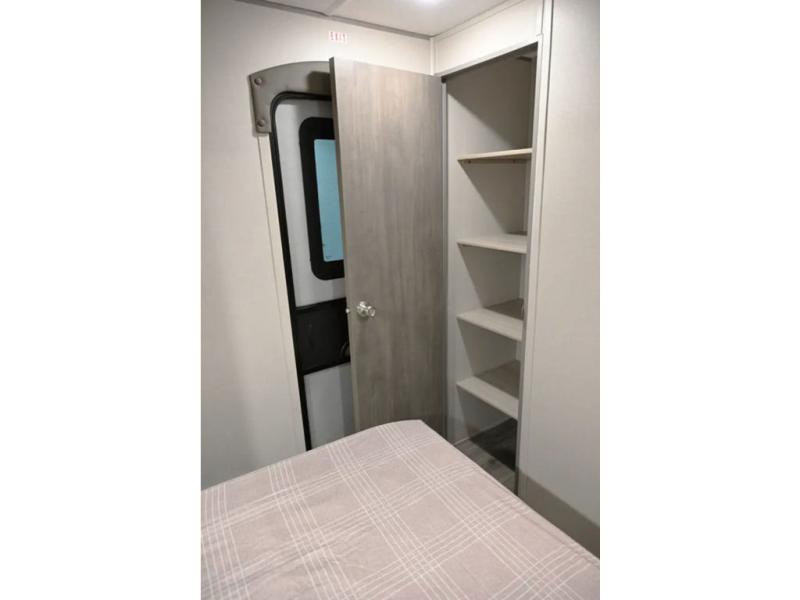 When you enjoy camping with your own accommodations and space for the whole crew, hitch this trailer up and head to the campgrounds! After loading everything easily thanks to the dual entry doors and all the interior and exterior storage, you will have no worries that you left anything behind. The electric awning is easy to set up, and the awning offers multicolor LED lights to choose from by using the remote. When you are outside the cook might like to make a meal using the outside camper kitchen. The interior kitchen offers full amenities including a pantry, and everyone can enjoy the angled entertainment center. There are double-size bunks with a ladder for the kids and a walk-around RV queen bed for the owner to sleep on, plus furniture in the living area that doubles as additional sleeping space!
