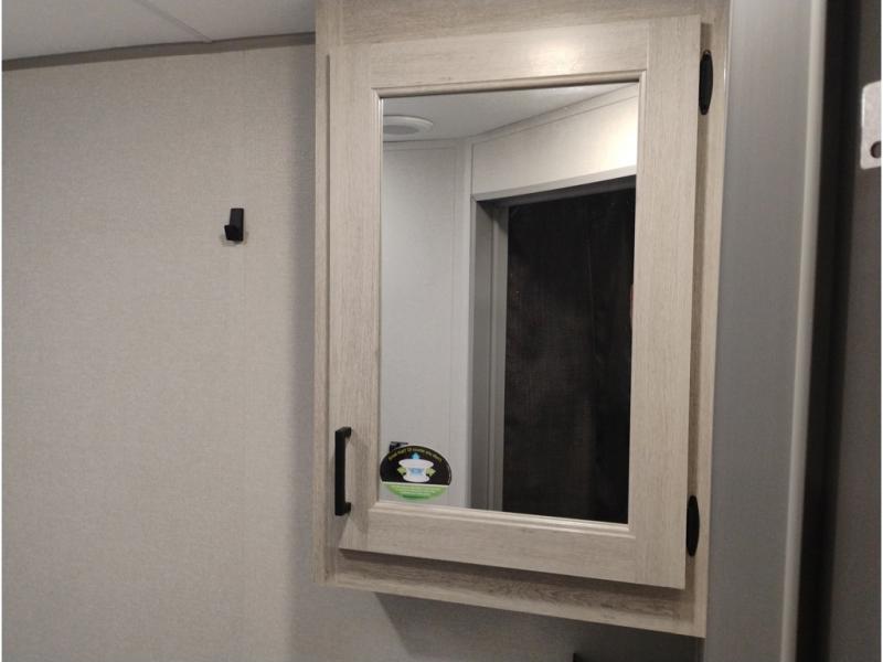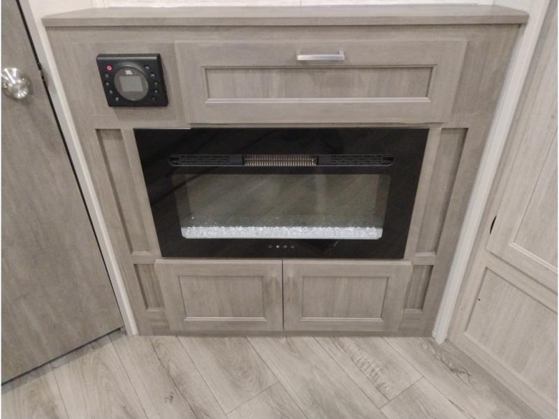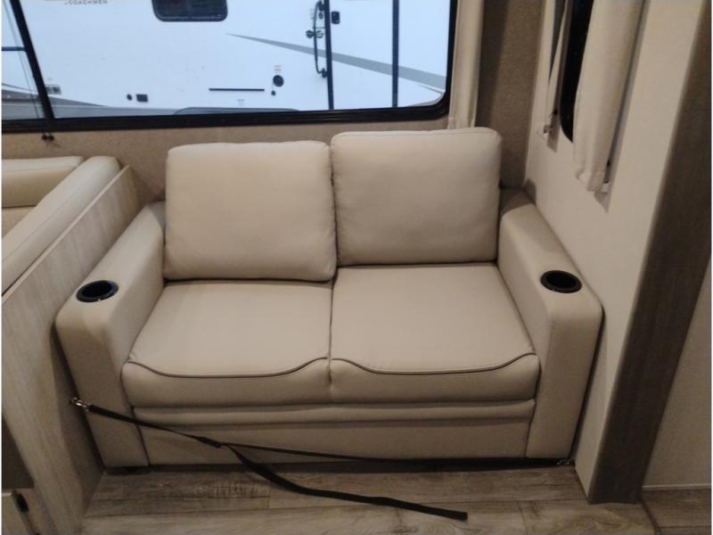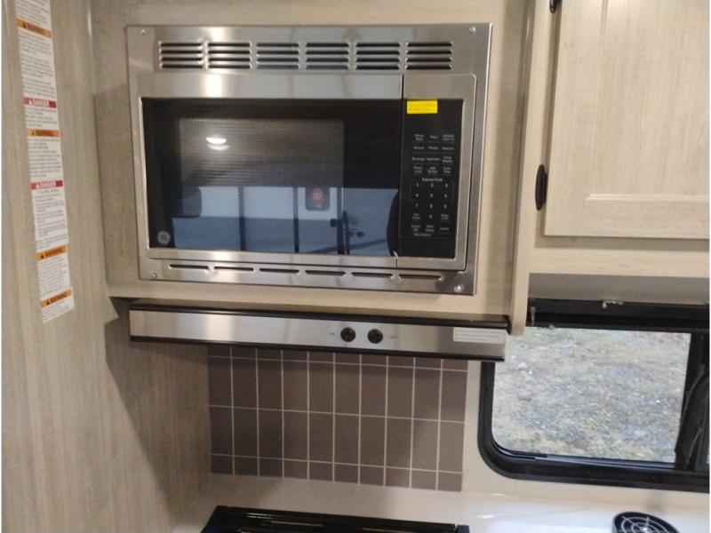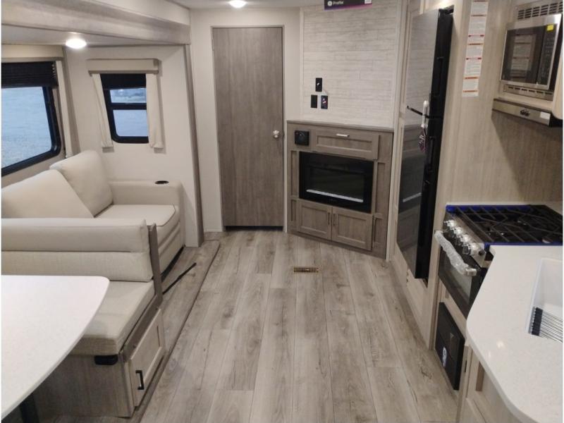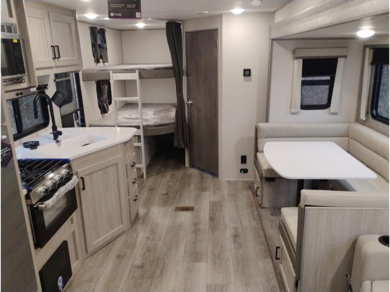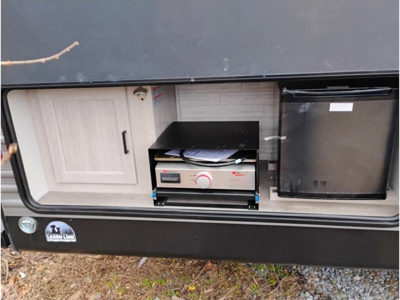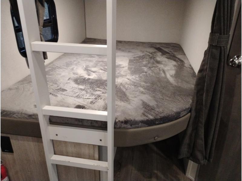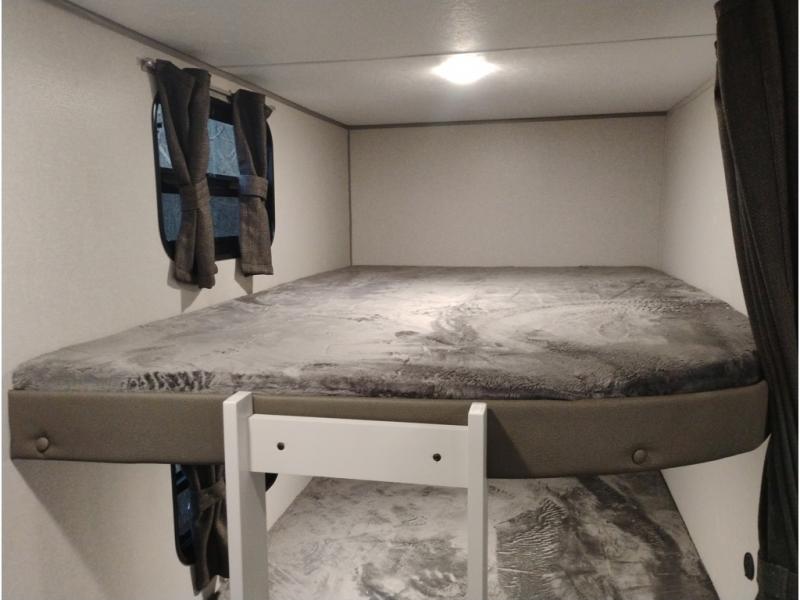 When you enjoy camping with your own accommodations and space for the whole crew, hitch this trailer up and head to the campgrounds! After loading everything easily thanks to the dual entry doors and all the interior and exterior storage, you will have no worries that you left anything behind. The electric awning is easy to set up, and the awning offers multicolor LED lights to choose from by using the remote. When you are outside the cook might like to make a meal using the outside camper kitchen. The interior kitchen offers full amenities including a pantry, and everyone can enjoy the angled entertainment center. There are double-size bunks with a ladder for the kids and a walk-around RV queen bed for the owner to sleep on, plus furniture in the living area that doubles as additional sleeping space!