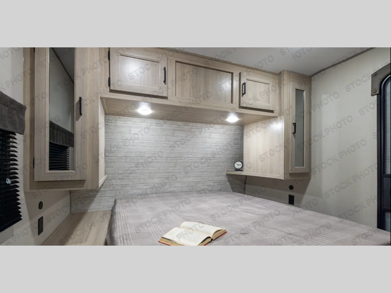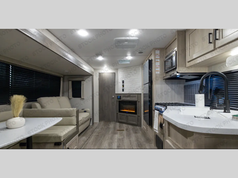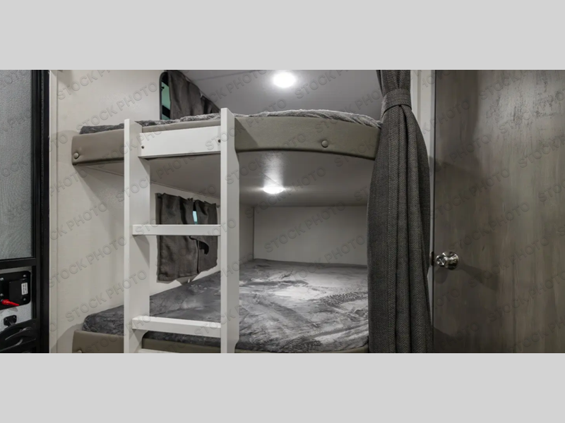 When you enjoy camping with your own accommodations and space for the whole crew, hitch this trailer up and head to the campgrounds! After loading everything easily thanks to the dual entry doors and all the interior and exterior storage, you will have no worries that you left anything behind. The electric awning is easy to set up, and the awning offers multicolor LED lights to choose from by using the remote. When you are outside the cook might like to make a meal using the outside camper kitchen. The interior kitchen offers full amenities including a pantry, and everyone can enjoy the angled entertainment center. There are double-size bunks with a ladder for the kids and a walk-around RV queen bed for the owner to sleep on, plus furniture in the living area that doubles as additional sleeping space!