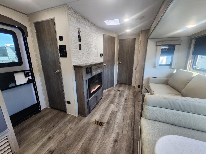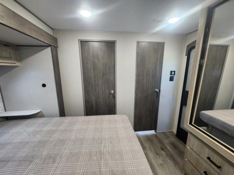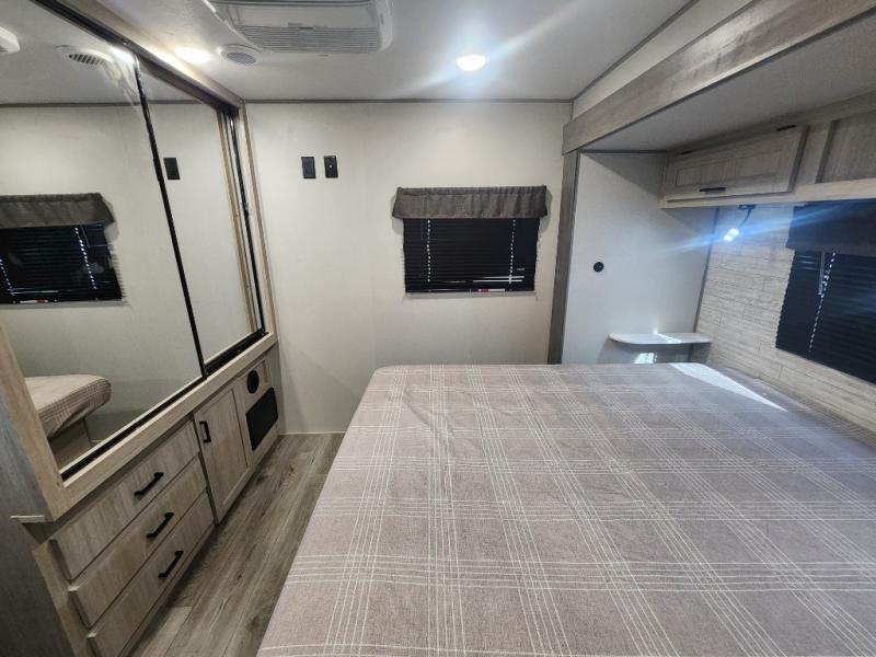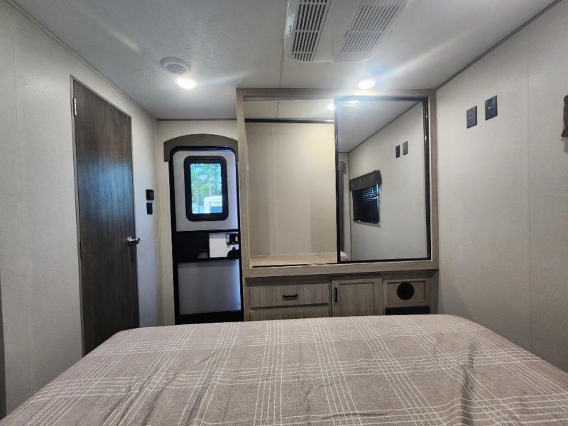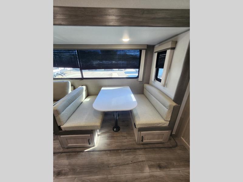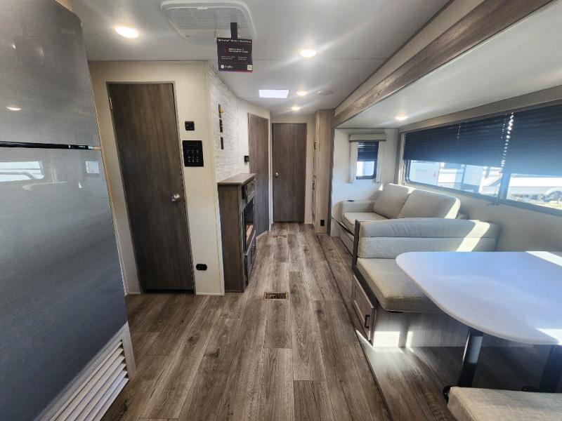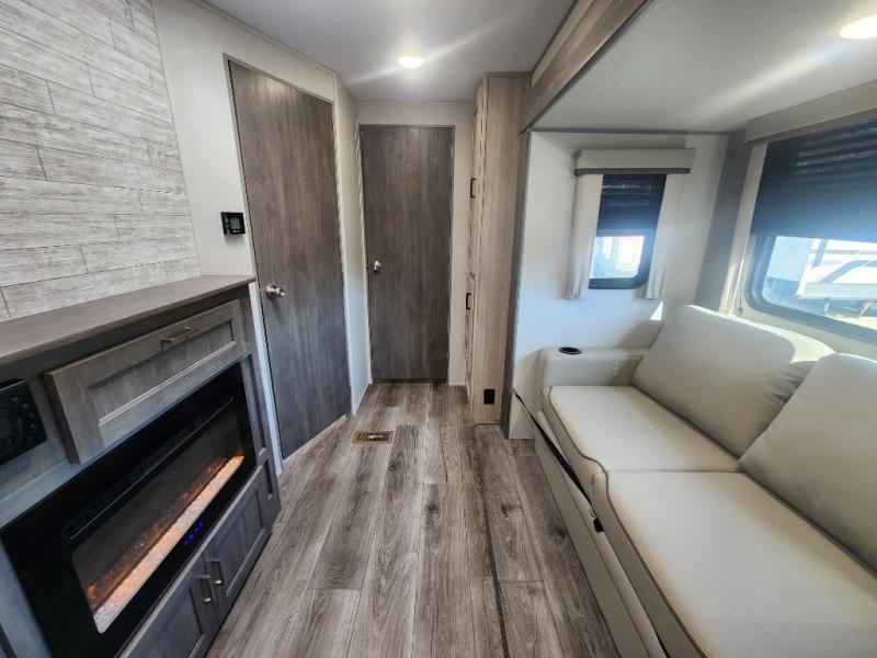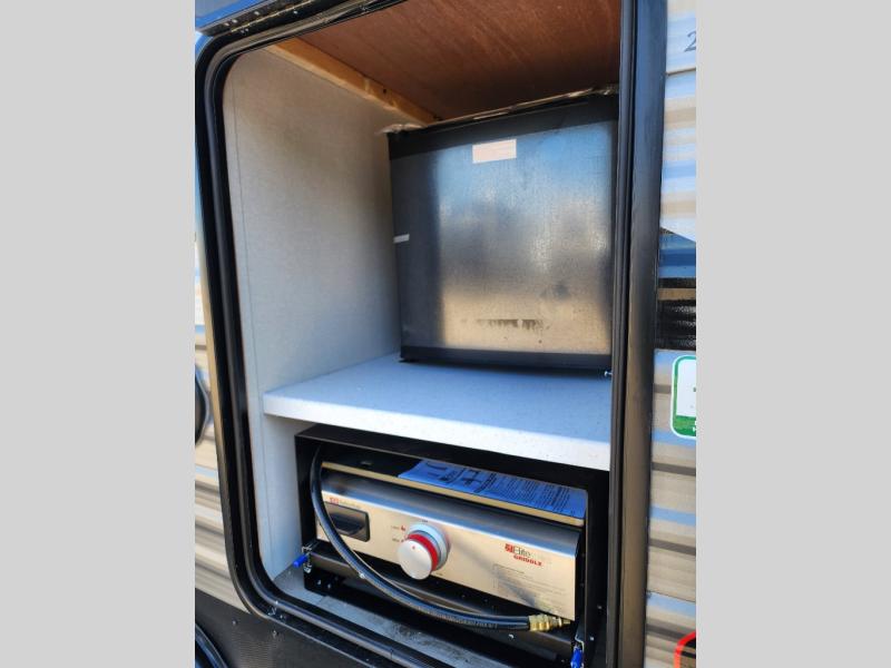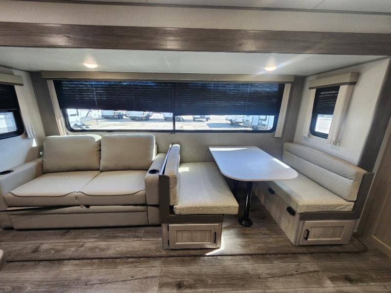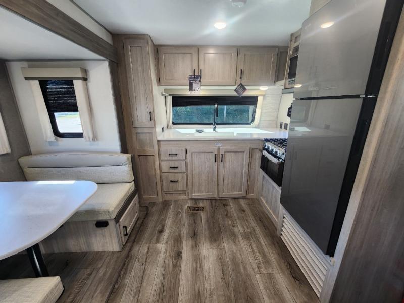 Step into comfort with this front kitchen travel trailer! You will love the amount of counter space you have to prep and cook meals. There is also an outdoor camper kitchen with a griddle and mini refrigerator for breakfast outdoors. There is plenty of storage space for all your belongings, including two kitchen pantries, overhead cabinets, a closet and a wardrobe, plus a pass-through storage. Your crew can get comfortable on the 68" trundle sofa and booth dinette within the large slide out, and there is an entertainment center if you plan to bring your own TV. And don't overlook the rear master bedroom with an RV queen bed slide out, a wardrobe, plus its own exterior entry door!