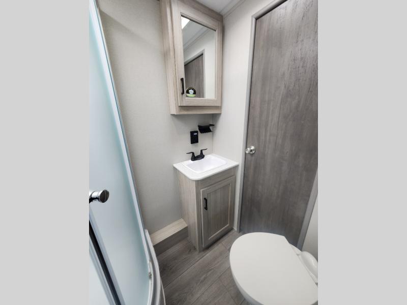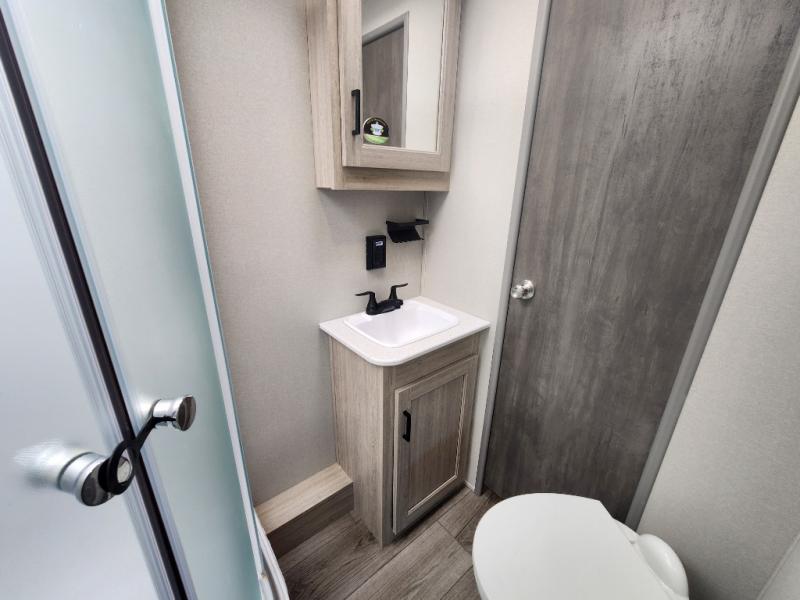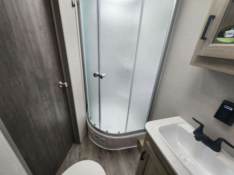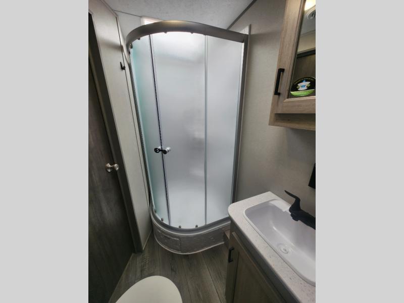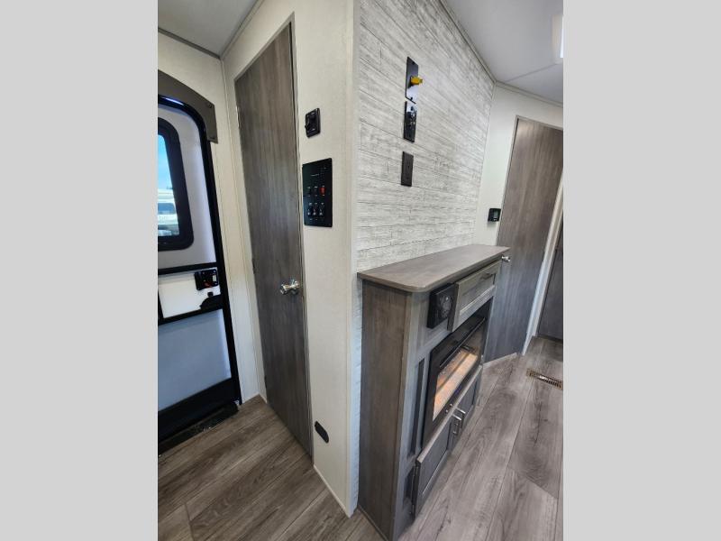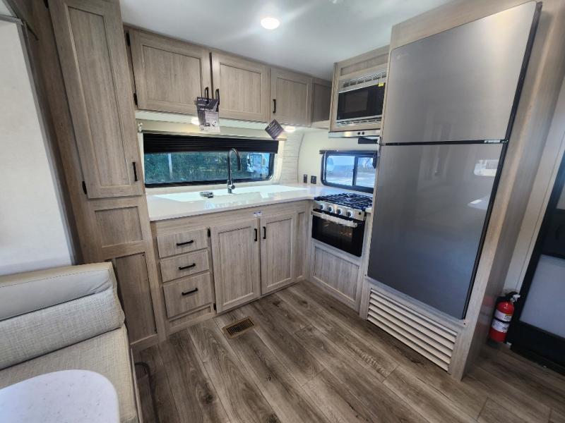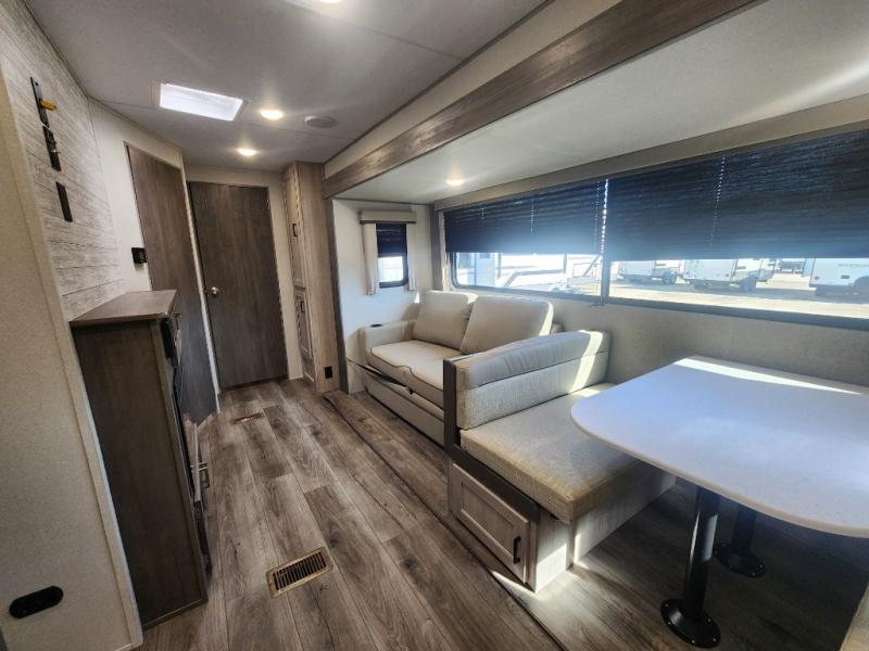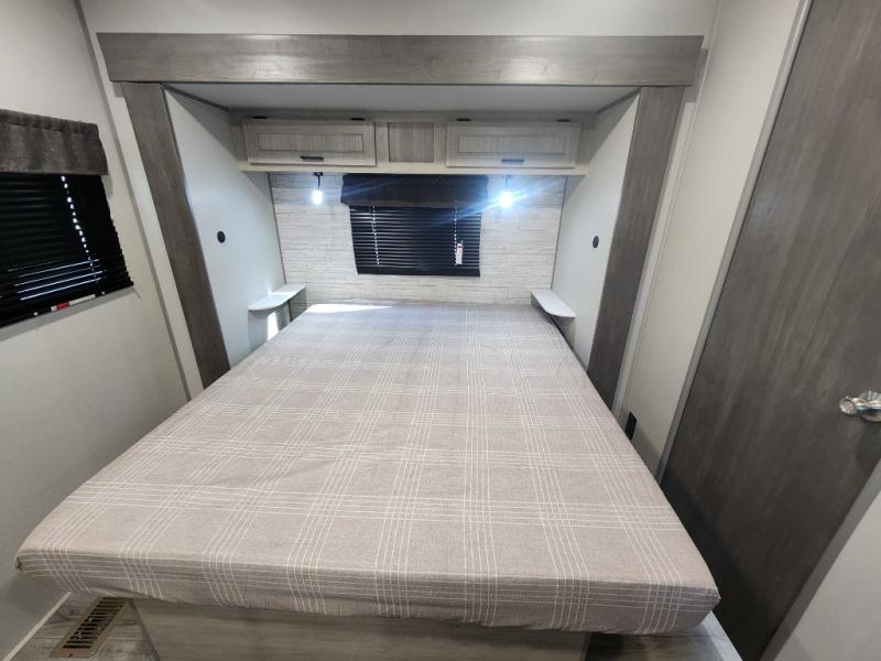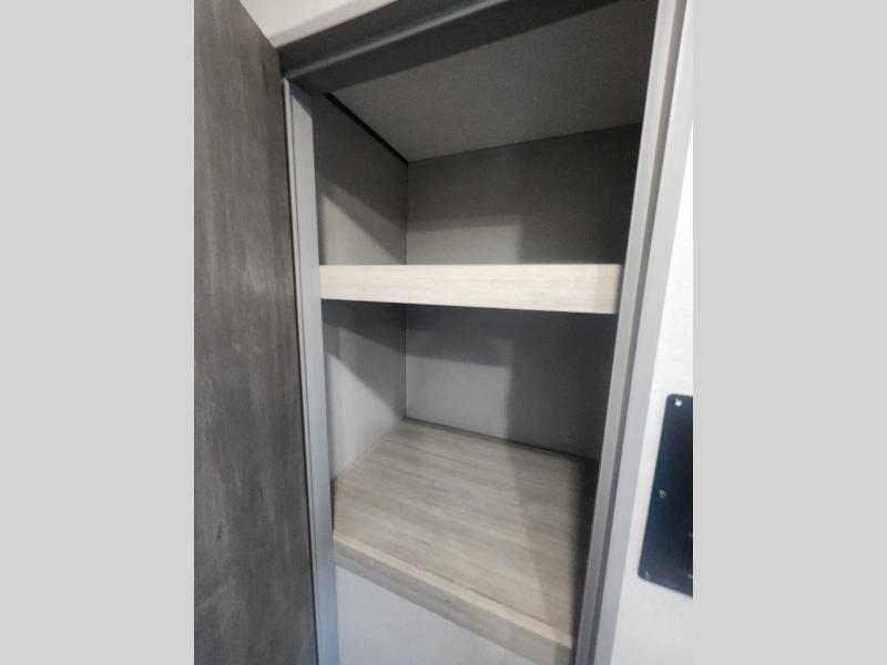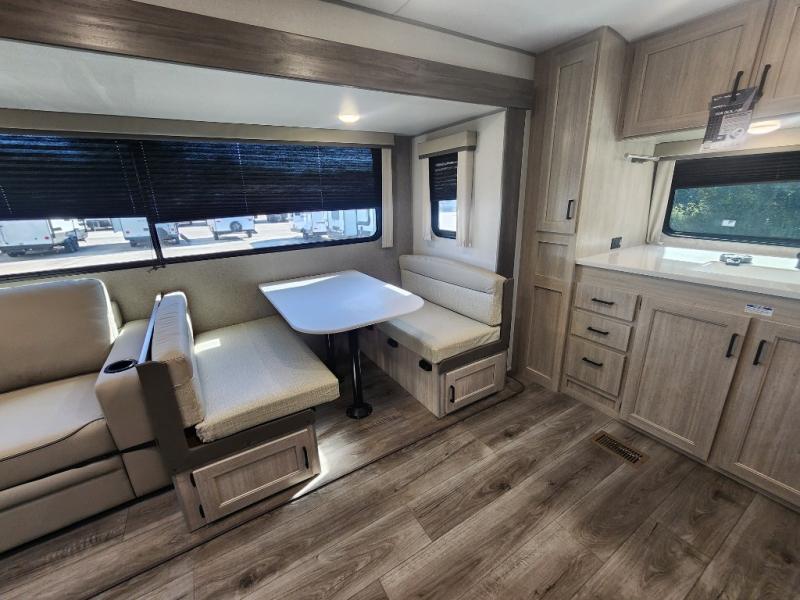 Step into comfort with this front kitchen travel trailer! You will love the amount of counter space you have to prep and cook meals. There is also an outdoor camper kitchen with a griddle and mini refrigerator for breakfast outdoors. There is plenty of storage space for all your belongings, including two kitchen pantries, overhead cabinets, a closet and a wardrobe, plus a pass-through storage. Your crew can get comfortable on the 68" trundle sofa and booth dinette within the large slide out, and there is an entertainment center if you plan to bring your own TV. And don't overlook the rear master bedroom with an RV queen bed slide out, a wardrobe, plus its own exterior entry door!