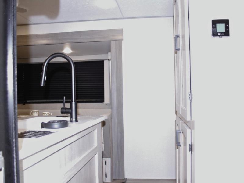 Two entry doors make campground life easier—use the rear entry directly into the full bath for quick cleanups, or step into the front living space to unwind in style. A super slide-out expands the living area, creating an open feel that rivals home. Every detail, from the solid surface countertops to the hard valance window treatments, reflects Coachmen’s commitment to comfort and quality.
