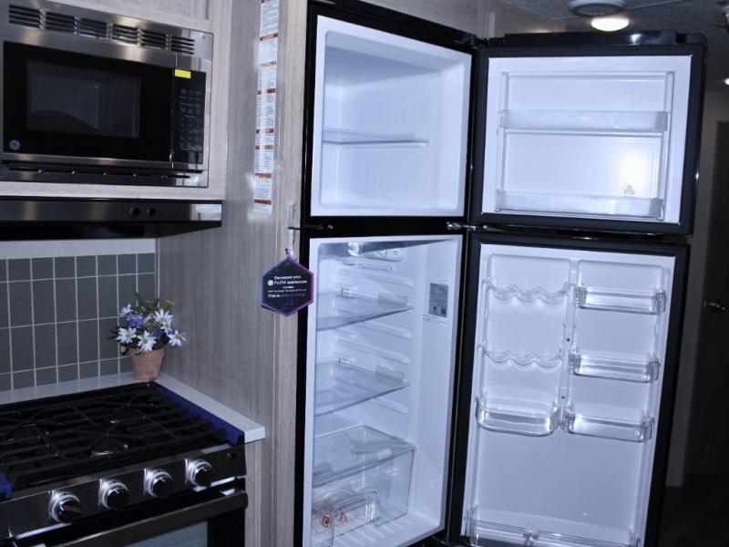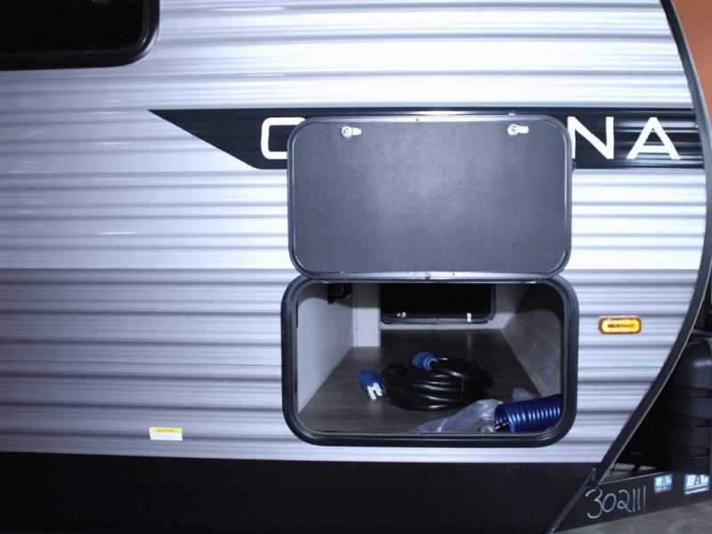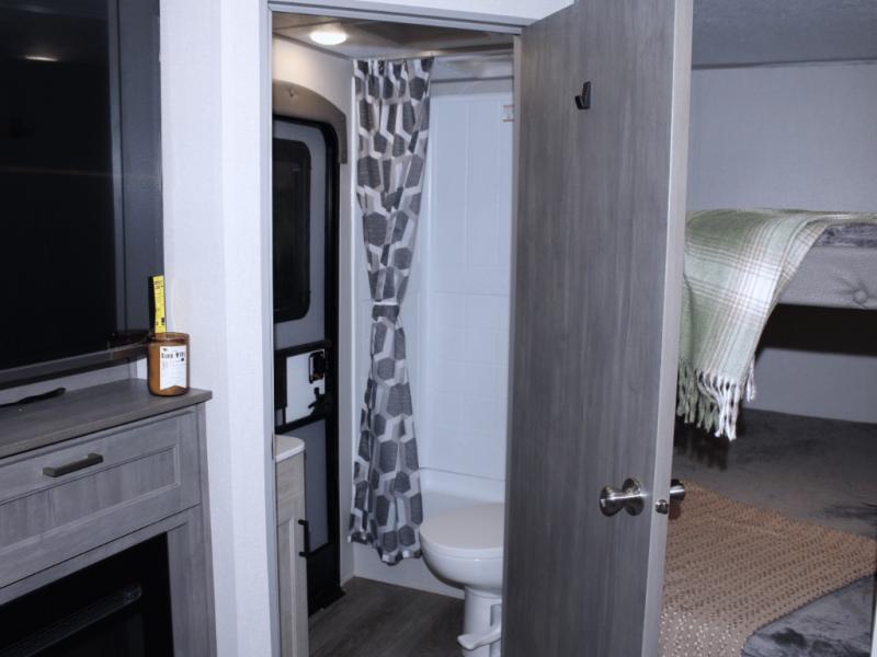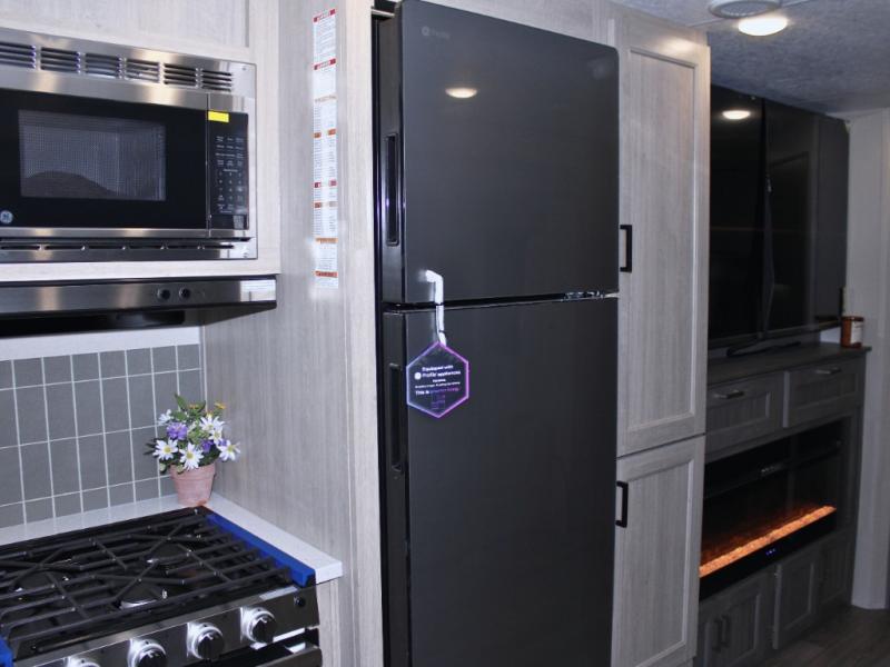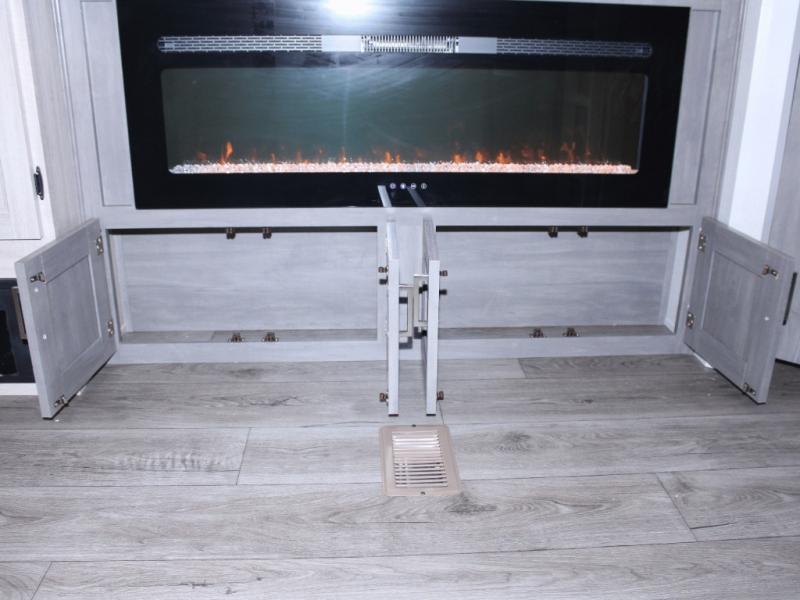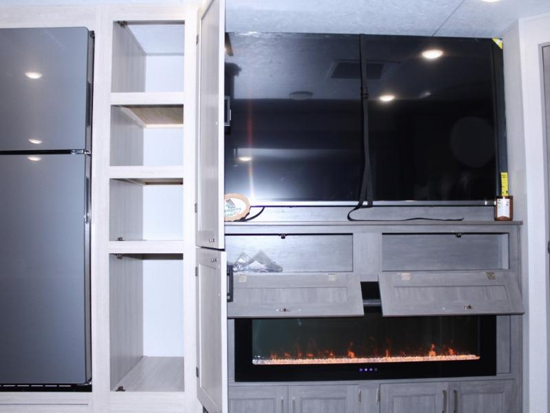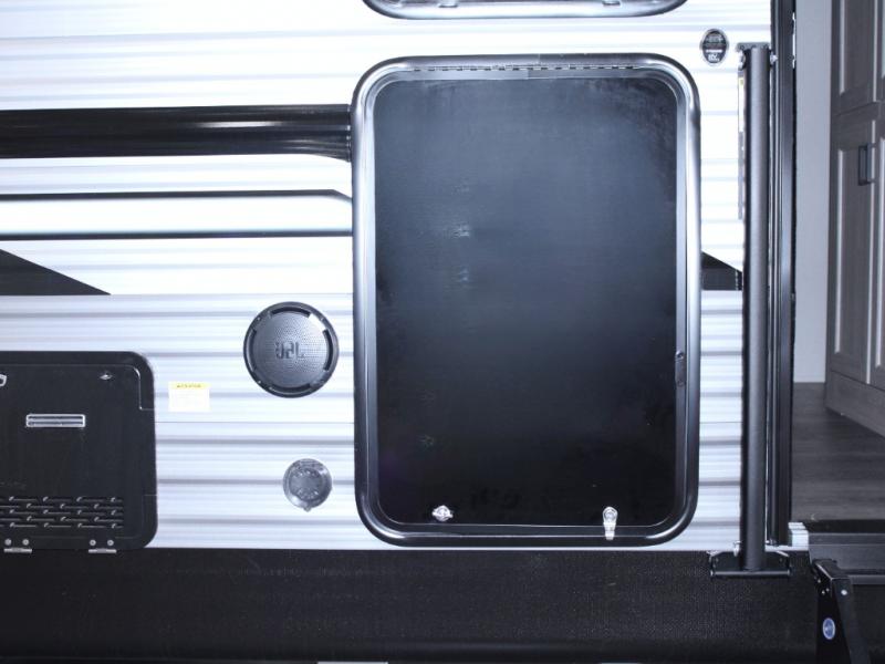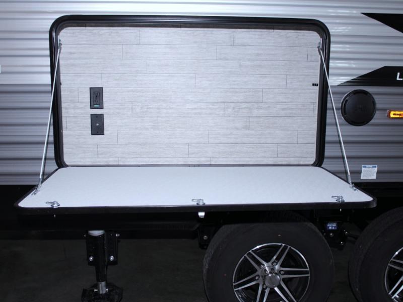 Enjoy more time outside with the 21' electric awning, complete with LED lighting for evening hangouts. The exterior camper kitchen includes a griddle and mini fridge—ideal for flipping pancakes or grilling burgers while staying connected to the action. Add in a TV hookup, pass-thru storage, and a fold-down table, and you’ve got a fully functional outdoor entertainment zone.