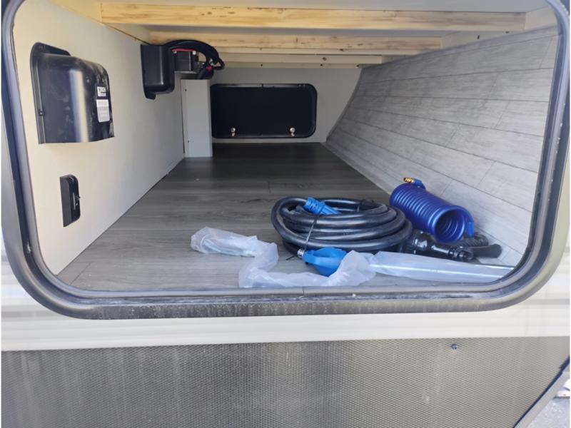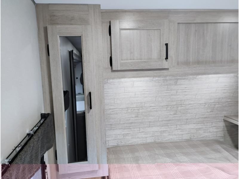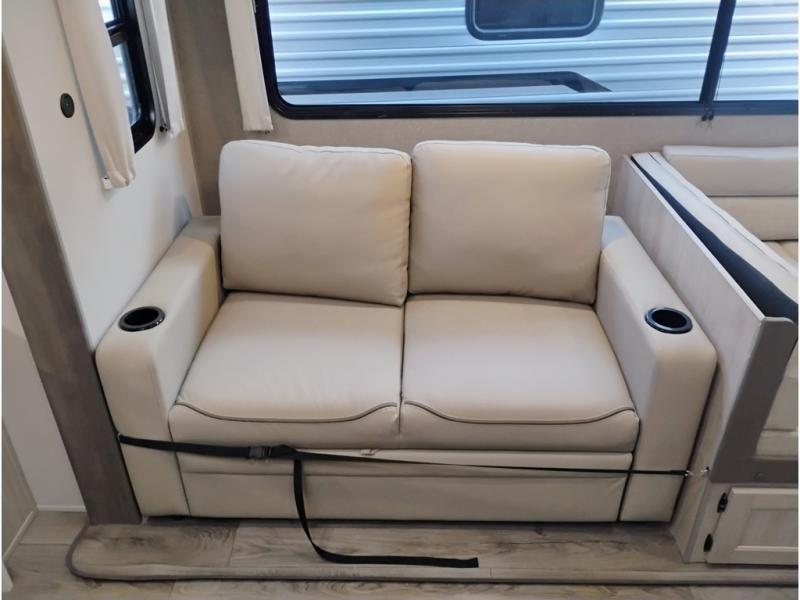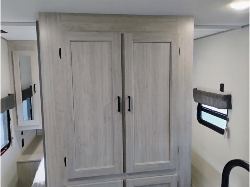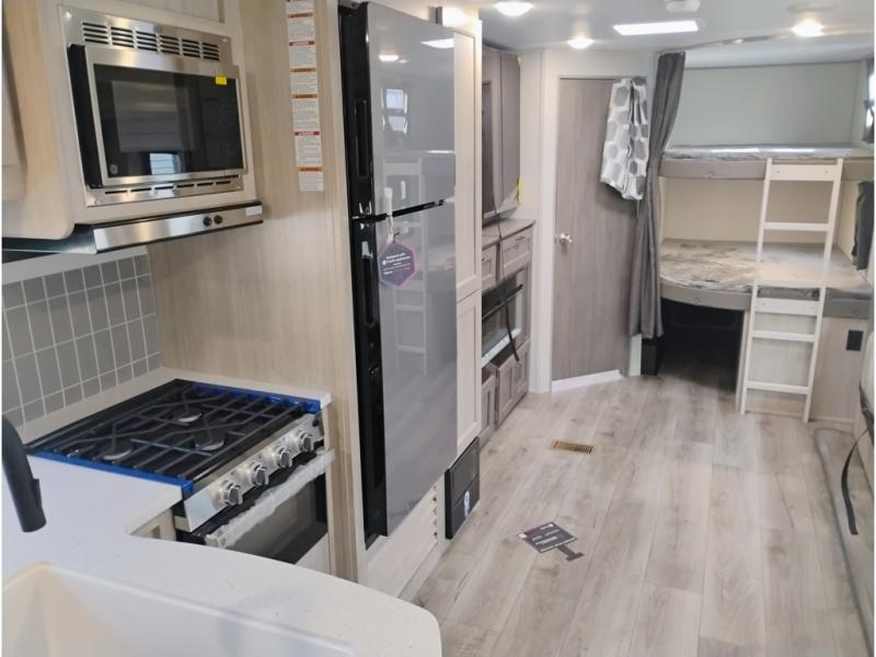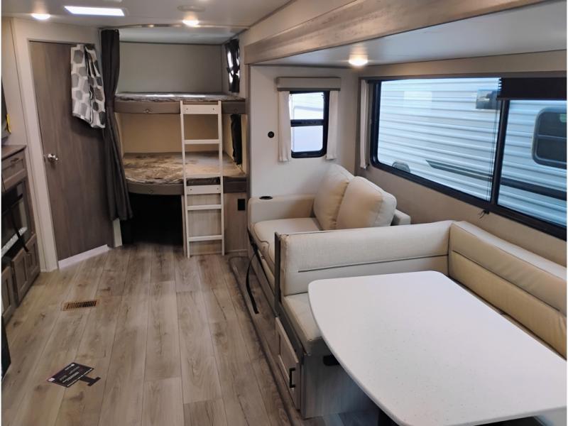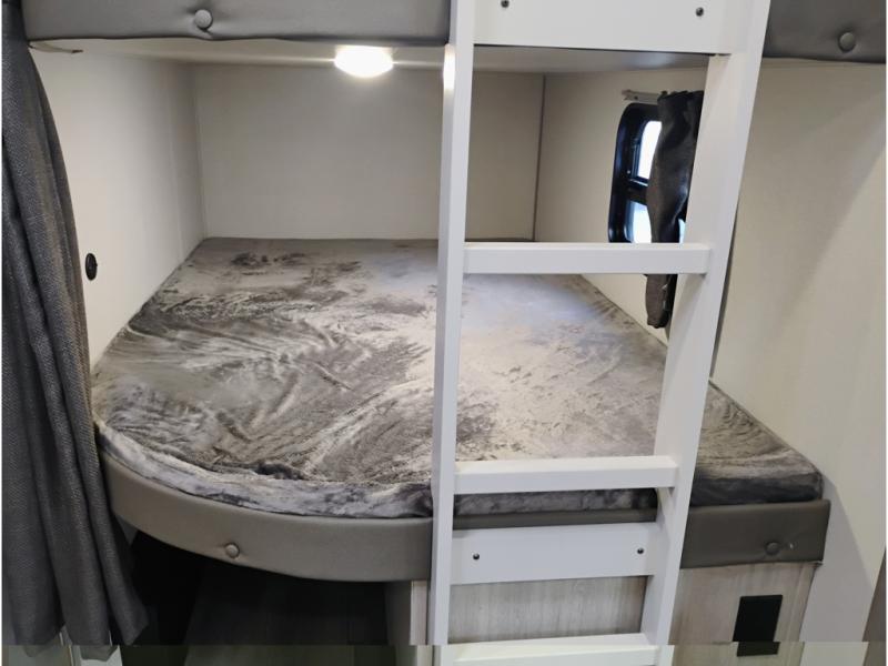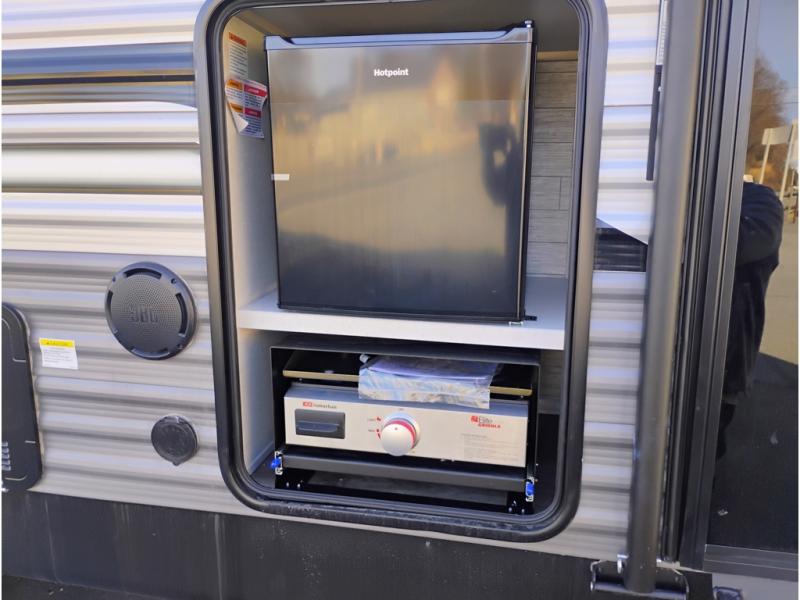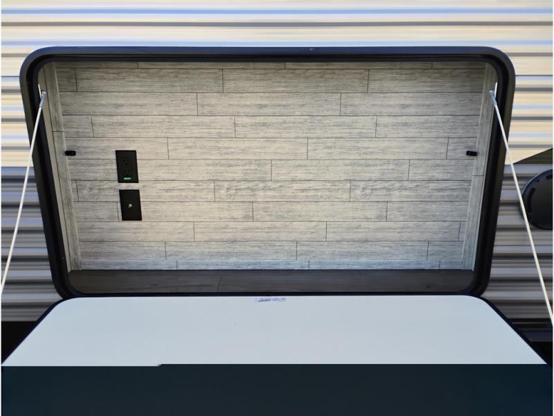This travel trailer is perfect for your whole crew! Once you arrive at the campground, you can put out the 21' electric awning and start lunch on the exterior camper kitchen with a griddle and mini fridge. There is also a pass-thru storage plus additional exterior storage with a fold-down table and a TV hookup for added convenience. And since there are dual entry doors found on this unit, you can enter in through the full bath in the back, or the main living area towards the front! A large slide provides ample space to move about, and you'll find a trundle sofa and U-shaped dinette here for cozy seating and sleeping space. Speaking of sleeping, there is a front RV queen bed in the bedroom plus double-size bunks in the back for guests!