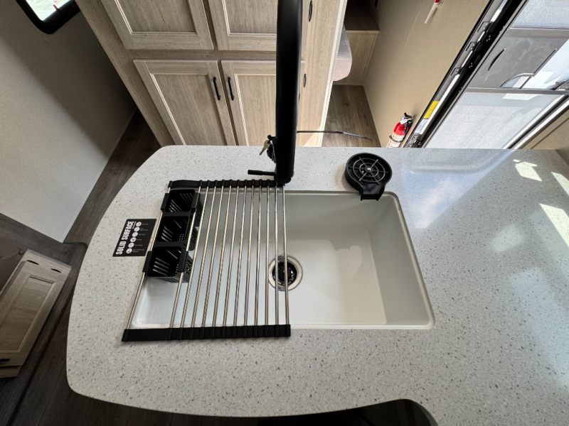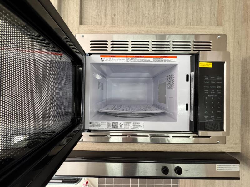 SOLID SURFACE KITCHEN COUNTERTOPS, GE 60K BTU TANKLESS WATER HEATER, STAINLESS GLASS 12V 10 CU FT REFER (GE RESIDENTIAL STYLE FRENCH DOOR 16.4 CU. FT. REFER 323MAZE ONLY), STAINLESS MICROWAVE, STAINLESS 3-BURNER GAS RANGE WITH METAL BACK-LIT KNOBS, 13,500 BTU GE A/C WITH HEAT PUMP, DEEP BASIN FARM STYLE SINK, STAINLESS STEEL DRYING RACK, GLASS RINSER, BRICK BACKSPLASH, (2) USB AND (2) 110 OUTLETS (RETAIL VALUE $2,190.00)