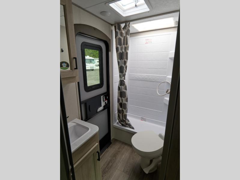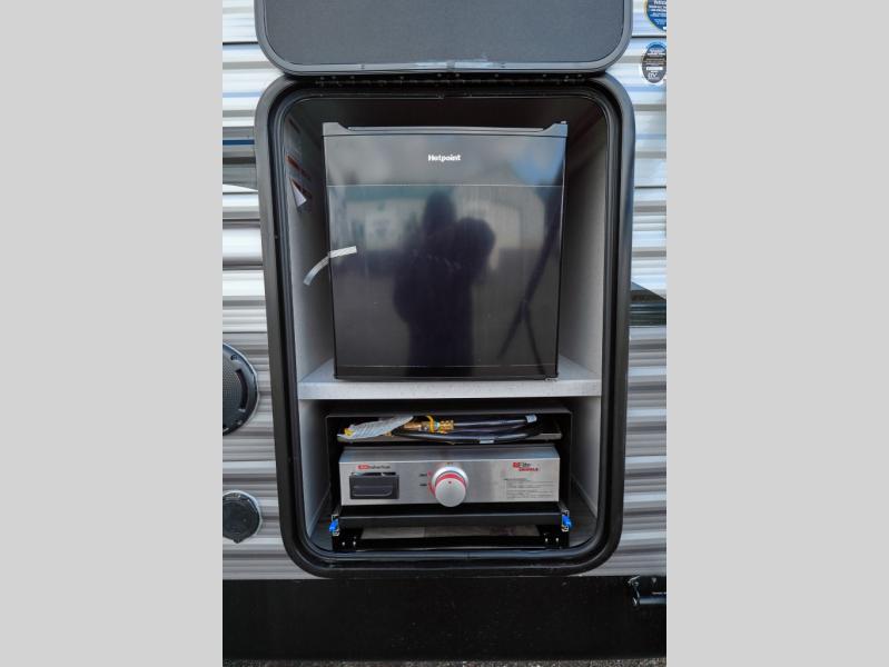 This travel trailer is perfect for your whole crew! Once you arrive at the campground, you can put out the 21' electric awning and start lunch on the exterior camper kitchen with a griddle and mini fridge. There is also a pass-thru storage plus additional exterior storage with a fold-down table and a TV hookup for added convenience. And since there are dual entry doors found on this unit, you can enter in through the full bath in the back, or the main living area towards the front! A large slide provides ample space to move about, and you'll find a trundle sofa and U-shaped dinette here for cozy seating and sleeping space. Speaking of sleeping, there is a front RV queen bed in the bedroom plus double-size bunks in the back for guests!