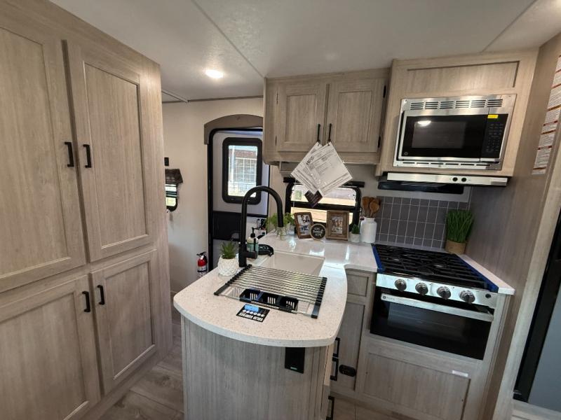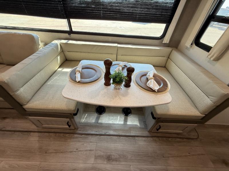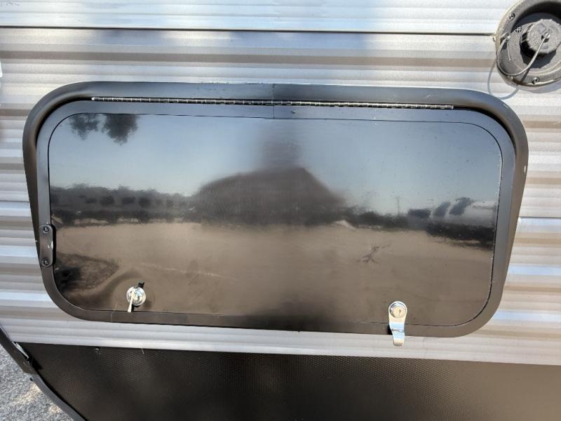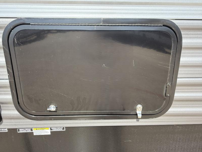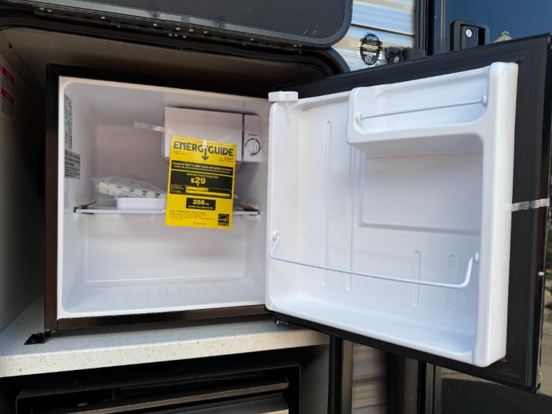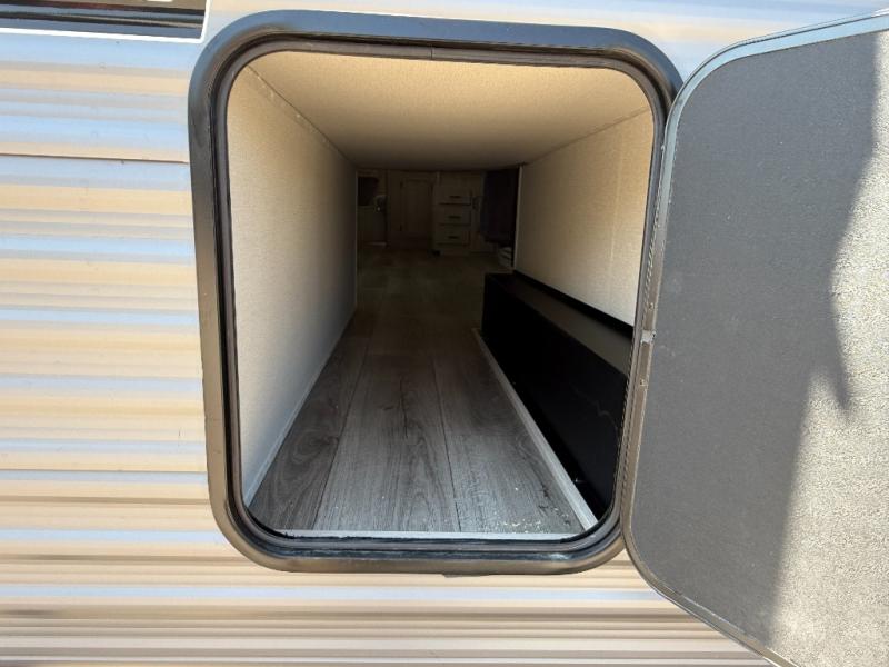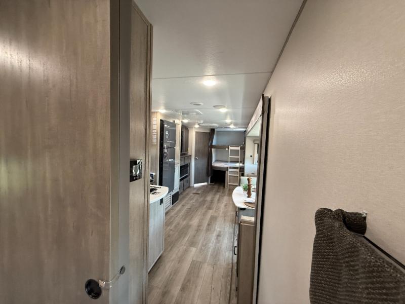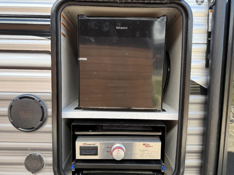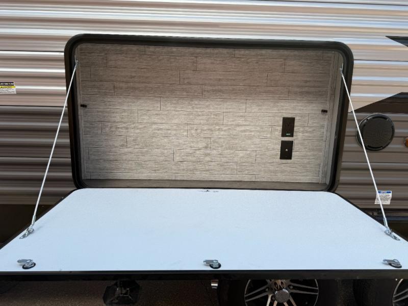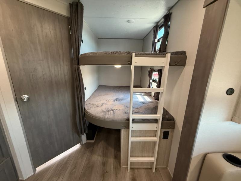 This travel trailer is perfect for your whole crew! Once you arrive at the campground, you can put out the 21' electric awning and start lunch on the exterior camper kitchen with a griddle and mini fridge. There is also a pass-thru storage plus additional exterior storage with a fold-down table and a TV hookup for added convenience. And since there are dual entry doors found on this unit, you can enter in through the full bath in the back, or the main living area towards the front! A large slide provides ample space to move about, and you'll find a trundle sofa and U-shaped dinette here for cozy seating and sleeping space. Speaking of sleeping, there is a front RV queen bed in the bedroom plus double-size bunks in the back for guests!