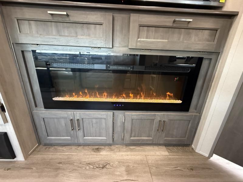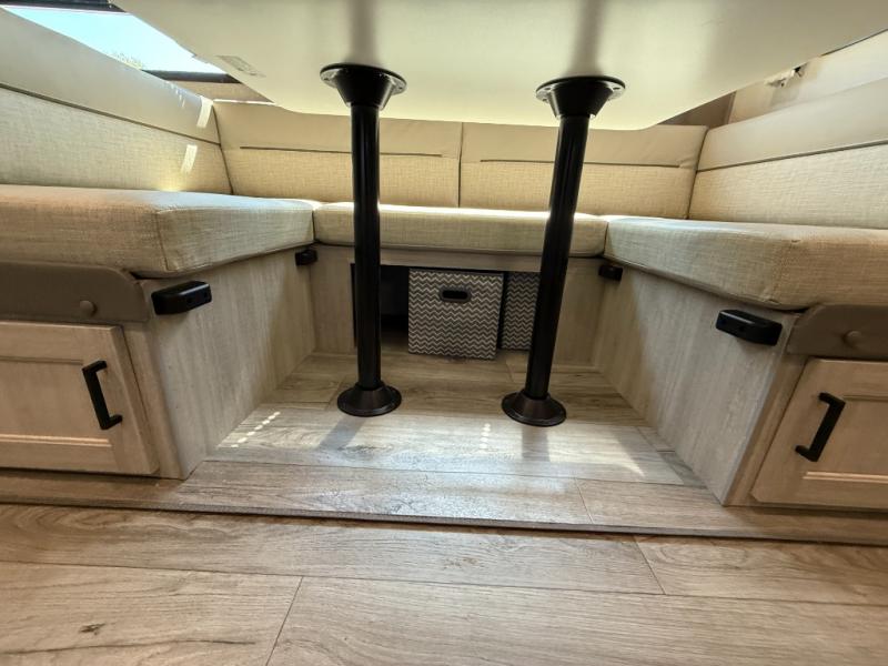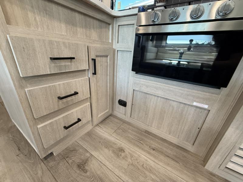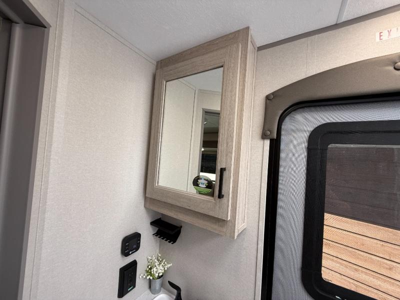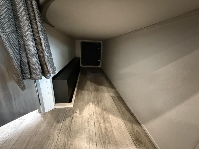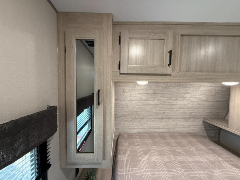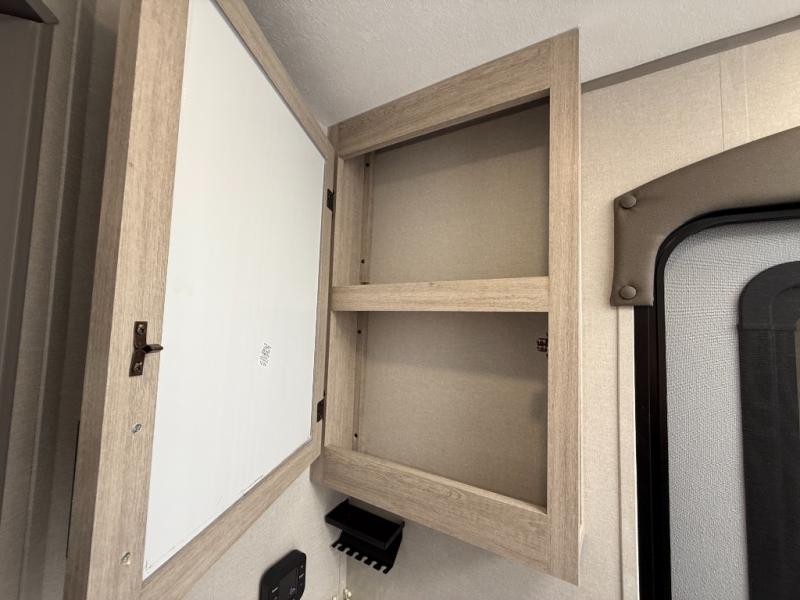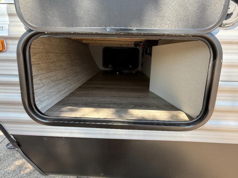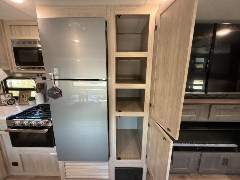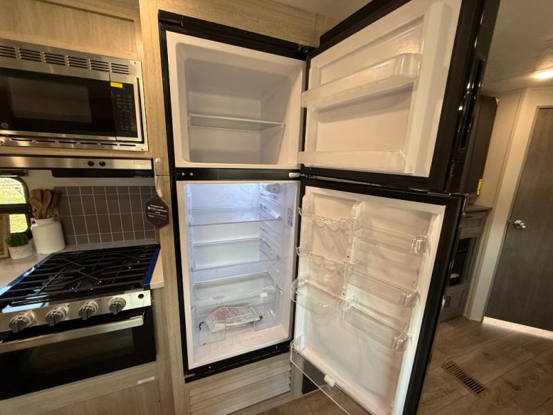 This travel trailer is perfect for your whole crew! Once you arrive at the campground, you can put out the 21' electric awning and start lunch on the exterior camper kitchen with a griddle and mini fridge. There is also a pass-thru storage plus additional exterior storage with a fold-down table and a TV hookup for added convenience. And since there are dual entry doors found on this unit, you can enter in through the full bath in the back, or the main living area towards the front! A large slide provides ample space to move about, and you'll find a trundle sofa and U-shaped dinette here for cozy seating and sleeping space. Speaking of sleeping, there is a front RV queen bed in the bedroom plus double-size bunks in the back for guests!