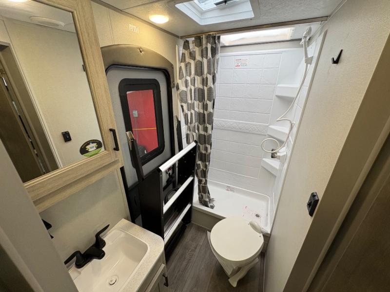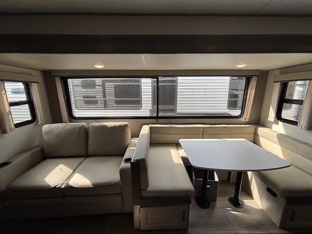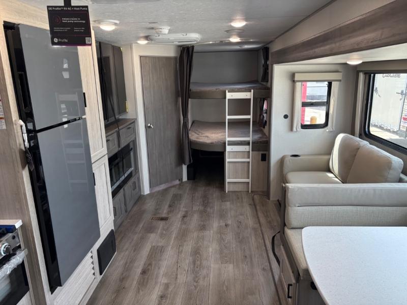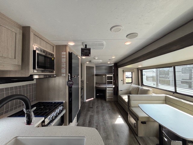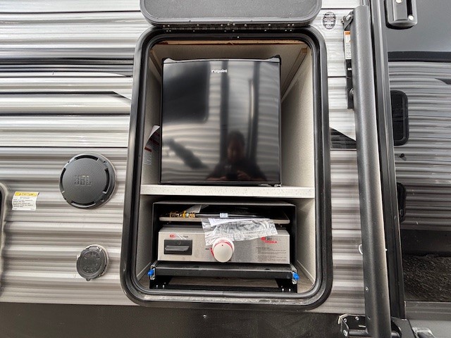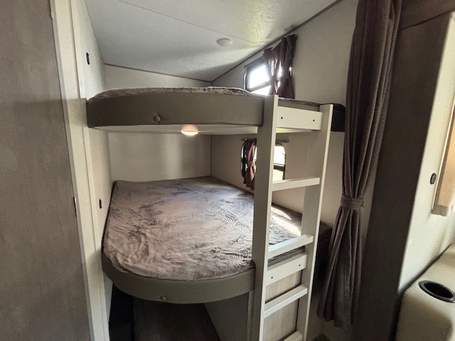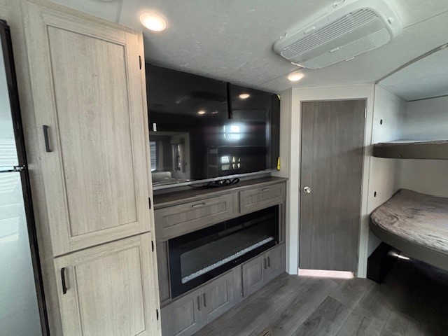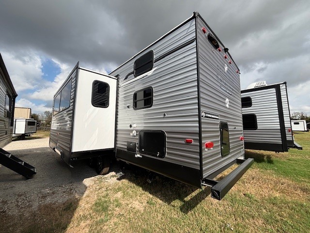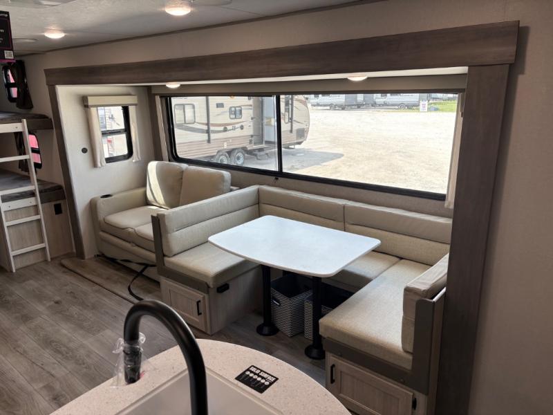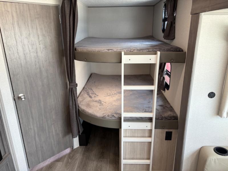This travel trailer is perfect for your whole crew! Once you arrive at the campground, you can put out the 21' electric awning and start lunch on the exterior camper kitchen with a griddle and mini fridge. There is also a pass-thru storage plus additional exterior storage with a fold-down table and a TV hookup for added convenience. And since there are dual entry doors found on this unit, you can enter in through the full bath in the back, or the main living area towards the front! A large slide provides ample space to move about, and you'll find a trundle sofa and U-shaped dinette here for cozy seating and sleeping space. Speaking of sleeping, there is a front RV queen bed in the bedroom plus double-size bunks in the back for guests!