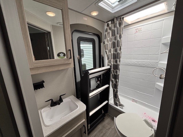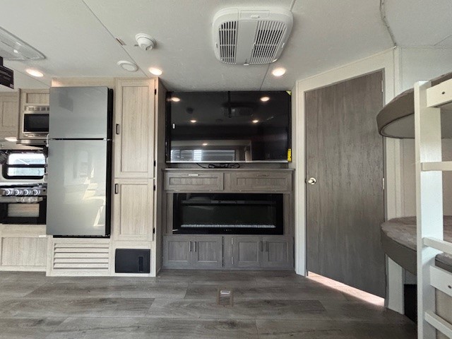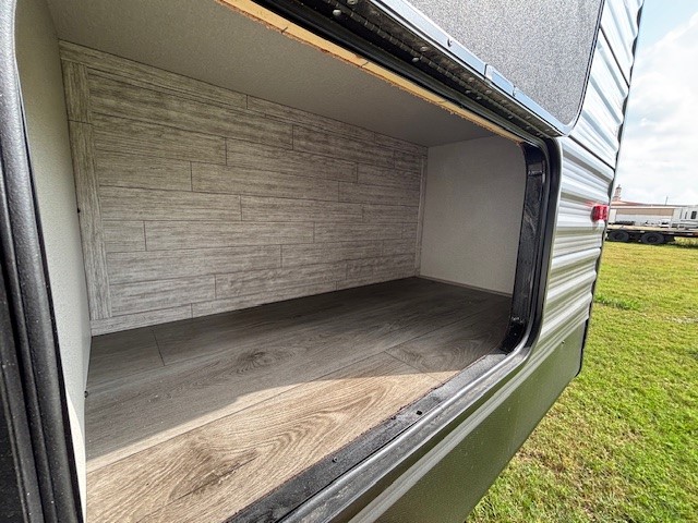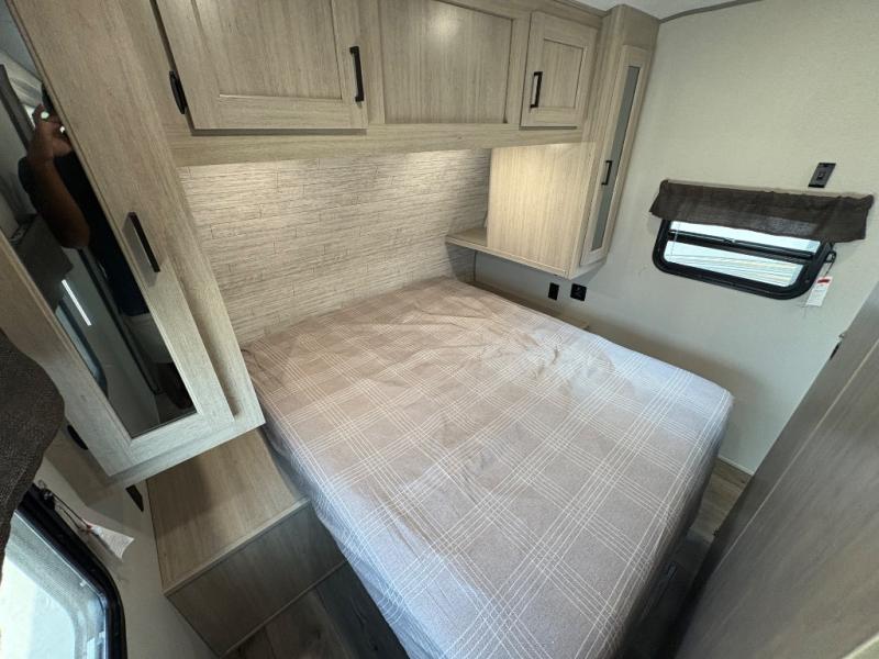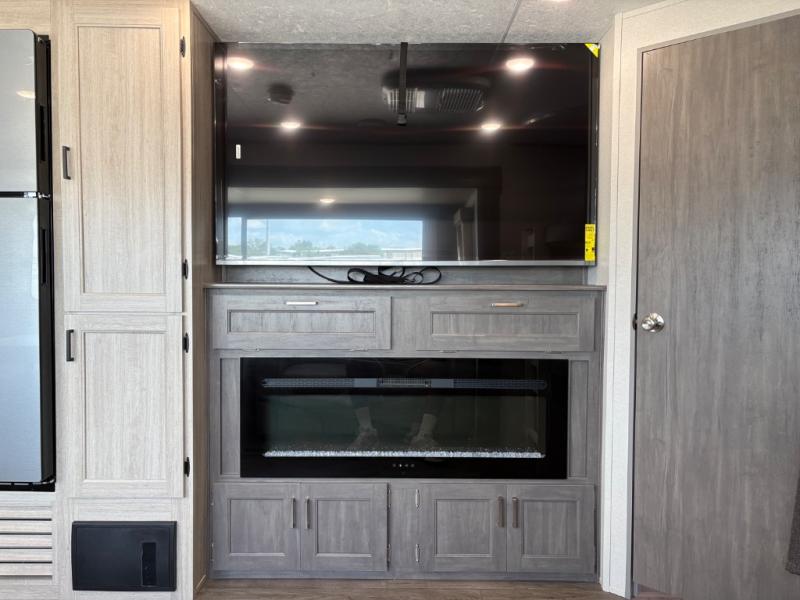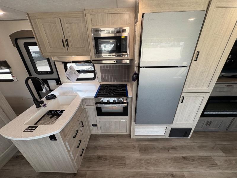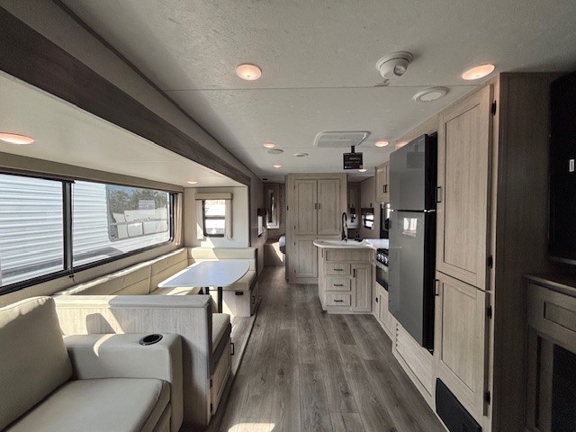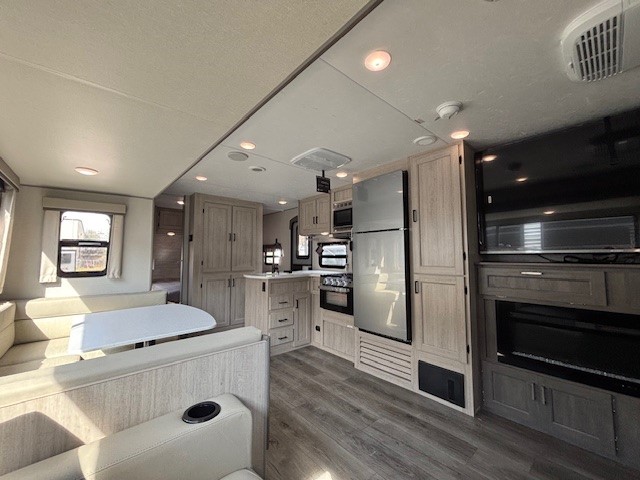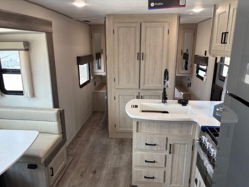 This travel trailer is perfect for your whole crew! Once you arrive at the campground, you can put out the 21' electric awning and start lunch on the exterior camper kitchen with a griddle and mini fridge. There is also a pass-thru storage plus additional exterior storage with a fold-down table and a TV hookup for added convenience. And since there are dual entry doors found on this unit, you can enter in through the full bath in the back, or the main living area towards the front! A large slide provides ample space to move about, and you'll find a trundle sofa and U-shaped dinette here for cozy seating and sleeping space. Speaking of sleeping, there is a front RV queen bed in the bedroom plus double-size bunks in the back for guests!