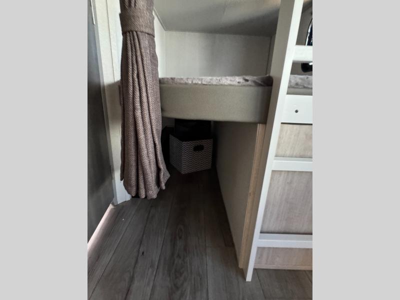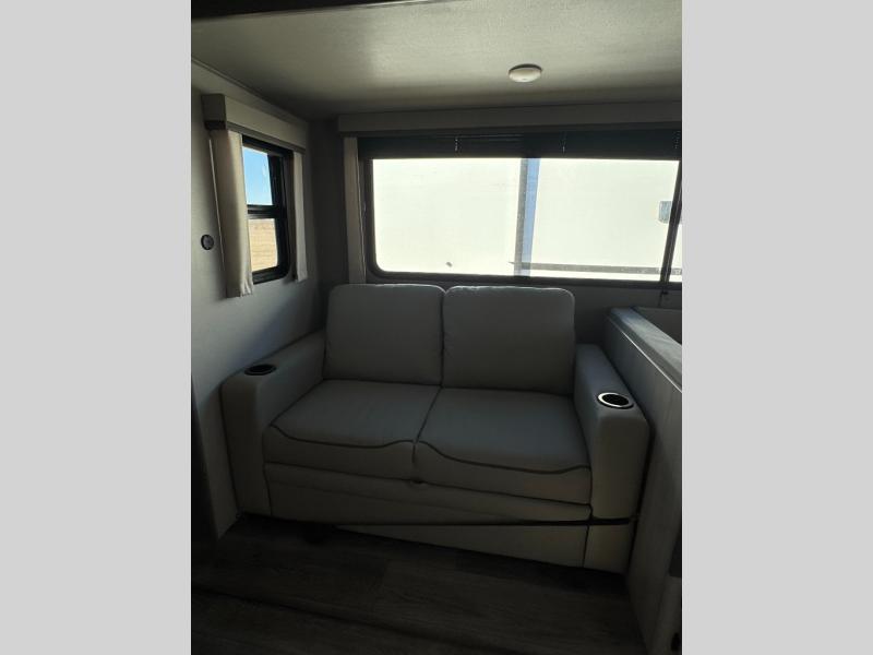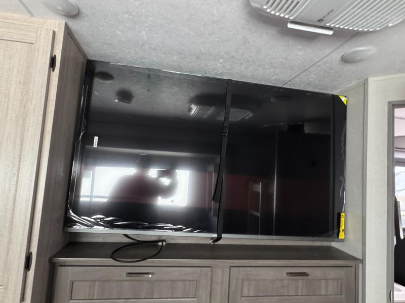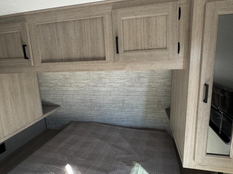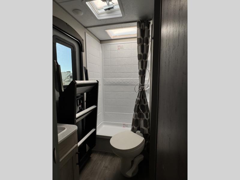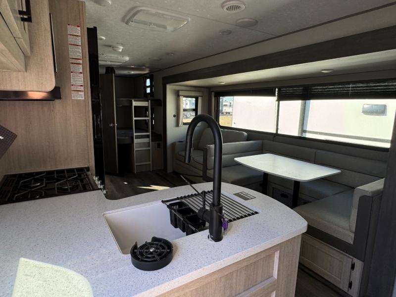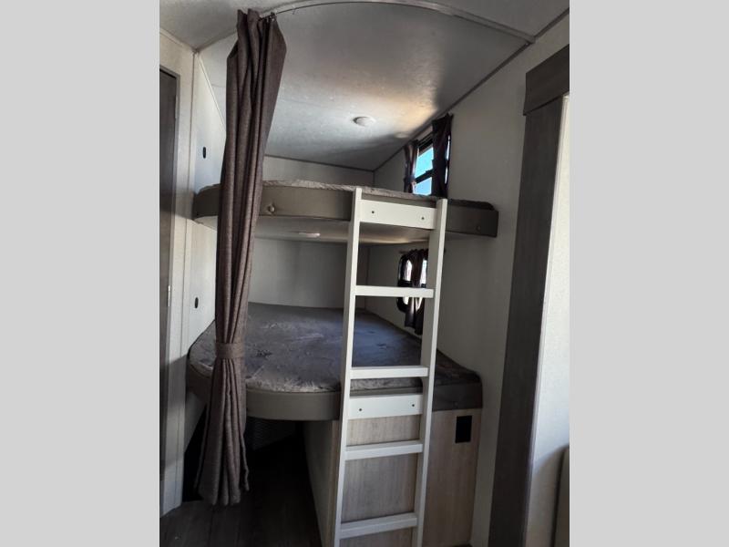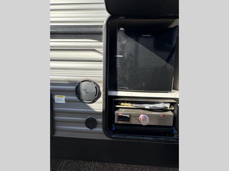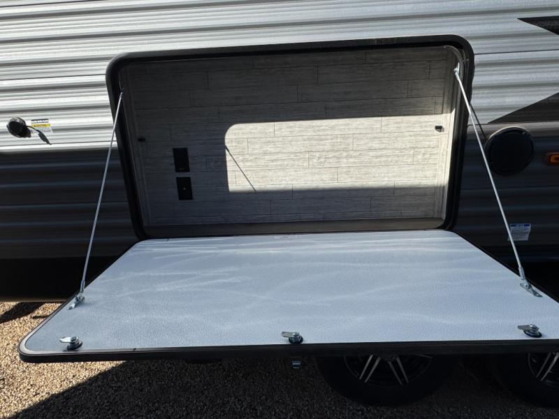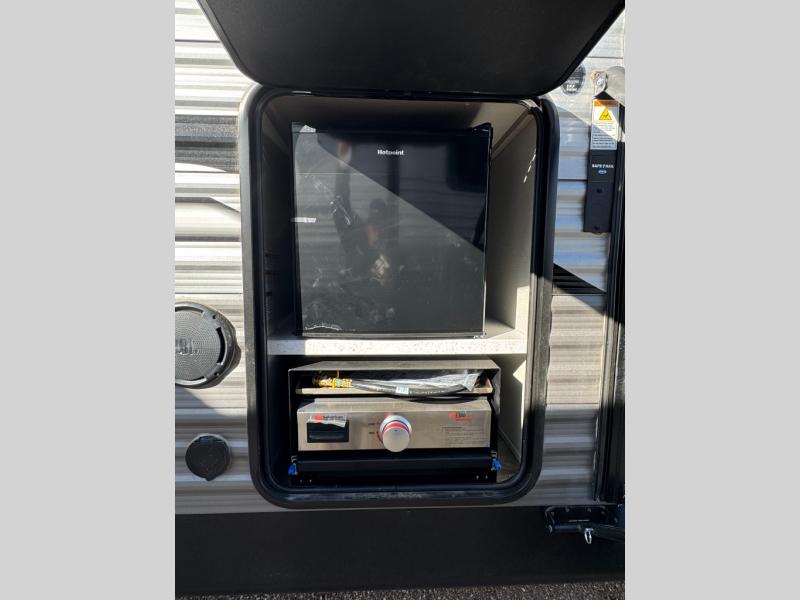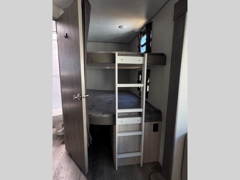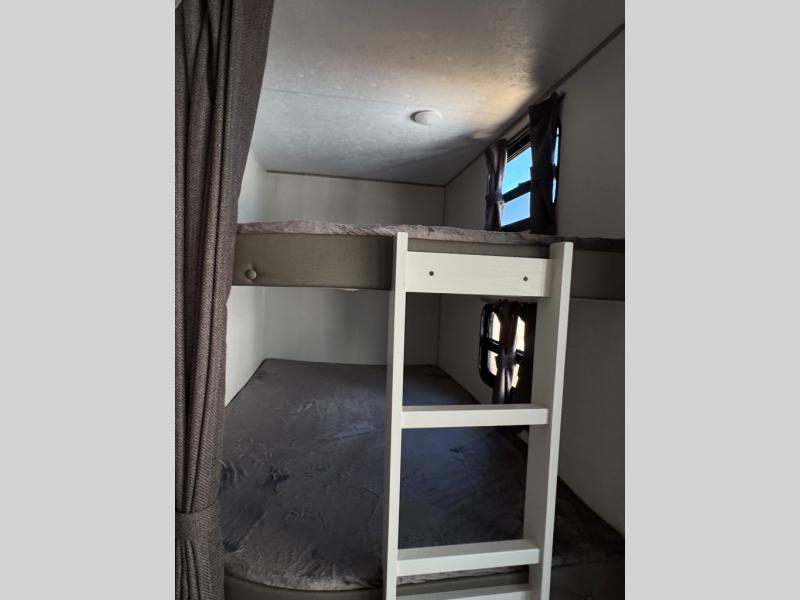 This travel trailer is perfect for your whole crew! Once you arrive at the campground, you can put out the 21' electric awning and start lunch on the exterior camper kitchen with a griddle and mini fridge. There is also a pass-thru storage plus additional exterior storage with a fold-down table and a TV hookup for added convenience. And since there are dual entry doors found on this unit, you can enter in through the full bath in the back, or the main living area towards the front! A large slide provides ample space to move about, and you'll find a trundle sofa and U-shaped dinette here for cozy seating and sleeping space. Speaking of sleeping, there is a front RV queen bed in the bedroom plus double-size bunks in the back for guests!