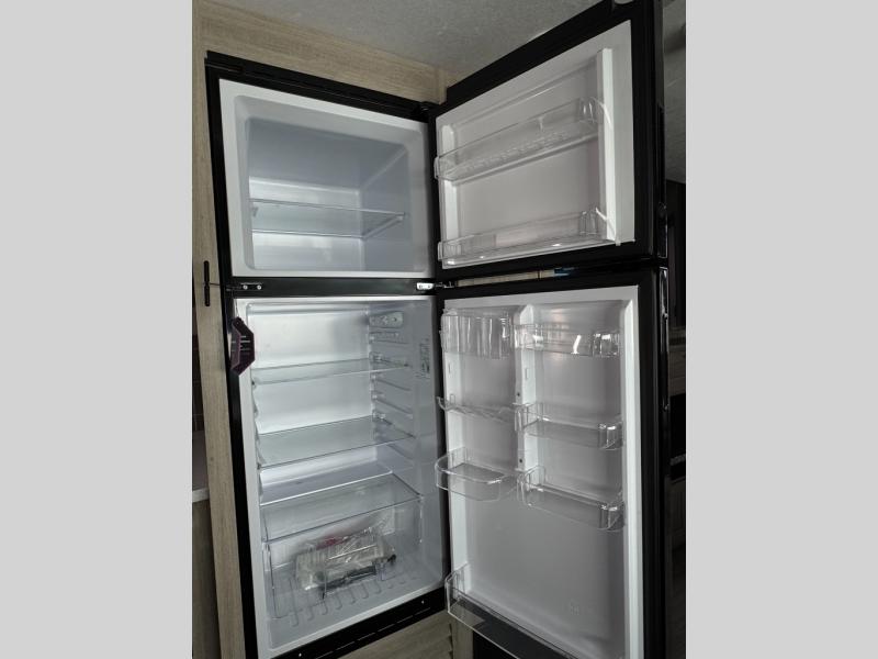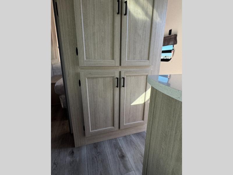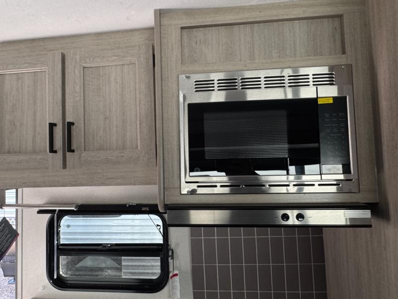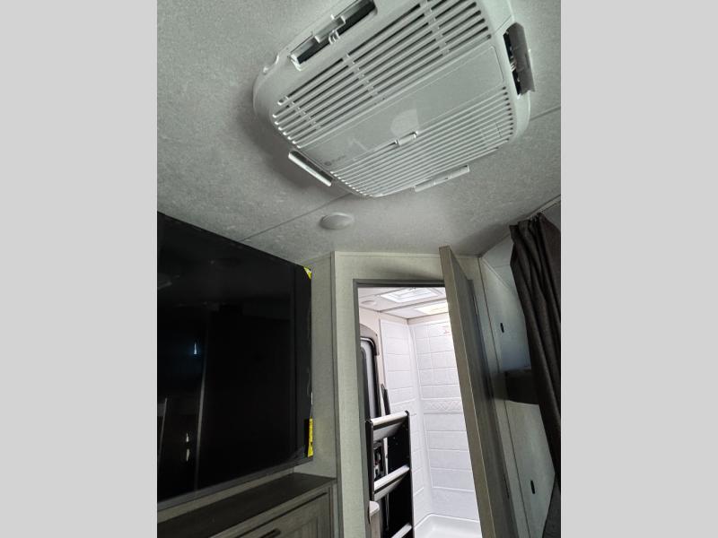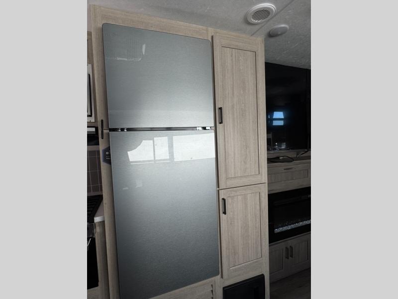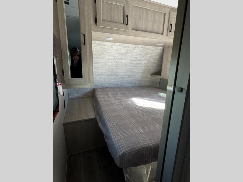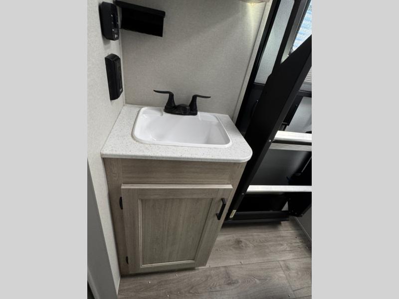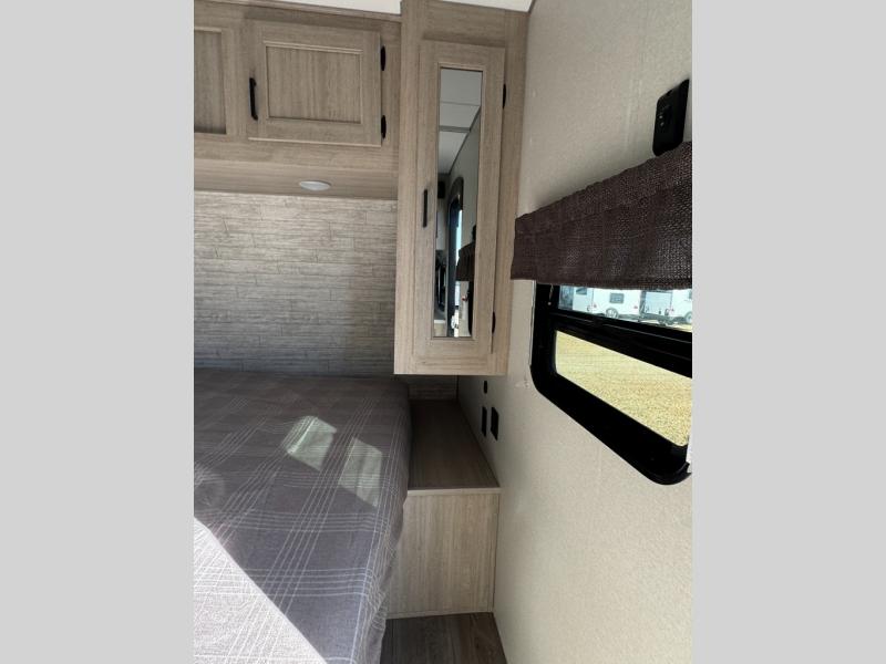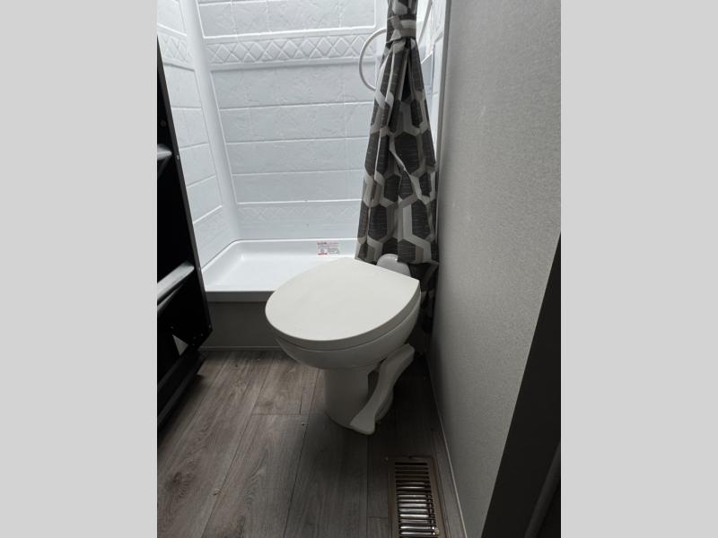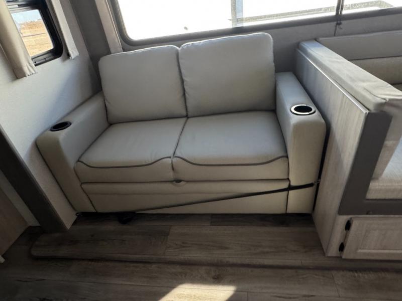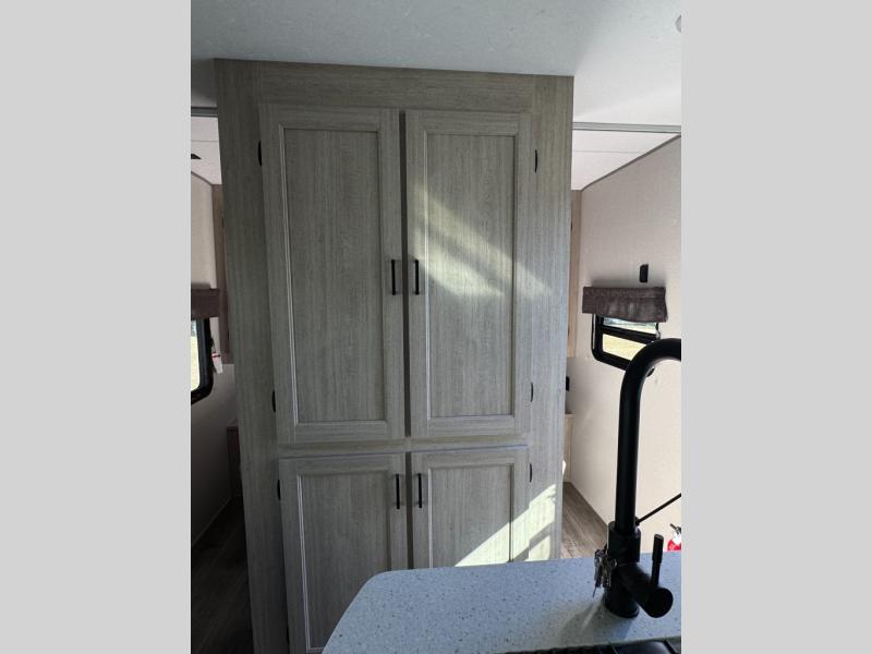 This travel trailer is perfect for your whole crew! Once you arrive at the campground, you can put out the 21' electric awning and start lunch on the exterior camper kitchen with a griddle and mini fridge. There is also a pass-thru storage plus additional exterior storage with a fold-down table and a TV hookup for added convenience. And since there are dual entry doors found on this unit, you can enter in through the full bath in the back, or the main living area towards the front! A large slide provides ample space to move about, and you'll find a trundle sofa and U-shaped dinette here for cozy seating and sleeping space. Speaking of sleeping, there is a front RV queen bed in the bedroom plus double-size bunks in the back for guests!