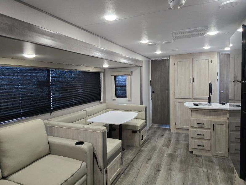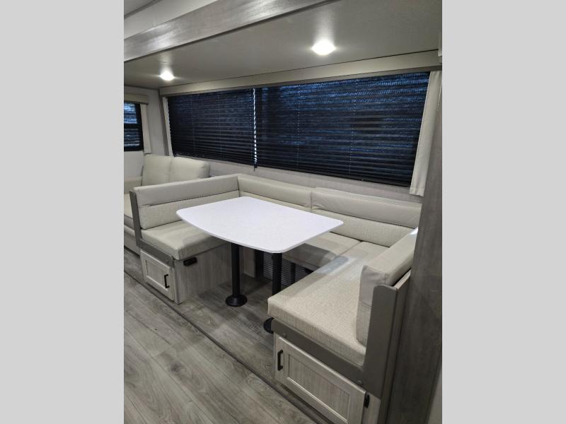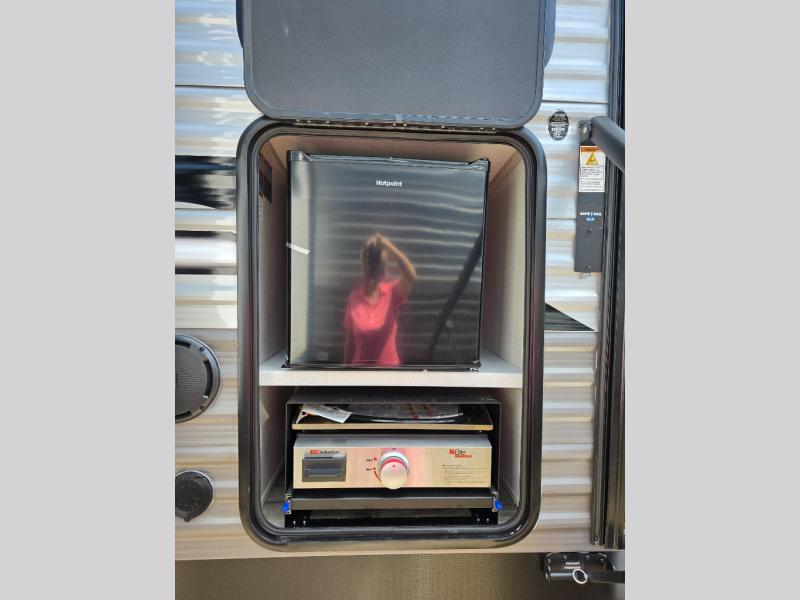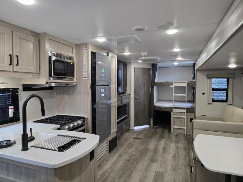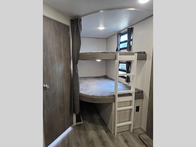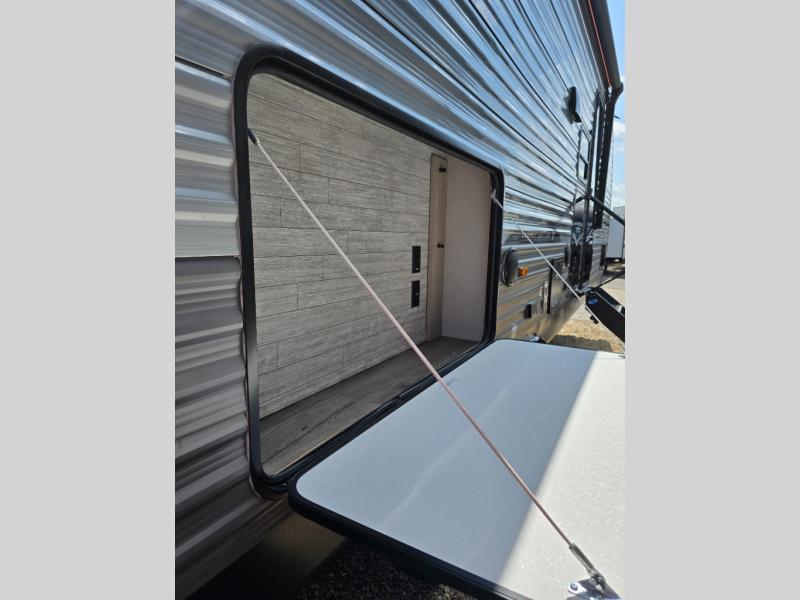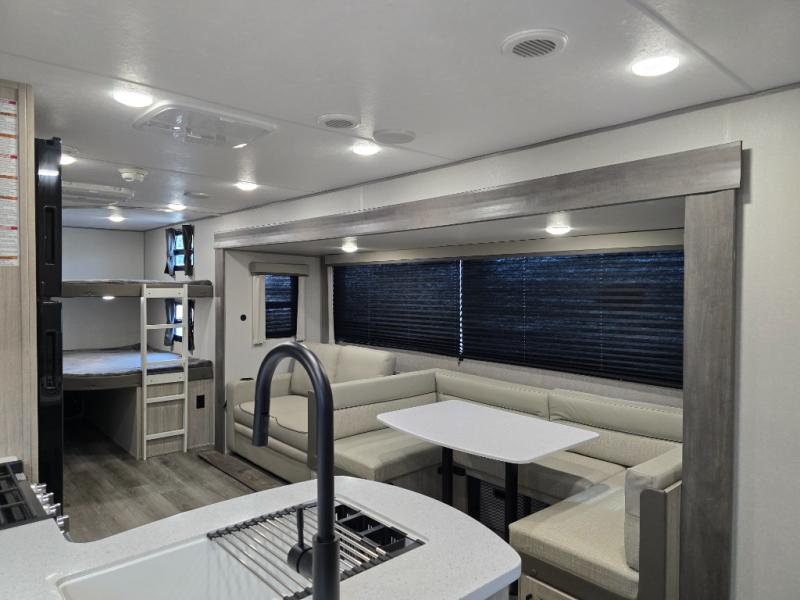 This travel trailer is perfect for your whole crew! Once you arrive at the campground, you can put out the 21' electric awning and start lunch on the exterior camper kitchen with a griddle and mini fridge. There is also a pass-thru storage plus additional exterior storage with a fold-down table and a TV hookup for added convenience. And since there are dual entry doors found on this unit, you can enter in through the full bath in the back, or the main living area towards the front! A large slide provides ample space to move about, and you'll find a trundle sofa and U-shaped dinette here for cozy seating and sleeping space. Speaking of sleeping, there is a front RV queen bed in the bedroom plus double-size bunks in the back for guests!