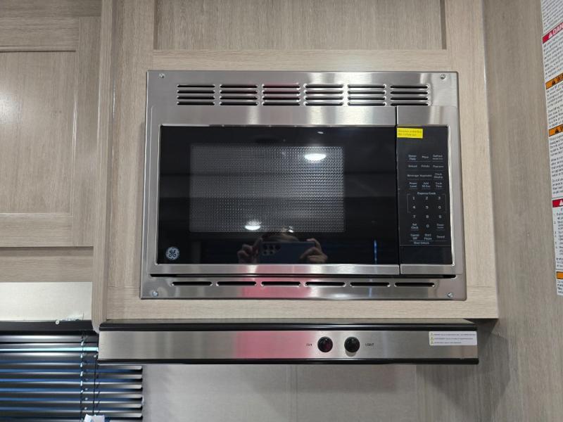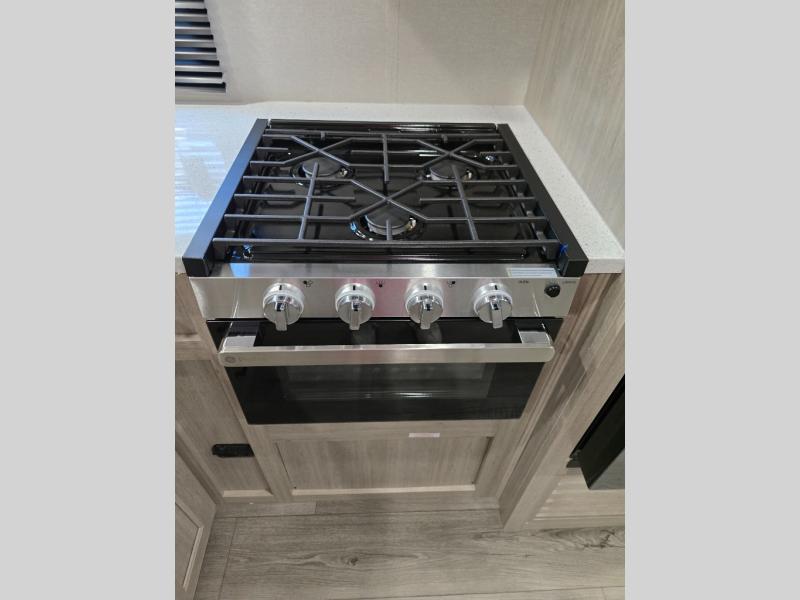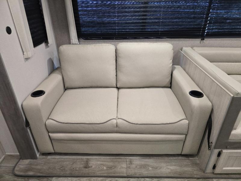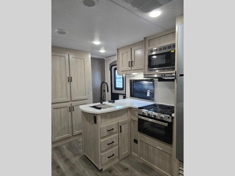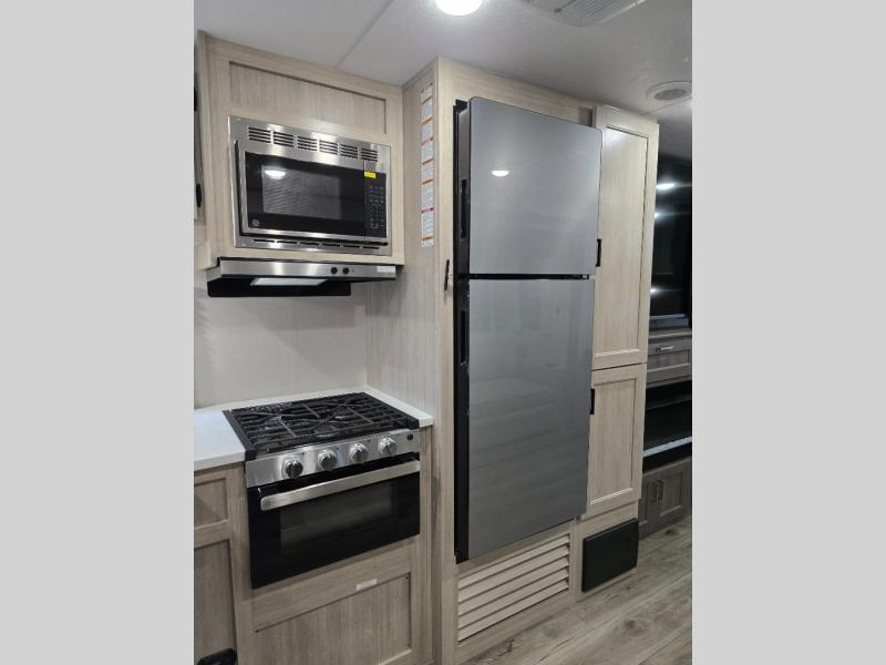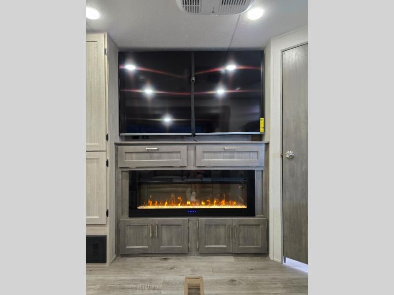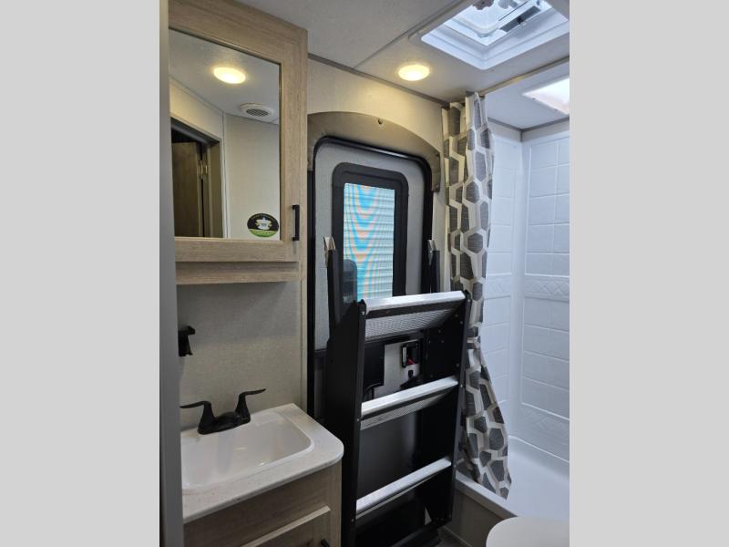 This travel trailer is perfect for your whole crew! Once you arrive at the campground, you can put out the 21' electric awning and start lunch on the exterior camper kitchen with a griddle and mini fridge. There is also a pass-thru storage plus additional exterior storage with a fold-down table and a TV hookup for added convenience. And since there are dual entry doors found on this unit, you can enter in through the full bath in the back, or the main living area towards the front! A large slide provides ample space to move about, and you'll find a trundle sofa and U-shaped dinette here for cozy seating and sleeping space. Speaking of sleeping, there is a front RV queen bed in the bedroom plus double-size bunks in the back for guests!