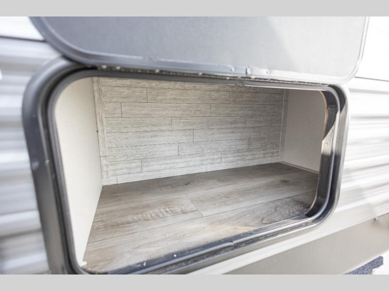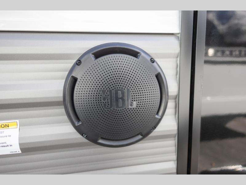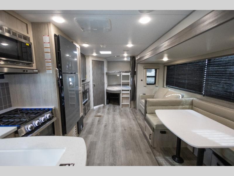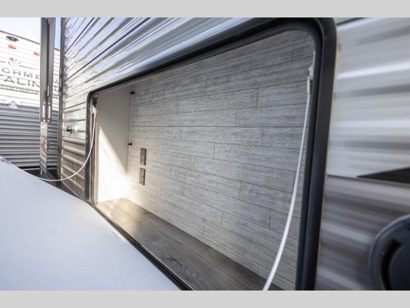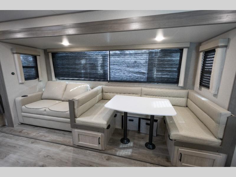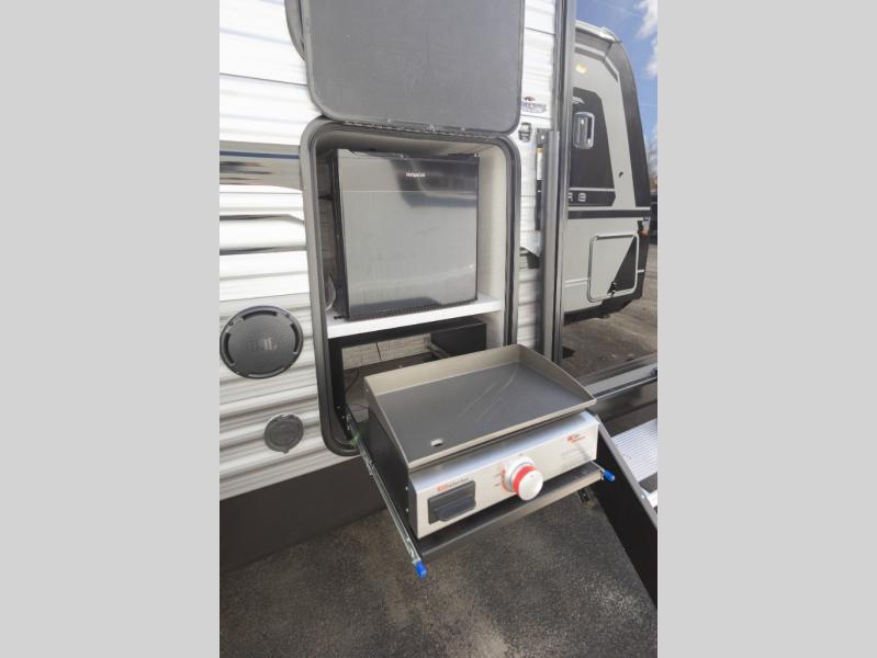 This travel trailer is perfect for your whole crew! Once you arrive at the campground, you can put out the 21' electric awning and start lunch on the exterior camper kitchen with a griddle and mini fridge. There is also a pass-thru storage plus additional exterior storage with a fold-down table and a TV hookup for added convenience. And since there are dual entry doors found on this unit, you can enter in through the full bath in the back, or the main living area towards the front! A large slide provides ample space to move about, and you'll find a trundle sofa and U-shaped dinette here for cozy seating and sleeping space. Speaking of sleeping, there is a front RV queen bed in the bedroom plus double-size bunks in the back for guests!