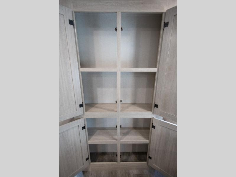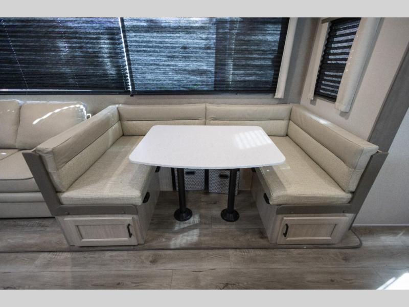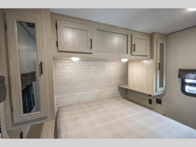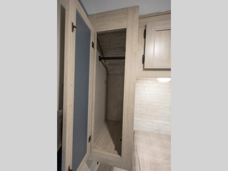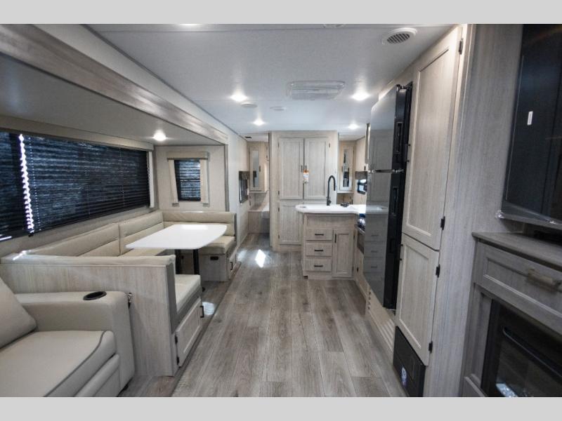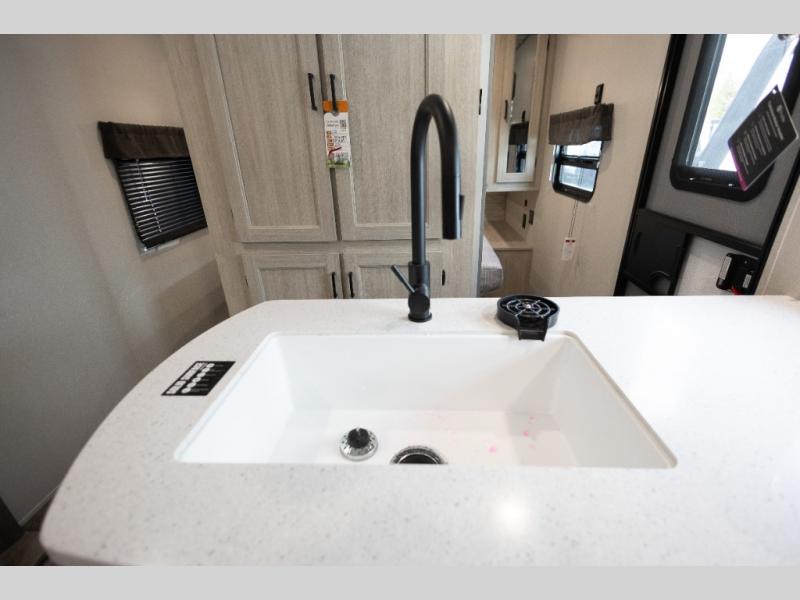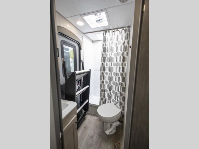 This travel trailer is perfect for your whole crew! Once you arrive at the campground, you can put out the 21' electric awning and start lunch on the exterior camper kitchen with a griddle and mini fridge. There is also a pass-thru storage plus additional exterior storage with a fold-down table and a TV hookup for added convenience. And since there are dual entry doors found on this unit, you can enter in through the full bath in the back, or the main living area towards the front! A large slide provides ample space to move about, and you'll find a trundle sofa and U-shaped dinette here for cozy seating and sleeping space. Speaking of sleeping, there is a front RV queen bed in the bedroom plus double-size bunks in the back for guests!