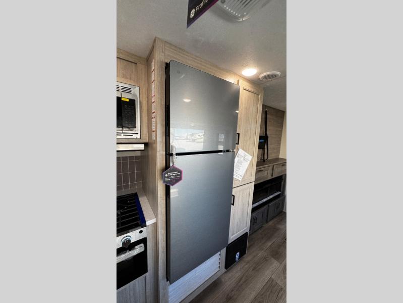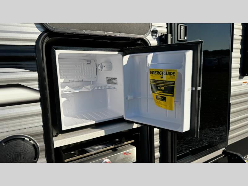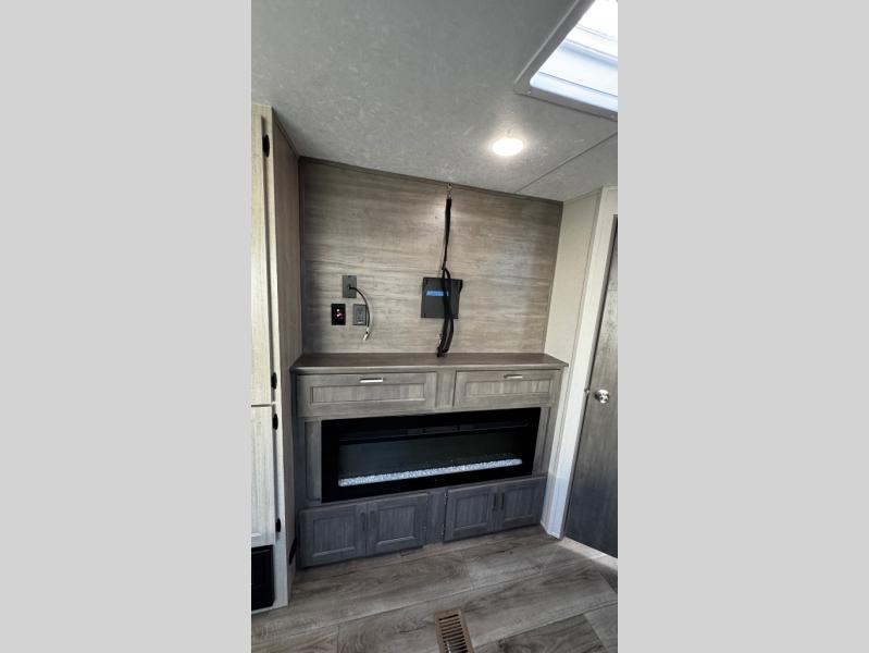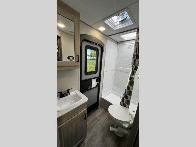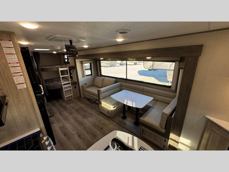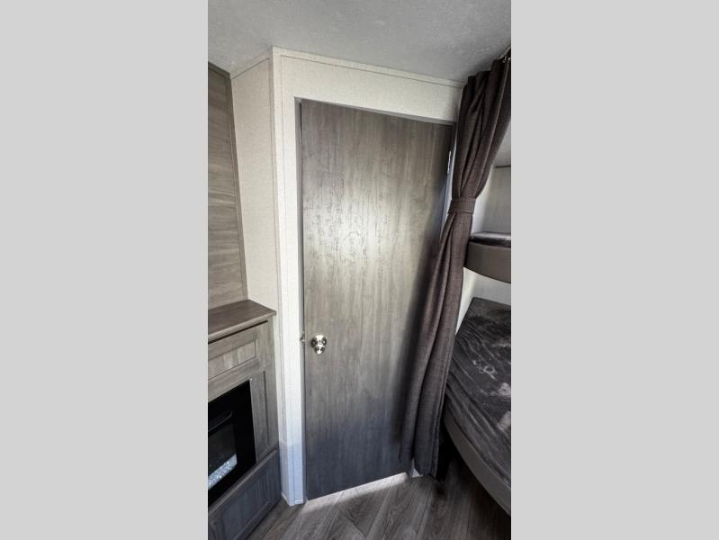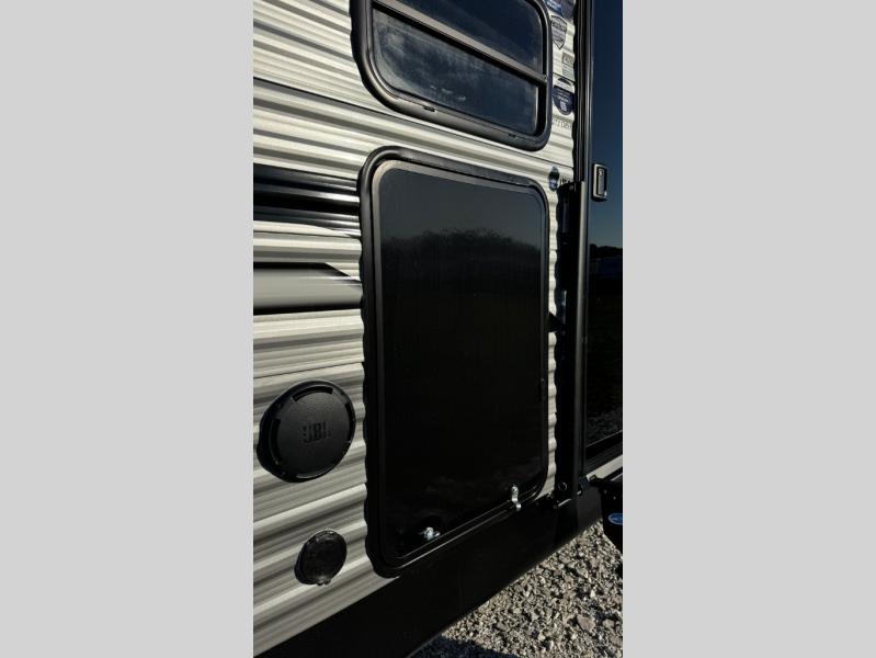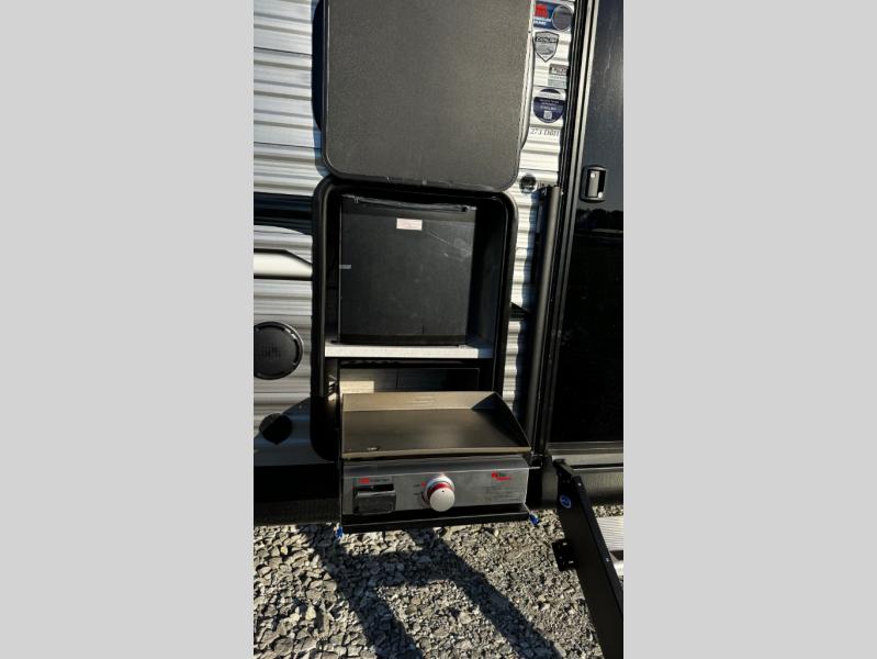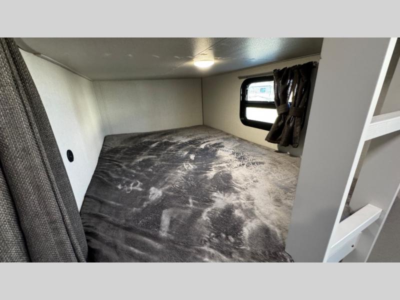 This travel trailer is perfect for your whole crew! Once you arrive at the campground, you can put out the 21' electric awning and start lunch on the exterior camper kitchen with a griddle and mini fridge. There is also a pass-thru storage plus additional exterior storage with a fold-down table and a TV hookup for added convenience. And since there are dual entry doors found on this unit, you can enter in through the full bath in the back, or the main living area towards the front! A large slide provides ample space to move about, and you'll find a trundle sofa and U-shaped dinette here for cozy seating and sleeping space. Speaking of sleeping, there is a front RV queen bed in the bedroom plus double-size bunks in the back for guests!