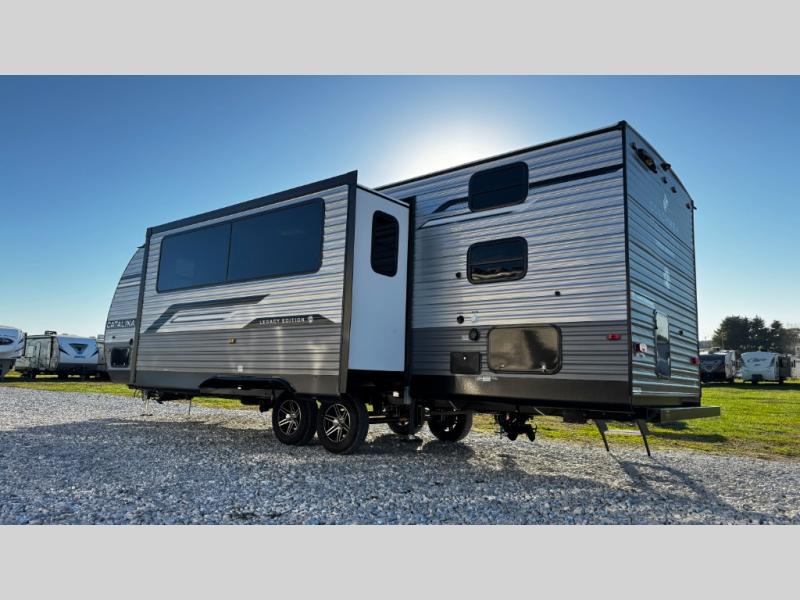 Each Catalina Legacy travel trailer by Coachmen is constructed with a cambered structural steel I-beam frame for added strength and support, plus an enclosed and fully sealed corrugated underbelly to extend your camping season. There is also a seamless Alpha roof membrane, R-7 insulation throughout, full length frame outriggers, plus many more durable construction materials. You will love the 6' 9" interior height, along with Congoleum woodplank linoleum flooring, solid surface kitchen countertops, and hard valance window treatments. Choose a Catalina Legacy today!