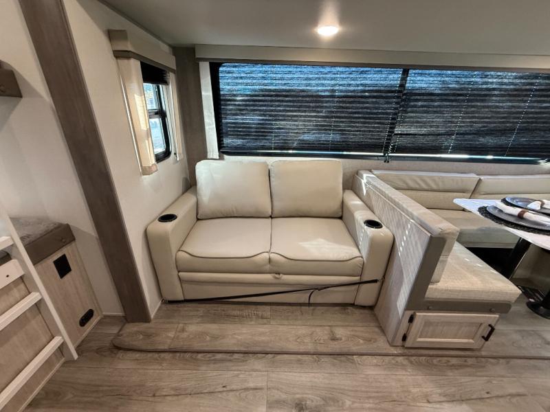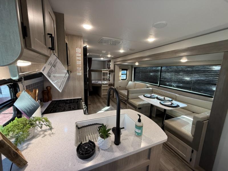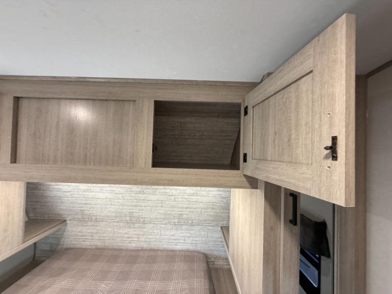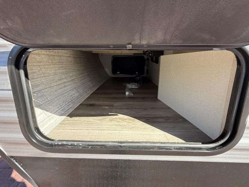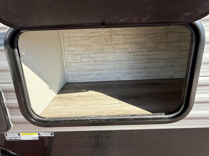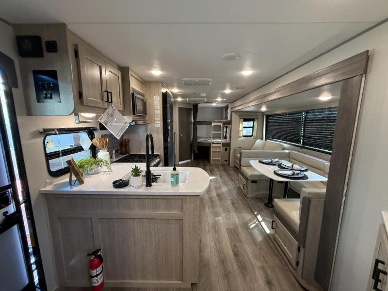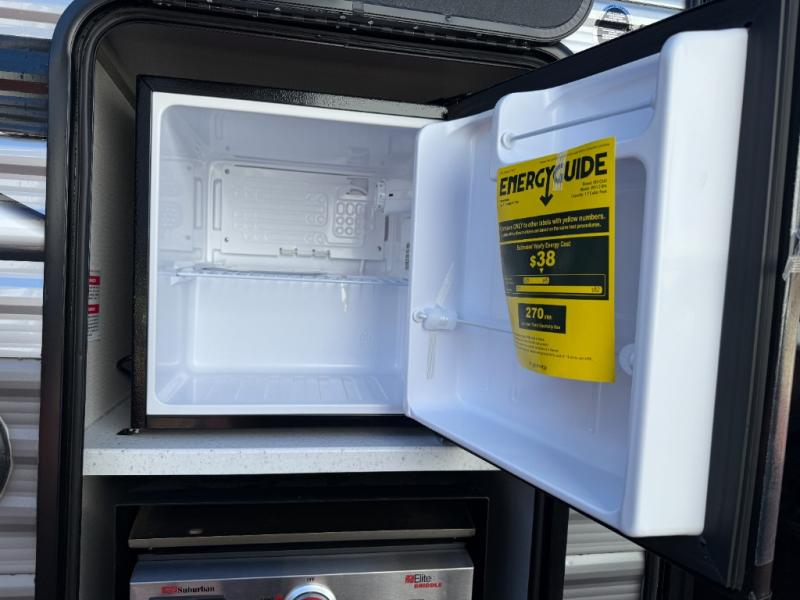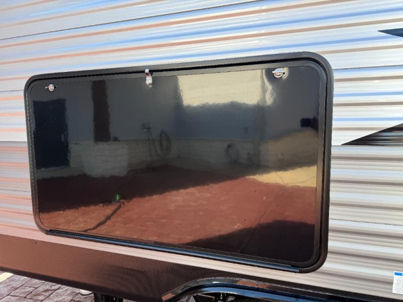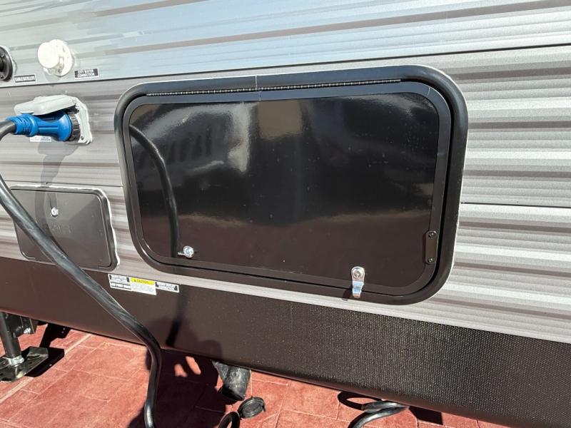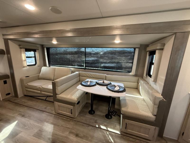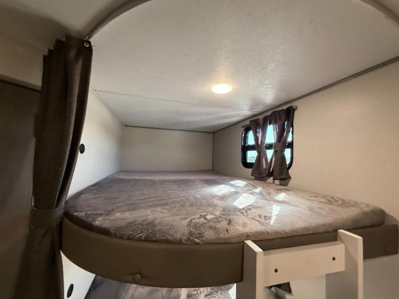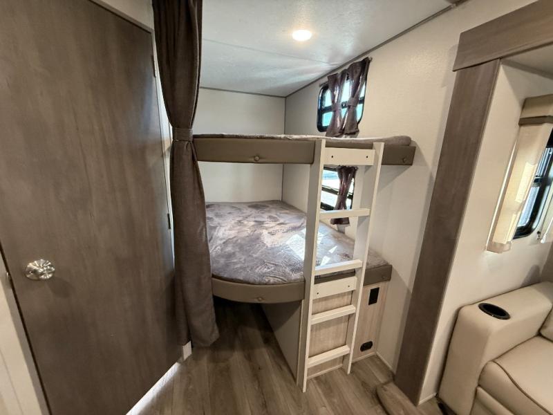 This travel trailer is perfect for your whole crew! Once you arrive at the campground, you can put out the 21' electric awning and start lunch on the exterior camper kitchen with a griddle and mini fridge. There is also a pass-thru storage plus additional exterior storage with a fold-down table and a TV hookup for added convenience. And since there are dual entry doors found on this unit, you can enter in through the full bath in the back, or the main living area towards the front! A large slide provides ample space to move about, and you'll find a trundle sofa and U-shaped dinette here for cozy seating and sleeping space. Speaking of sleeping, there is a front RV queen bed in the bedroom plus double-size bunks in the back for guests!