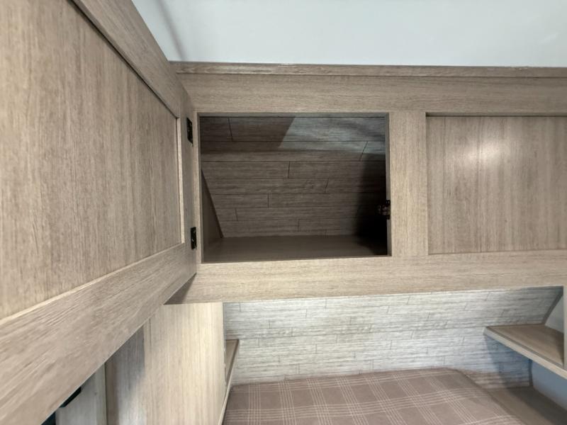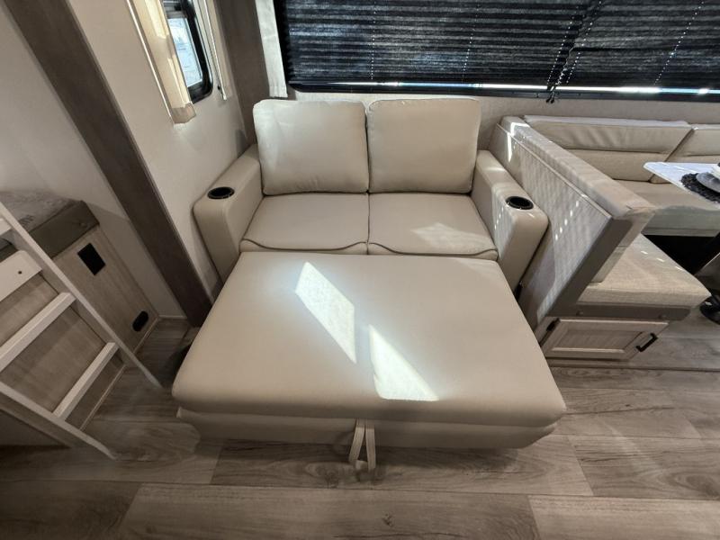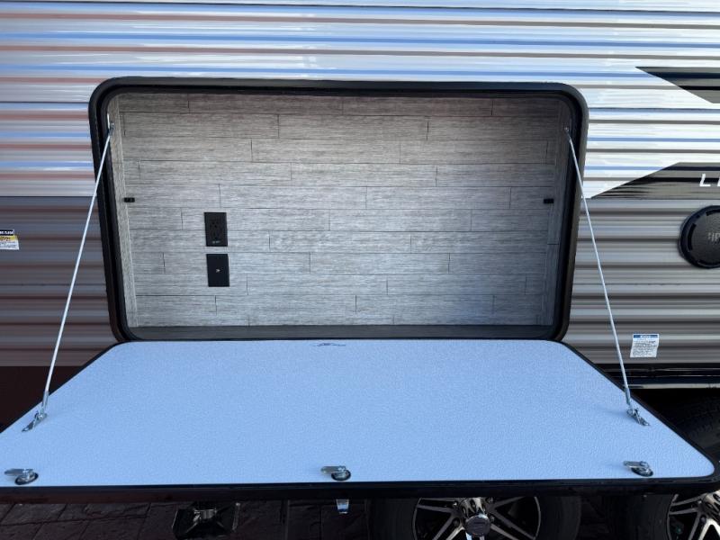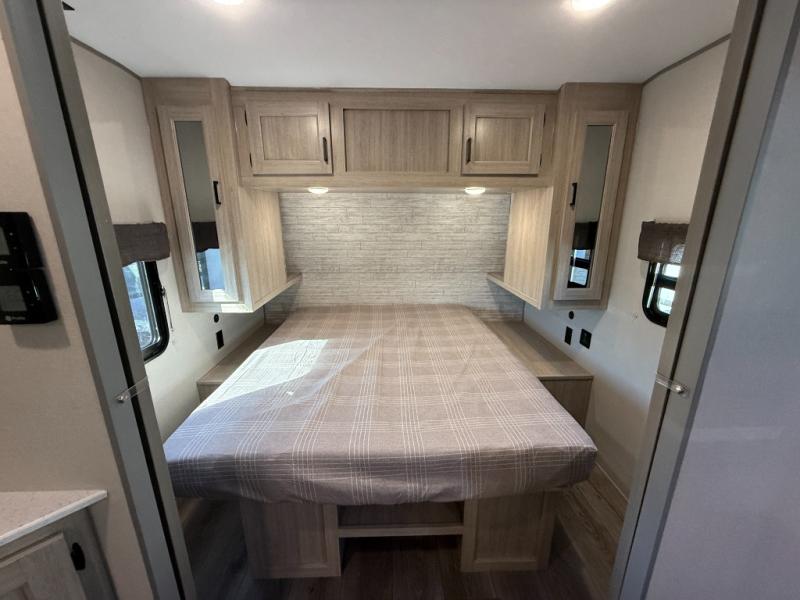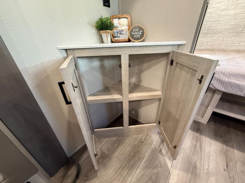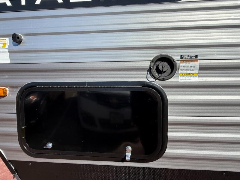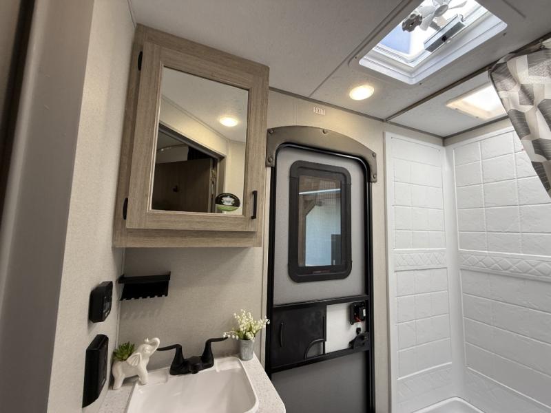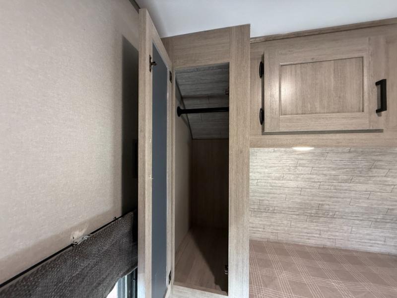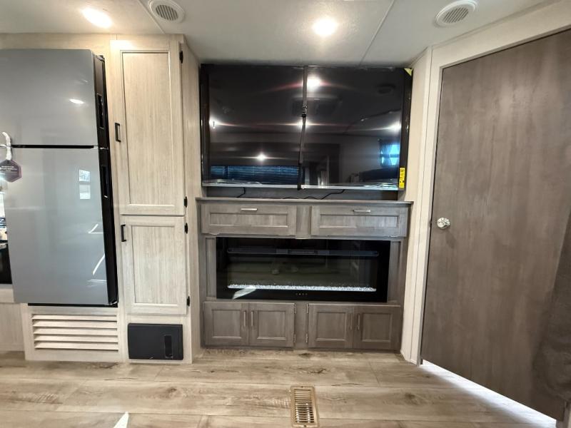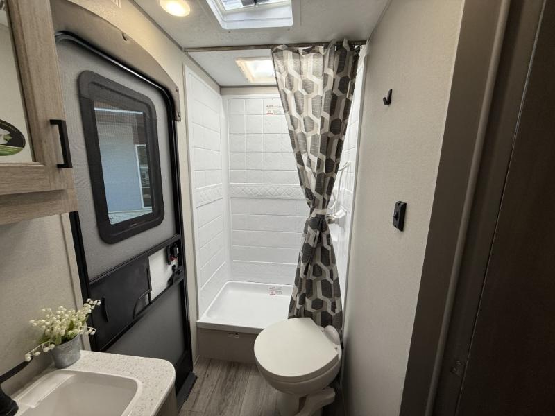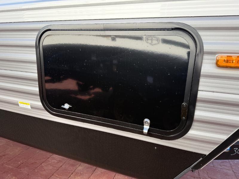 This travel trailer is perfect for your whole crew! Once you arrive at the campground, you can put out the 21' electric awning and start lunch on the exterior camper kitchen with a griddle and mini fridge. There is also a pass-thru storage plus additional exterior storage with a fold-down table and a TV hookup for added convenience. And since there are dual entry doors found on this unit, you can enter in through the full bath in the back, or the main living area towards the front! A large slide provides ample space to move about, and you'll find a trundle sofa and U-shaped dinette here for cozy seating and sleeping space. Speaking of sleeping, there is a front RV queen bed in the bedroom plus double-size bunks in the back for guests!