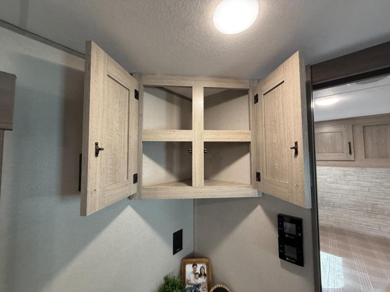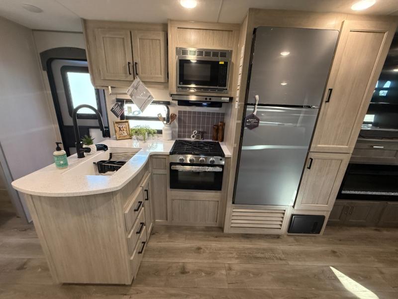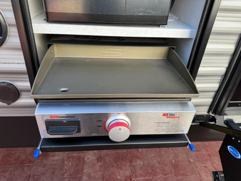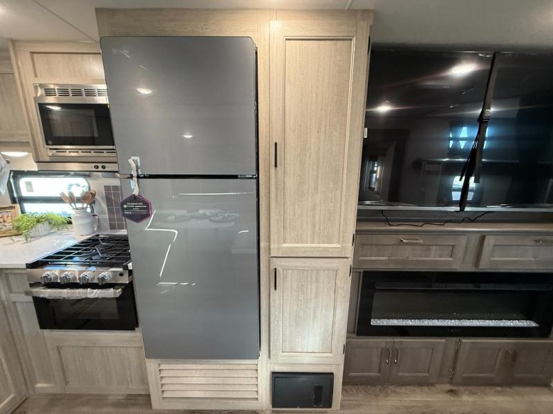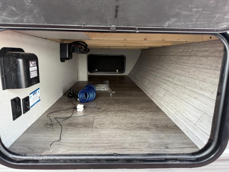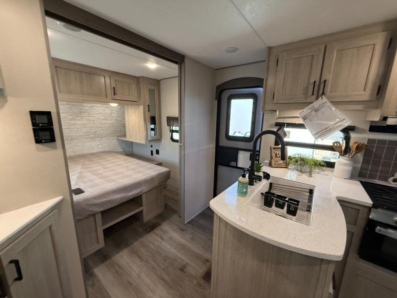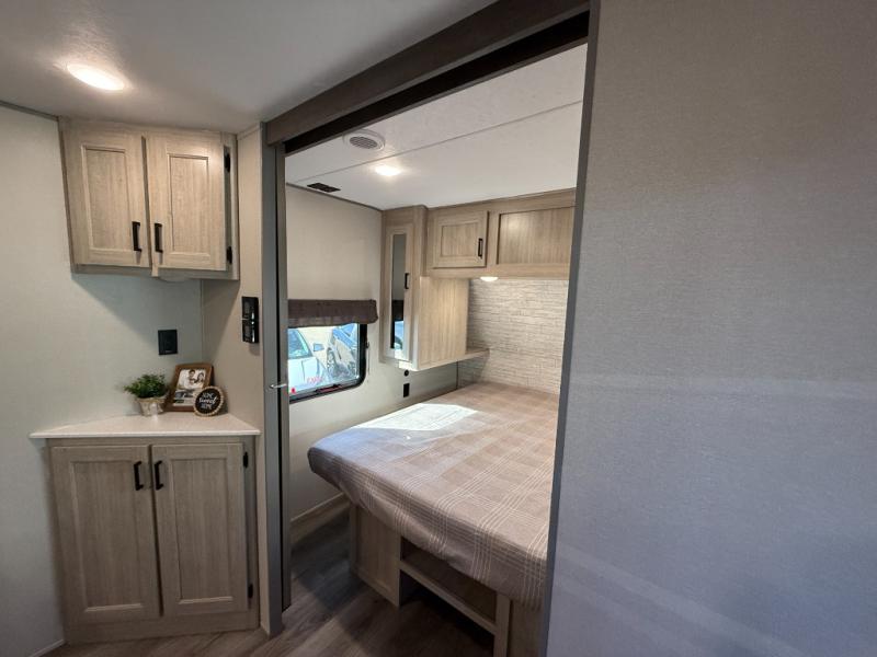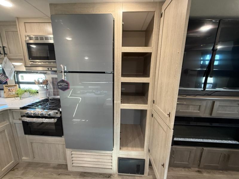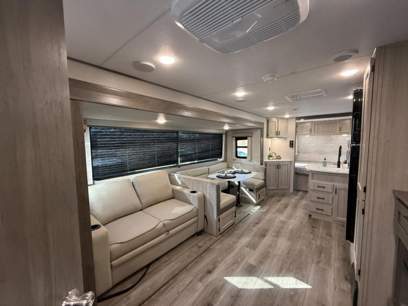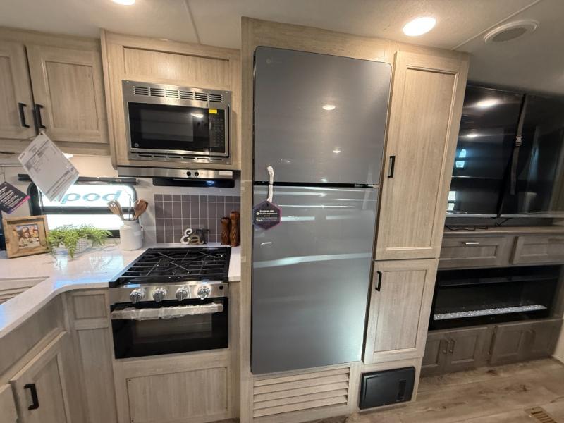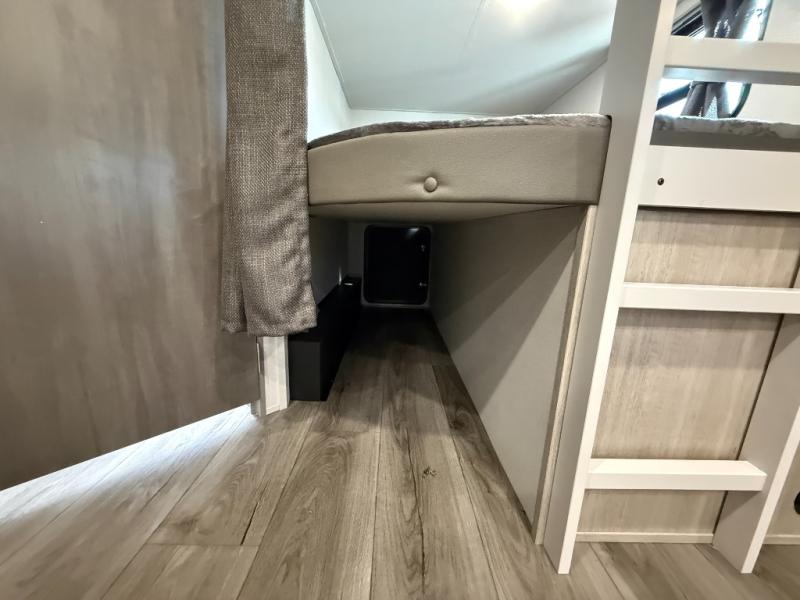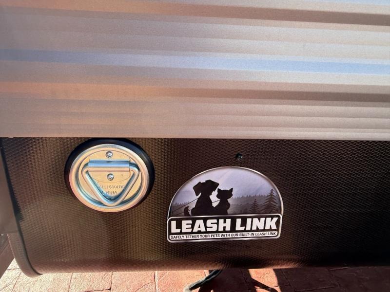 This travel trailer is perfect for your whole crew! Once you arrive at the campground, you can put out the 21' electric awning and start lunch on the exterior camper kitchen with a griddle and mini fridge. There is also a pass-thru storage plus additional exterior storage with a fold-down table and a TV hookup for added convenience. And since there are dual entry doors found on this unit, you can enter in through the full bath in the back, or the main living area towards the front! A large slide provides ample space to move about, and you'll find a trundle sofa and U-shaped dinette here for cozy seating and sleeping space. Speaking of sleeping, there is a front RV queen bed in the bedroom plus double-size bunks in the back for guests!