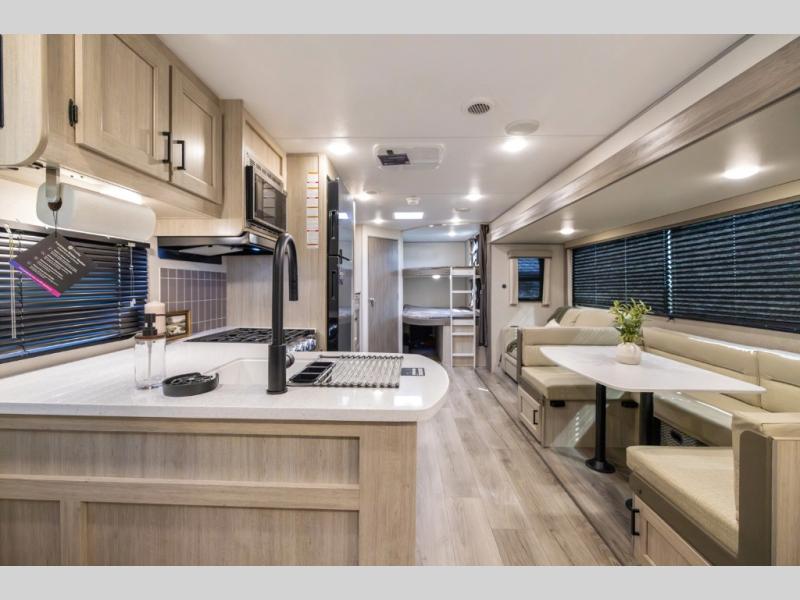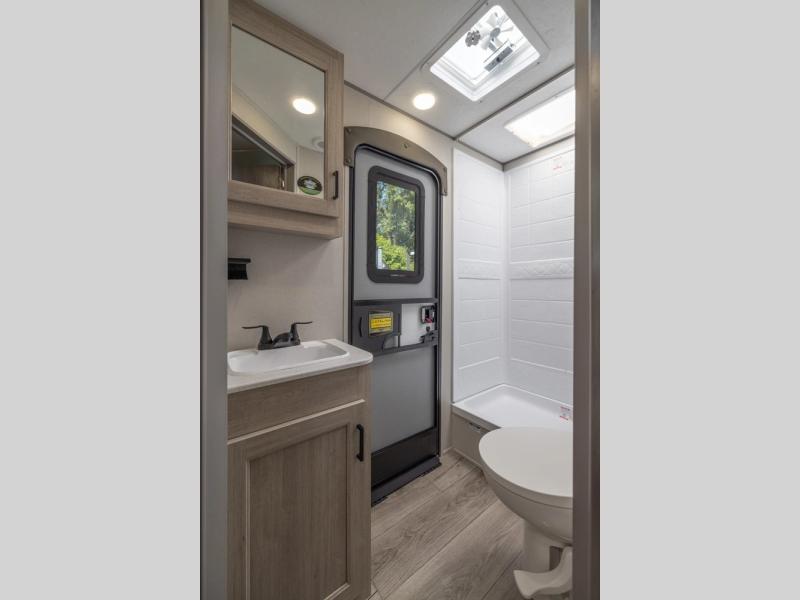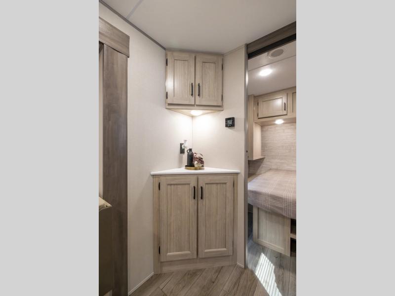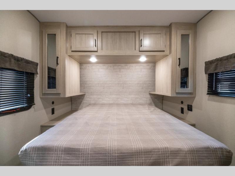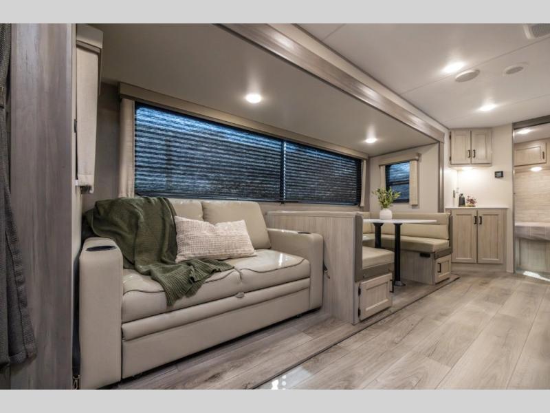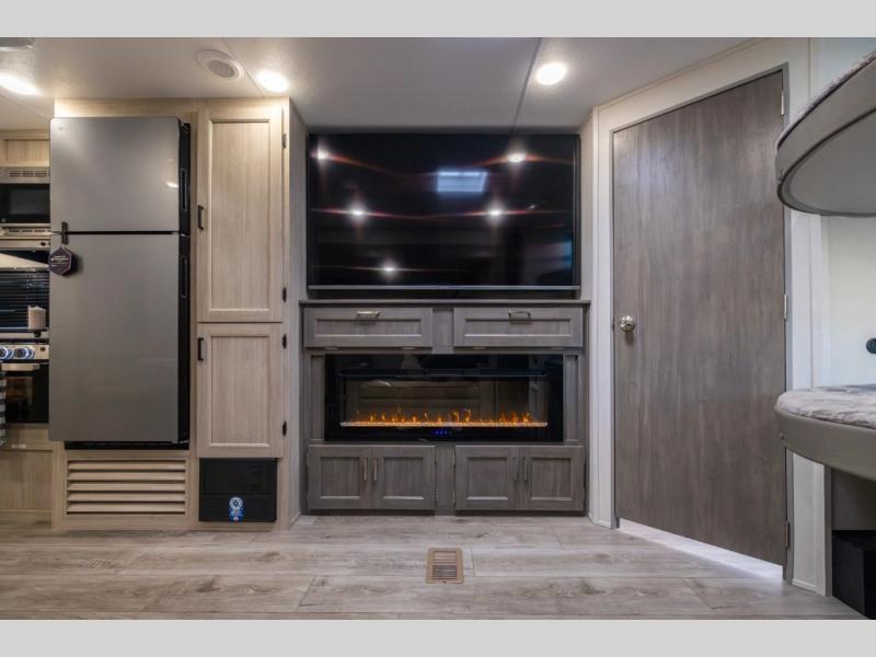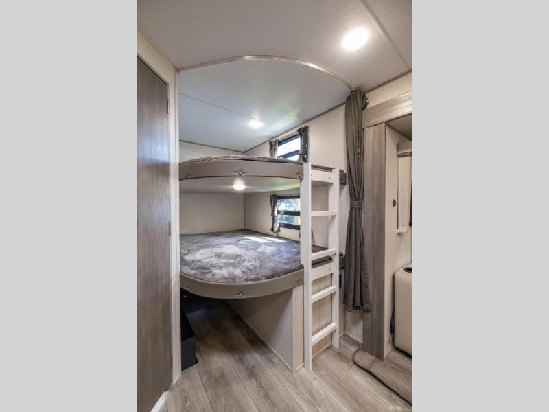 This travel trailer is perfect for your whole crew! Once you arrive at the campground, you can put out the 21' electric awning and start lunch on the exterior camper kitchen with a griddle and mini fridge. There is also a pass-thru storage plus additional exterior storage with a fold-down table and a TV hookup for added convenience. And since there are dual entry doors found on this unit, you can enter in through the full bath in the back, or the main living area towards the front! A large slide provides ample space to move about, and you'll find a trundle sofa and U-shaped dinette here for cozy seating and sleeping space. Speaking of sleeping, there is a front RV queen bed in the bedroom plus double-size bunks in the back for guests!
