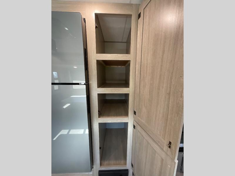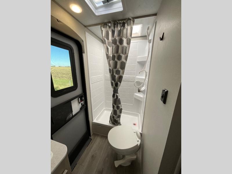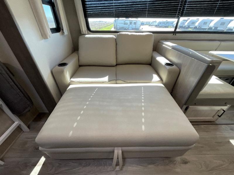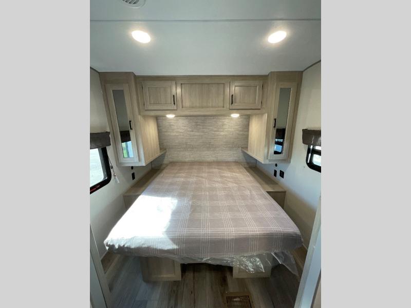 This travel trailer is perfect for your whole crew! Once you arrive at the campground, you can put out the 21' electric awning and start lunch on the exterior camper kitchen with a griddle and mini fridge. There is also a pass-thru storage plus additional exterior storage with a fold-down table and a TV hookup for added convenience. And since there are dual entry doors found on this unit, you can enter in through the full bath in the back, or the main living area towards the front! A large slide provides ample space to move about, and you'll find a trundle sofa and U-shaped dinette here for cozy seating and sleeping space. Speaking of sleeping, there is a front RV queen bed in the bedroom plus double-size bunks in the back for guests!