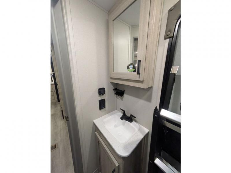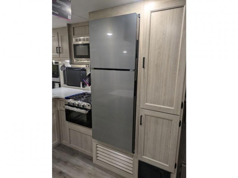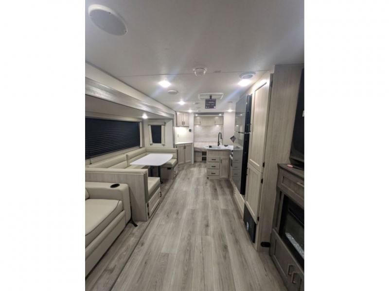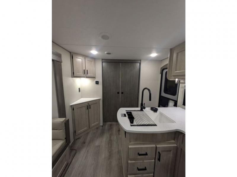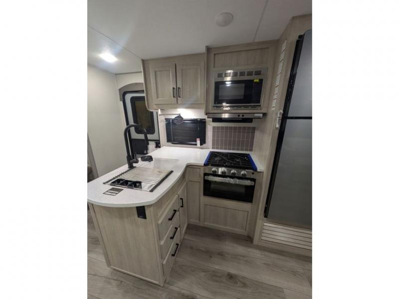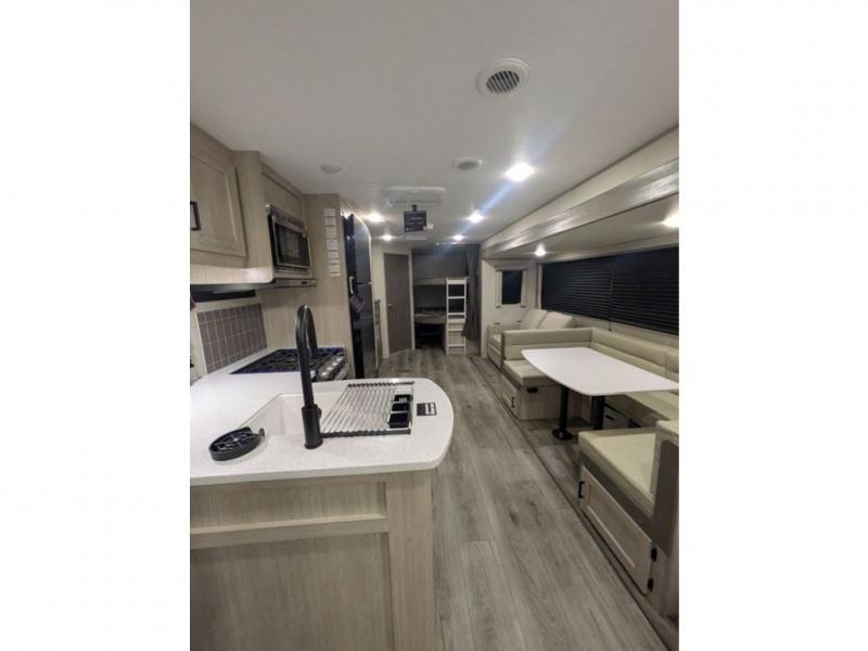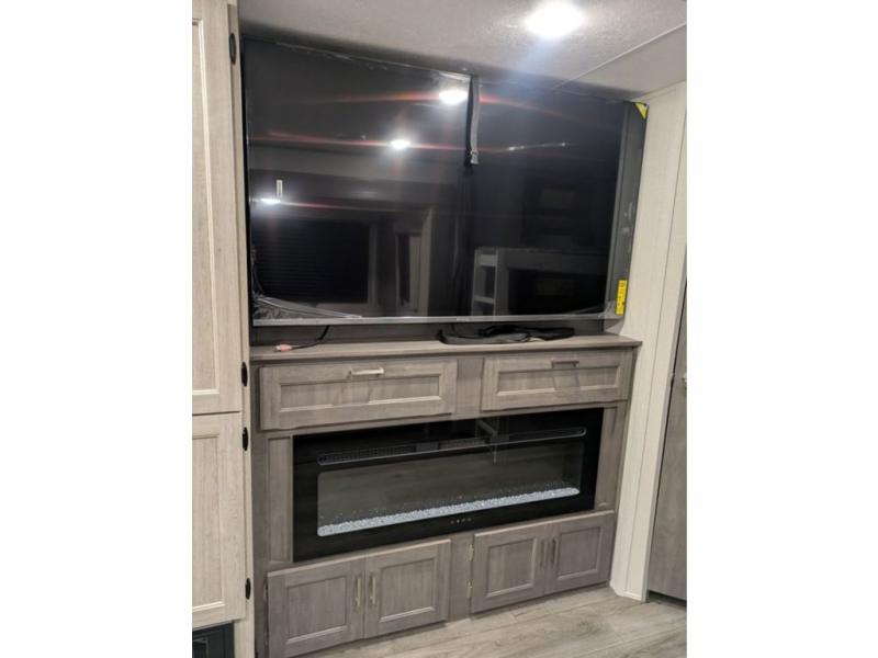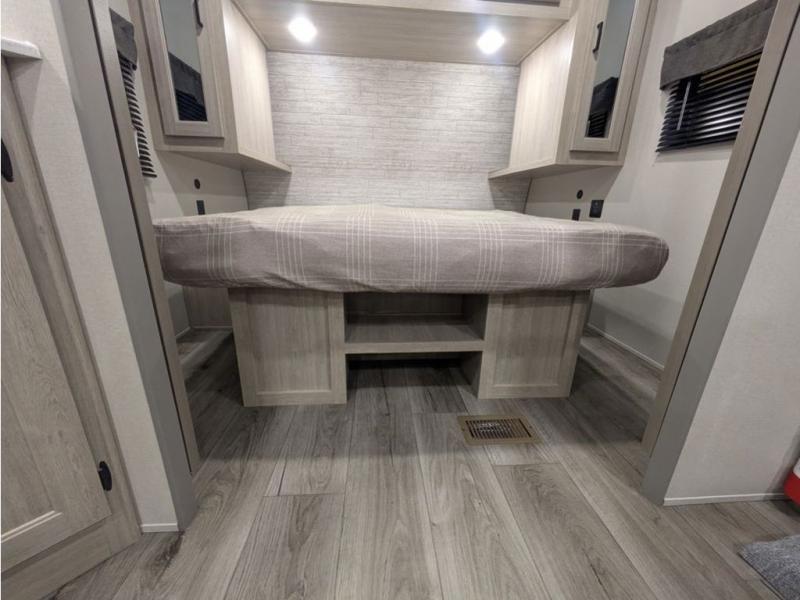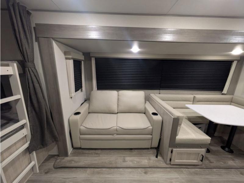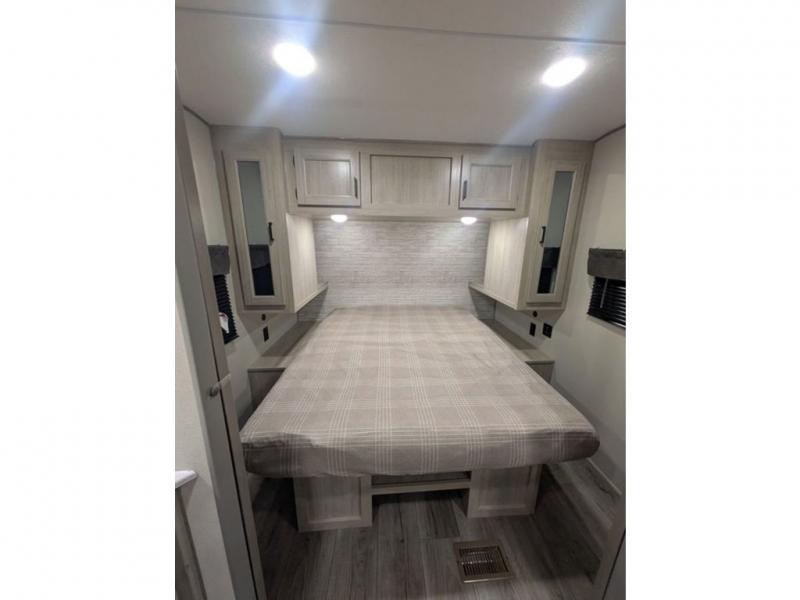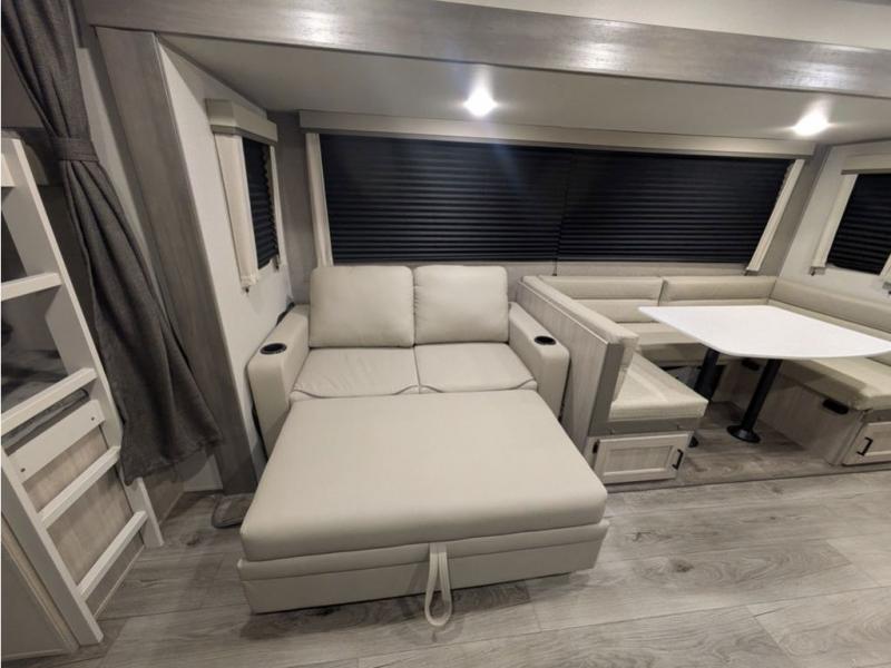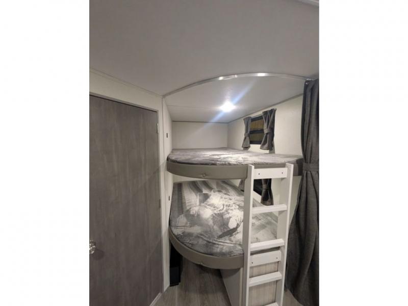 This travel trailer is perfect for your whole crew! Once you arrive at the campground, you can put out the 21' electric awning and start lunch on the exterior camper kitchen with a griddle and mini fridge. There is also a pass-thru storage plus additional exterior storage with a fold-down table and a TV hookup for added convenience. And since there are dual entry doors found on this unit, you can enter in through the full bath in the back, or the main living area towards the front! A large slide provides ample space to move about, and you'll find a trundle sofa and U-shaped dinette here for cozy seating and sleeping space. Speaking of sleeping, there is a front RV queen bed in the bedroom plus double-size bunks in the back for guests!