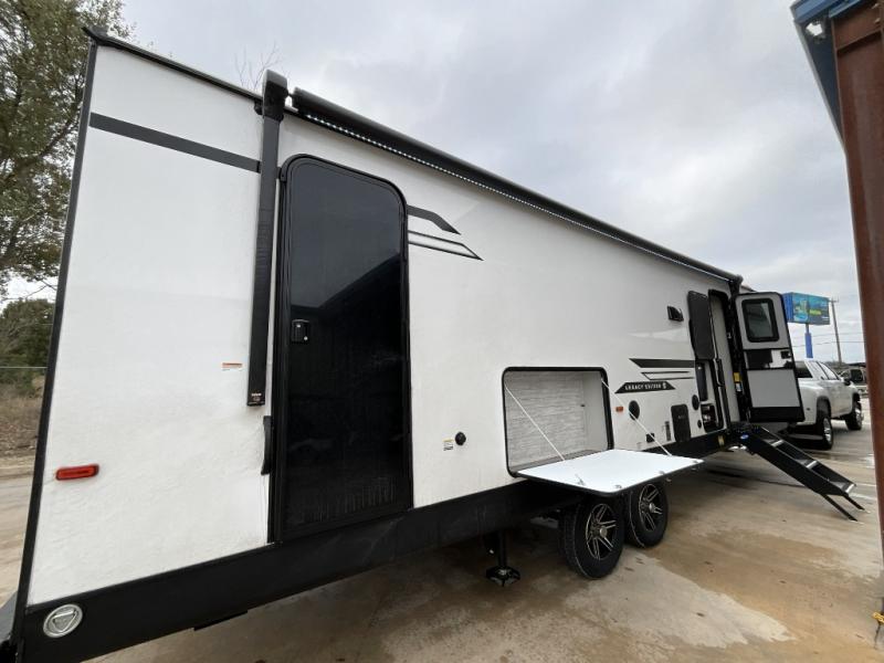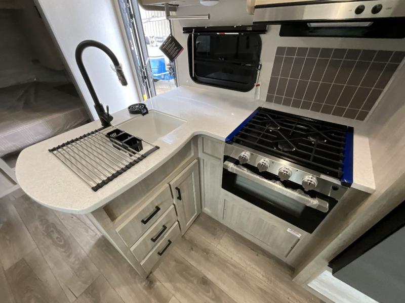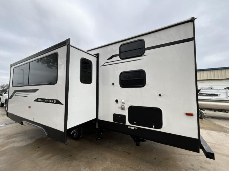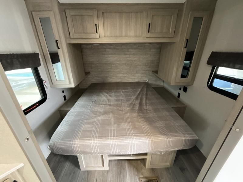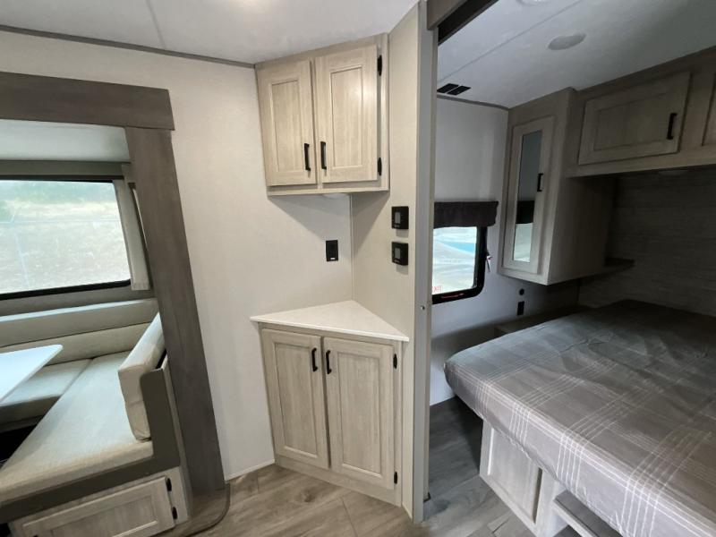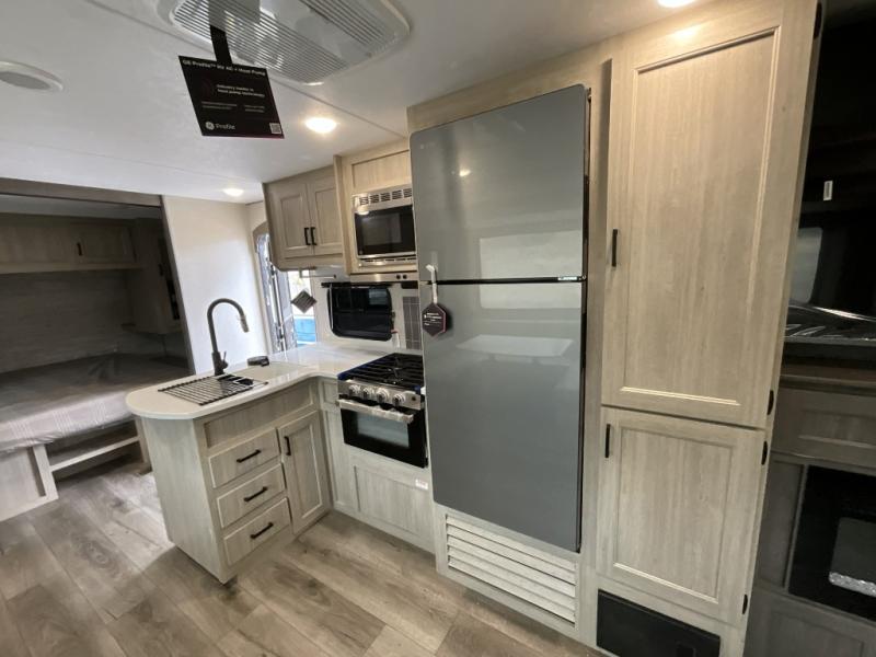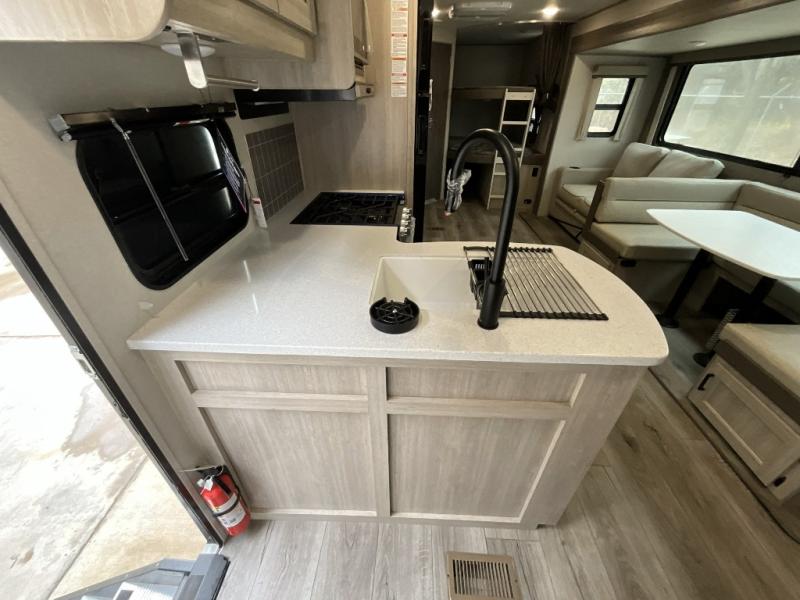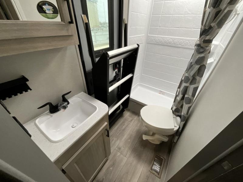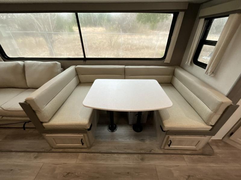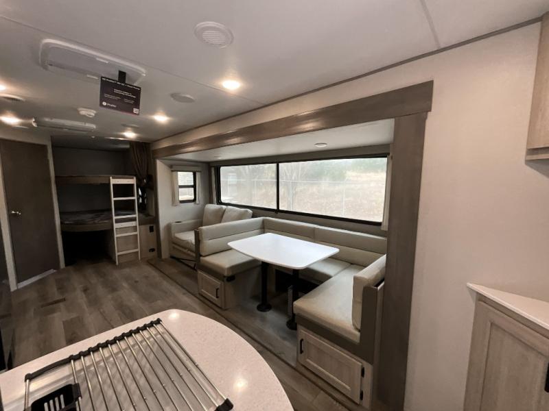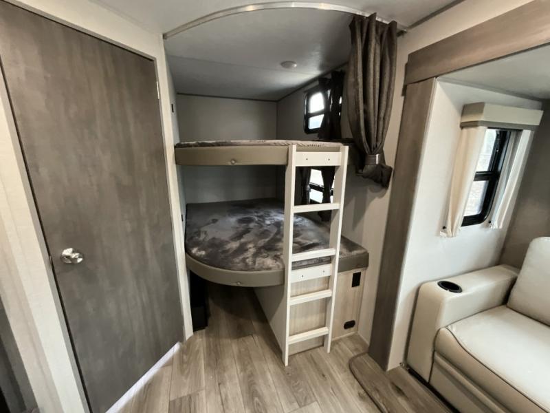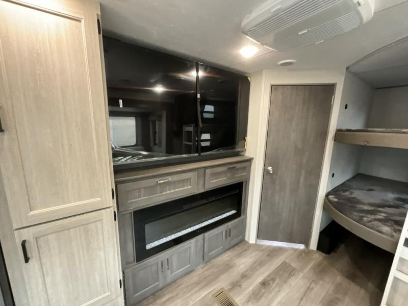 This travel trailer is perfect for your whole crew! Once you arrive at the campground, you can put out the 21' electric awning and start lunch on the exterior camper kitchen with a griddle and mini fridge. There is also a pass-thru storage plus additional exterior storage with a fold-down table and a TV hookup for added convenience. And since there are dual entry doors found on this unit, you can enter in through the full bath in the back, or the main living area towards the front! A large slide provides ample space to move about, and you'll find a trundle sofa and U-shaped dinette here for cozy seating and sleeping space. Speaking of sleeping, there is a front RV queen bed in the bedroom plus double-size bunks in the back for guests!