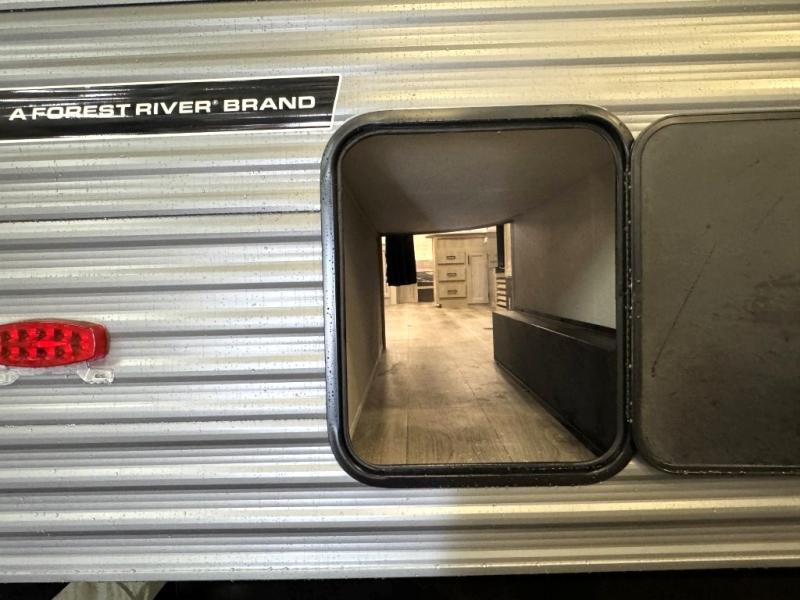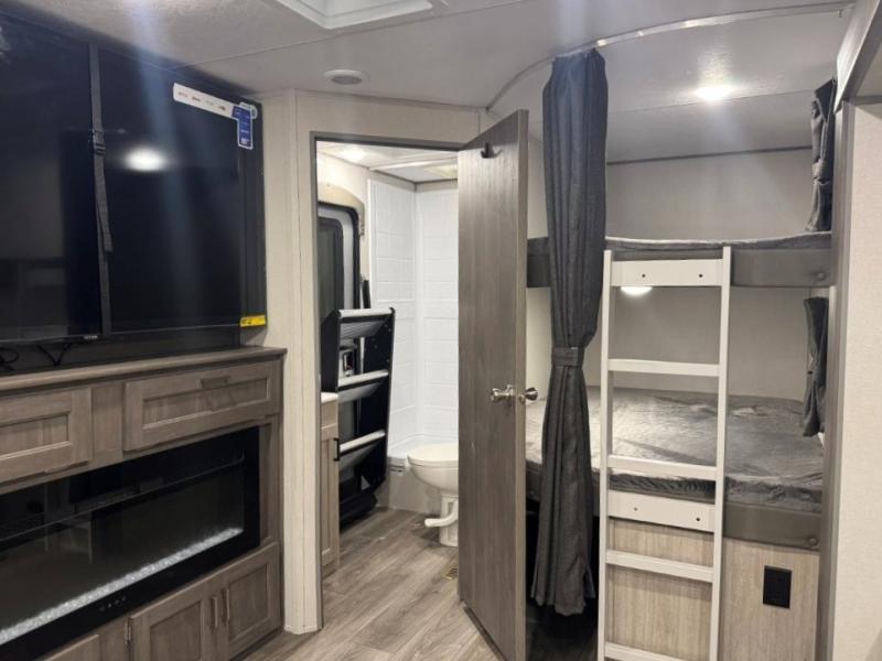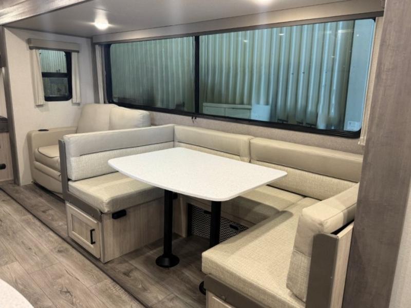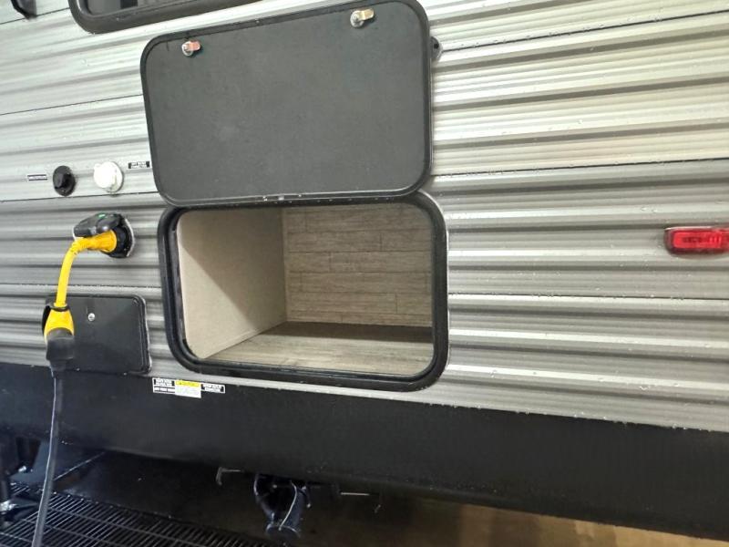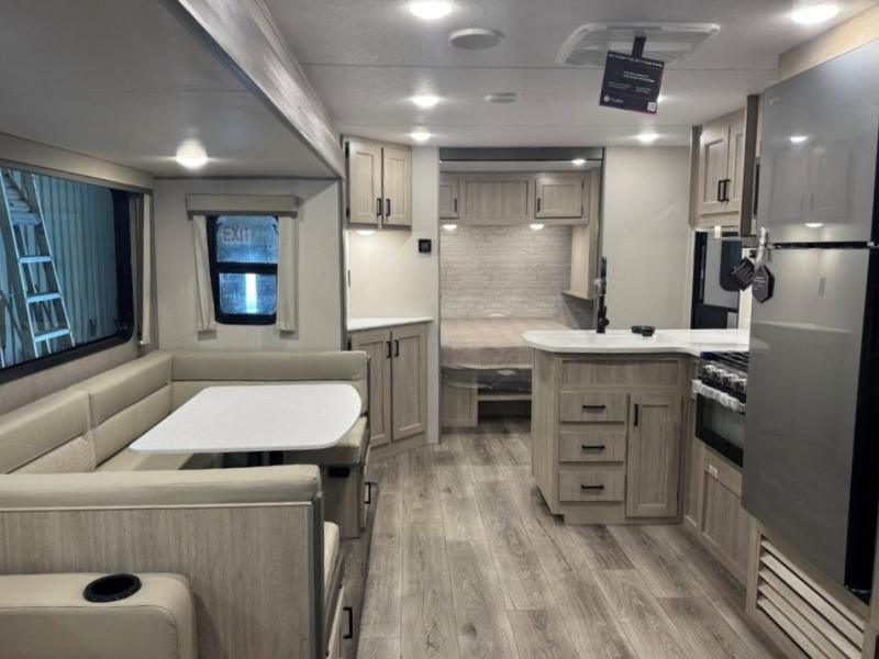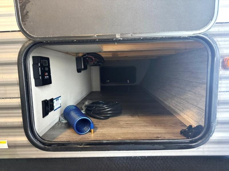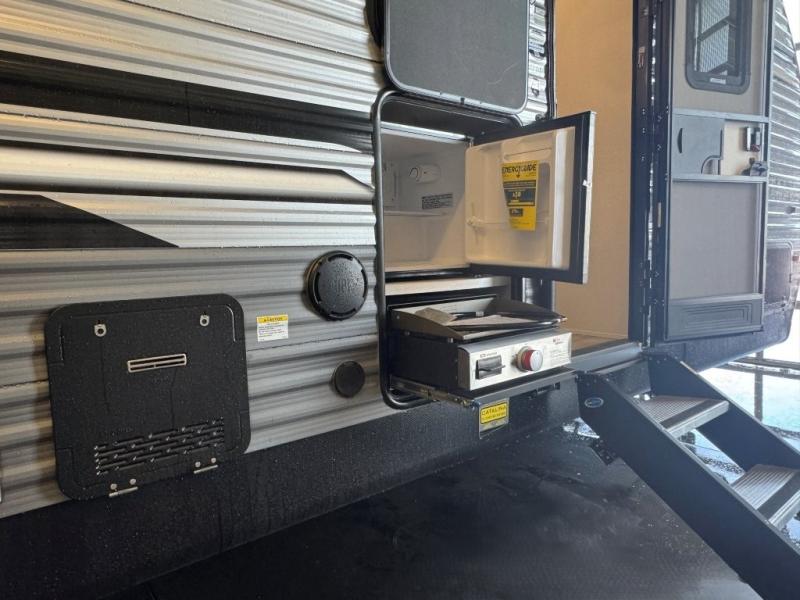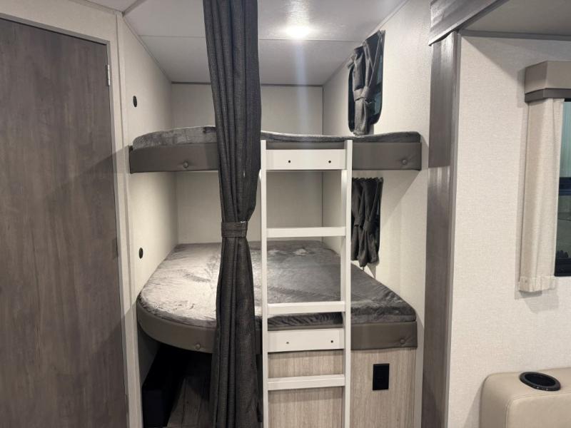 This travel trailer is perfect for your whole crew! Once you arrive at the campground, you can put out the 21' electric awning and start lunch on the exterior camper kitchen with a griddle and mini fridge. There is also a pass-thru storage plus additional exterior storage with a fold-down table and a TV hookup for added convenience. And since there are dual entry doors found on this unit, you can enter in through the full bath in the back, or the main living area towards the front! A large slide provides ample space to move about, and you'll find a trundle sofa and U-shaped dinette here for cozy seating and sleeping space. Speaking of sleeping, there is a front RV queen bed in the bedroom plus double-size bunks in the back for guests!