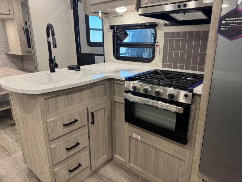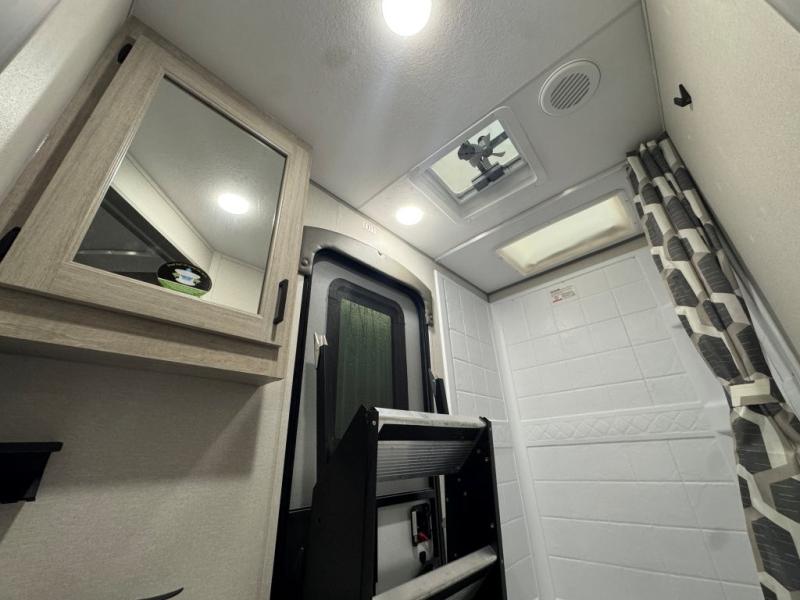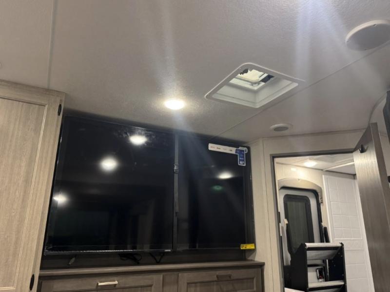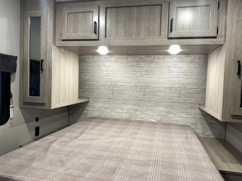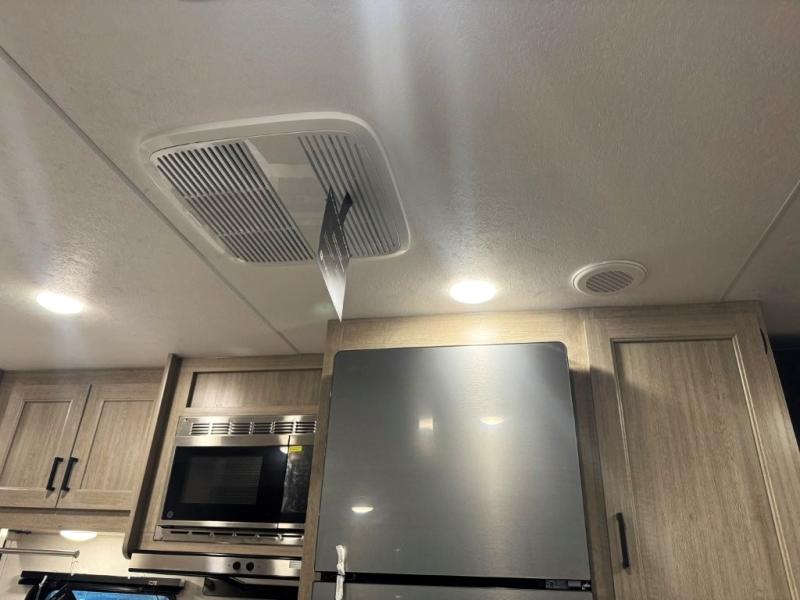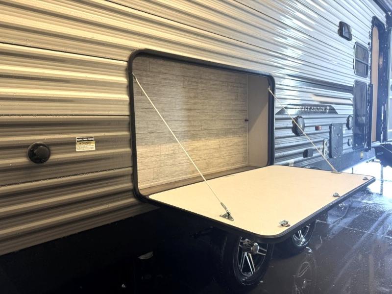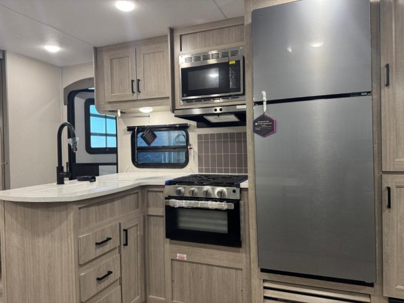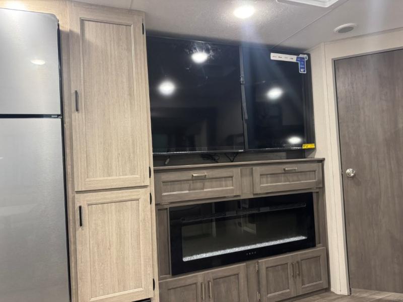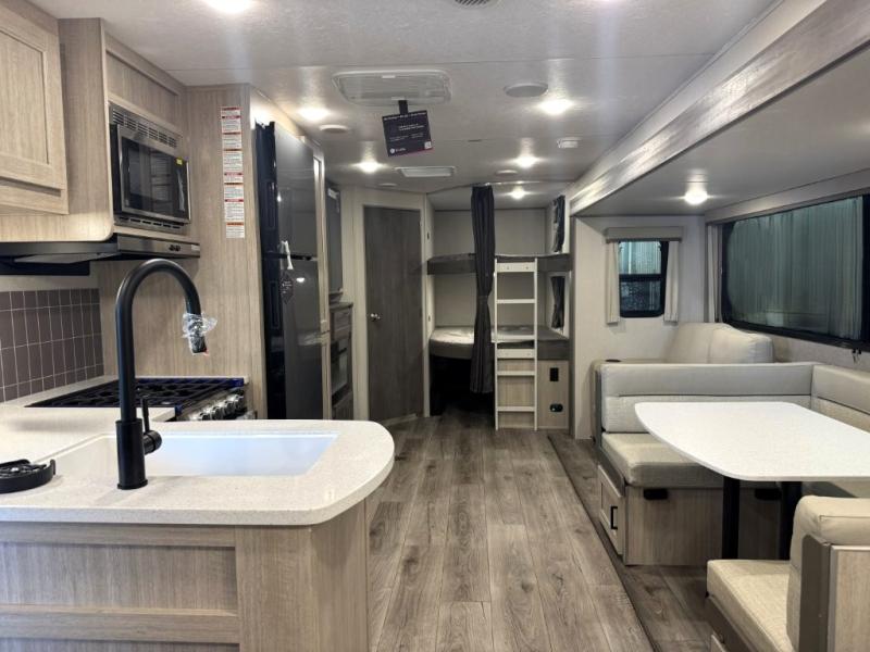 This travel trailer is perfect for your whole crew! Once you arrive at the campground, you can put out the 21' electric awning and start lunch on the exterior camper kitchen with a griddle and mini fridge. There is also a pass-thru storage plus additional exterior storage with a fold-down table and a TV hookup for added convenience. And since there are dual entry doors found on this unit, you can enter in through the full bath in the back, or the main living area towards the front! A large slide provides ample space to move about, and you'll find a trundle sofa and U-shaped dinette here for cozy seating and sleeping space. Speaking of sleeping, there is a front RV queen bed in the bedroom plus double-size bunks in the back for guests!