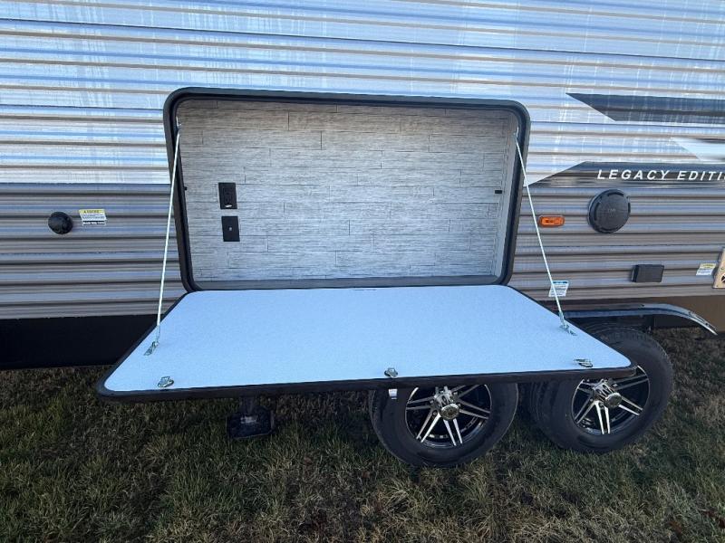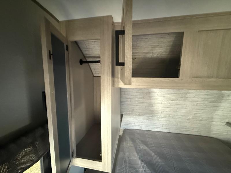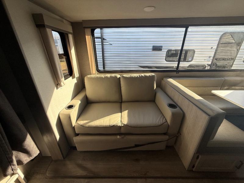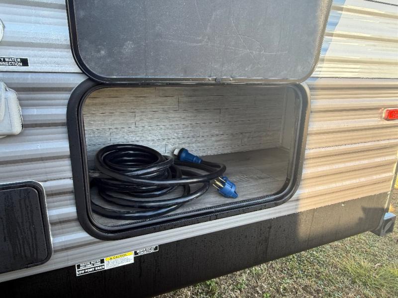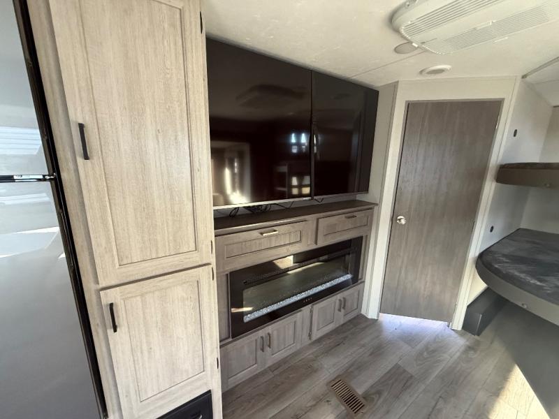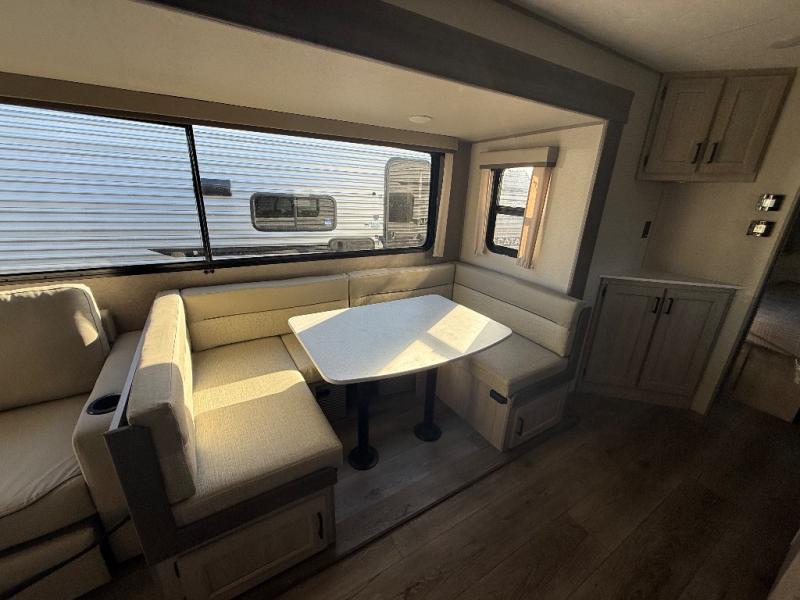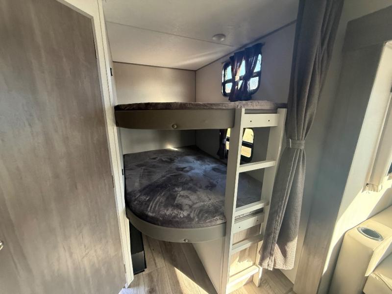 This travel trailer is perfect for your whole crew! Once you arrive at the campground, you can put out the 21' electric awning and start lunch on the exterior camper kitchen with a griddle and mini fridge. There is also a pass-thru storage plus additional exterior storage with a fold-down table and a TV hookup for added convenience. And since there are dual entry doors found on this unit, you can enter in through the full bath in the back, or the main living area towards the front! A large slide provides ample space to move about, and you'll find a trundle sofa and U-shaped dinette here for cozy seating and sleeping space. Speaking of sleeping, there is a front RV queen bed in the bedroom plus double-size bunks in the back for guests!