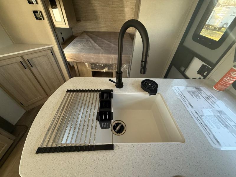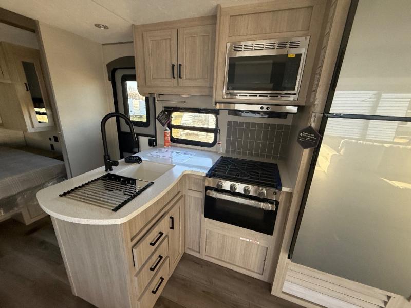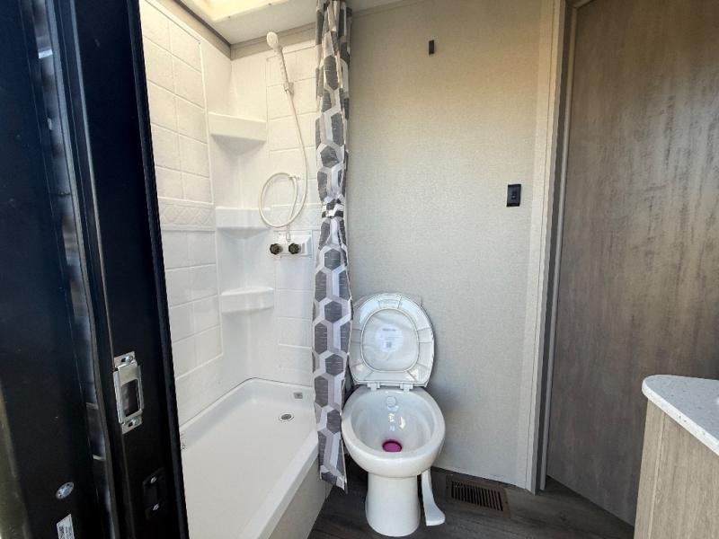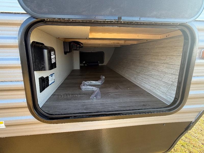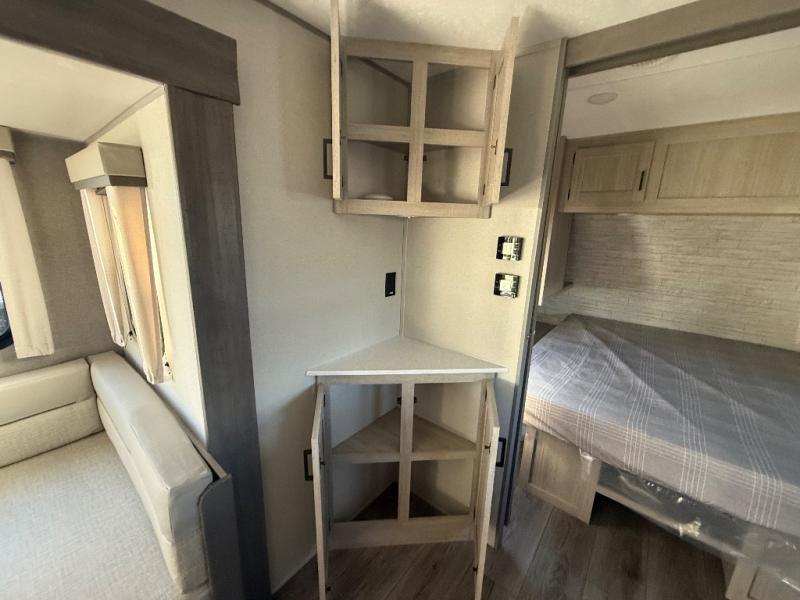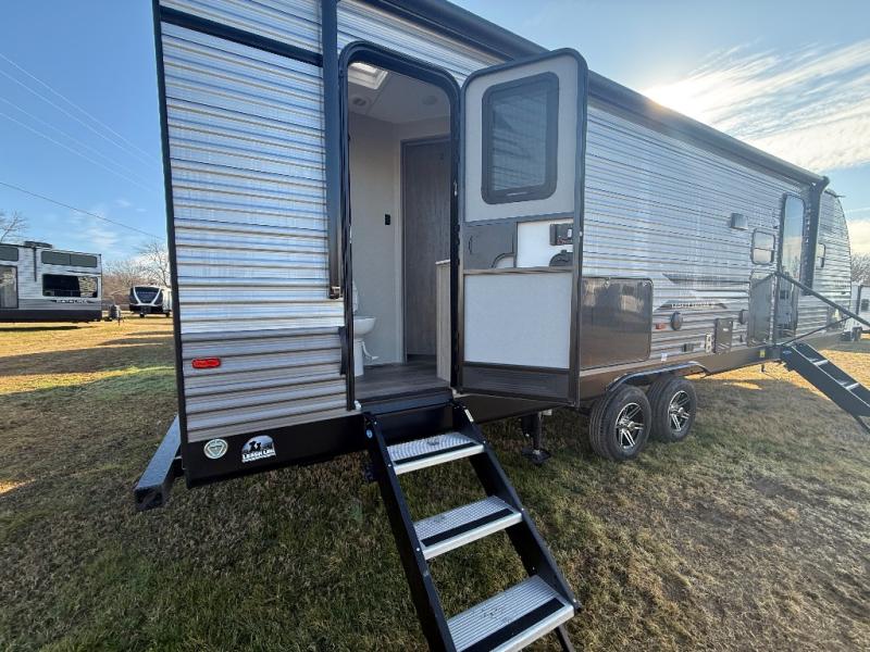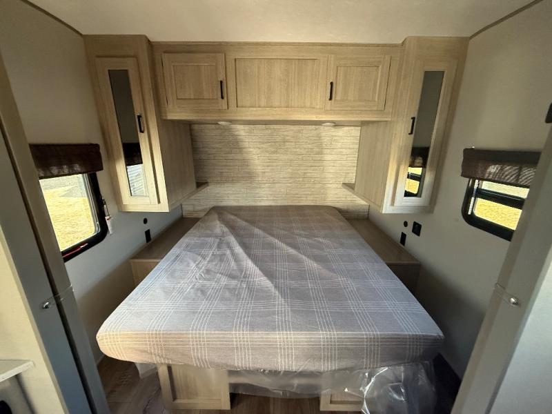 This travel trailer is perfect for your whole crew! Once you arrive at the campground, you can put out the 21' electric awning and start lunch on the exterior camper kitchen with a griddle and mini fridge. There is also a pass-thru storage plus additional exterior storage with a fold-down table and a TV hookup for added convenience. And since there are dual entry doors found on this unit, you can enter in through the full bath in the back, or the main living area towards the front! A large slide provides ample space to move about, and you'll find a trundle sofa and U-shaped dinette here for cozy seating and sleeping space. Speaking of sleeping, there is a front RV queen bed in the bedroom plus double-size bunks in the back for guests!