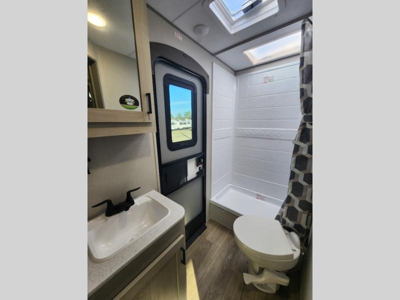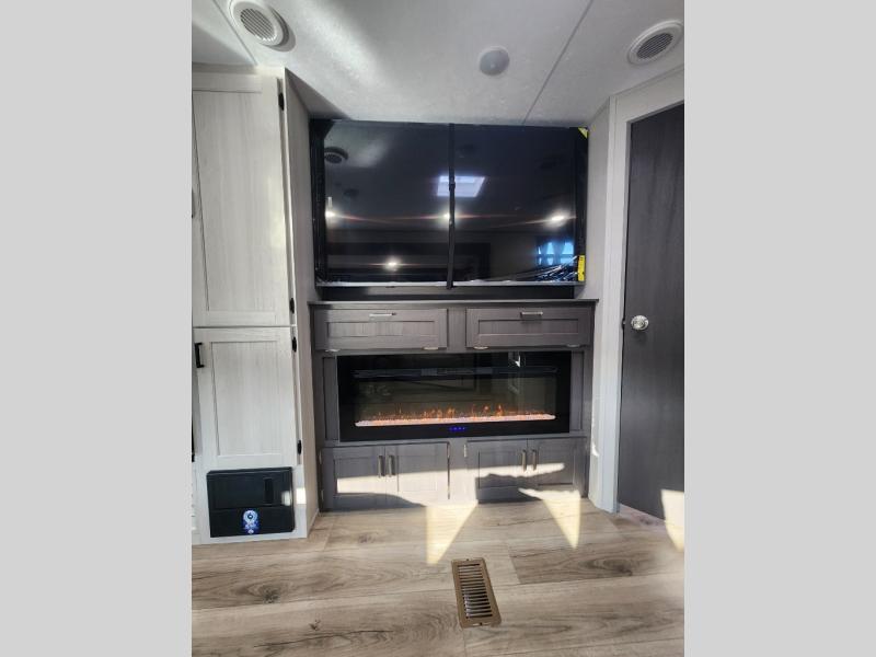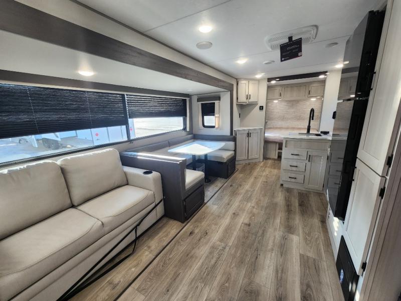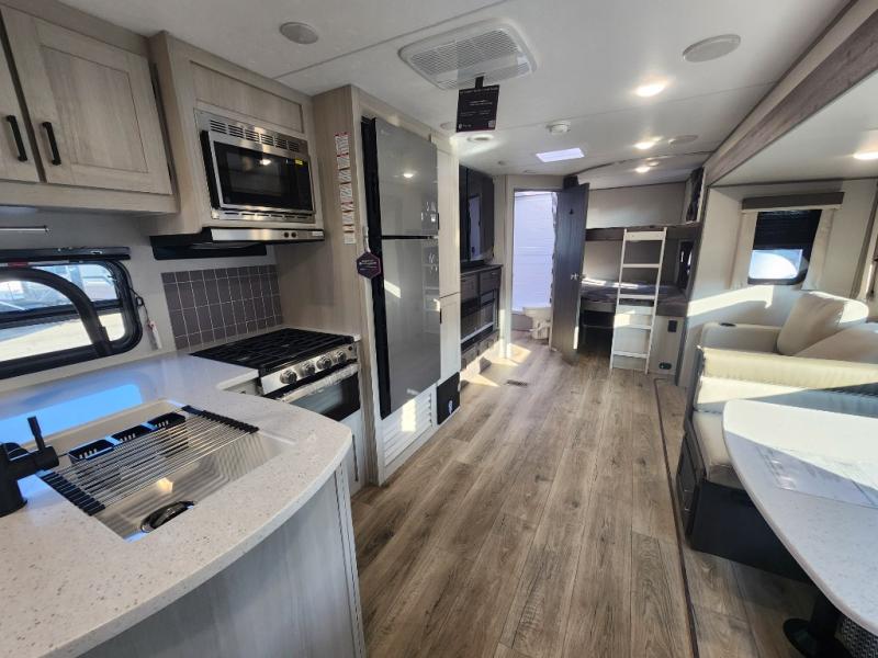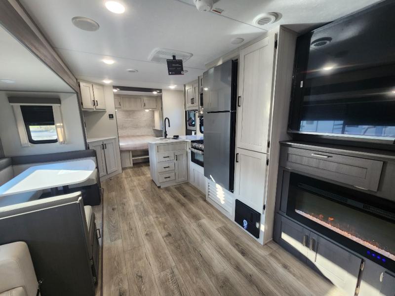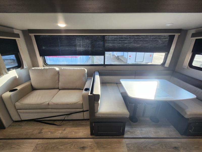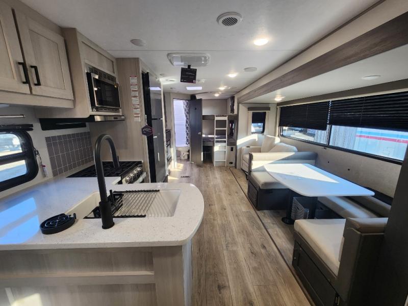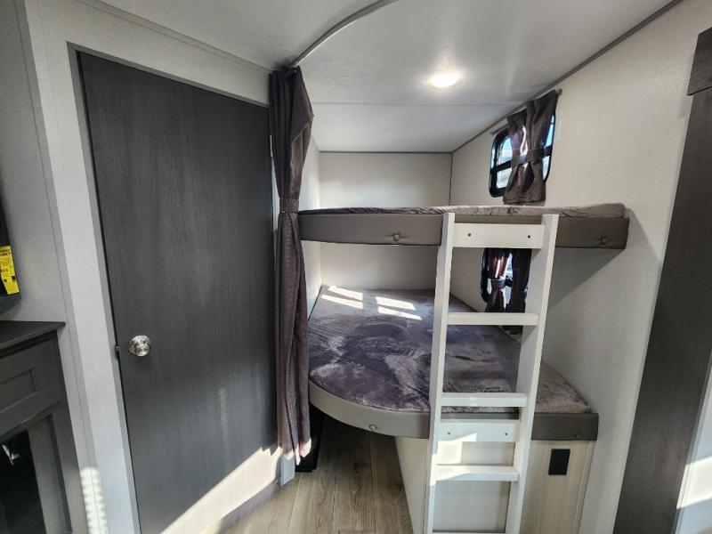 This travel trailer is perfect for your whole crew! Once you arrive at the campground, you can put out the 21' electric awning and start lunch on the exterior camper kitchen with a griddle and mini fridge. There is also a pass-thru storage plus additional exterior storage with a fold-down table and a TV hookup for added convenience. And since there are dual entry doors found on this unit, you can enter in through the full bath in the back, or the main living area towards the front! A large slide provides ample space to move about, and you'll find a trundle sofa and U-shaped dinette here for cozy seating and sleeping space. Speaking of sleeping, there is a front RV queen bed in the bedroom plus double-size bunks in the back for guests!