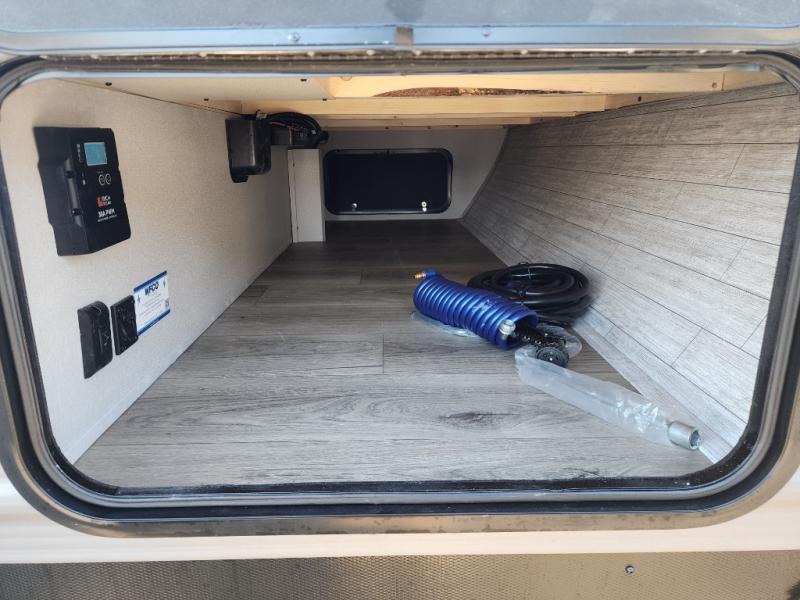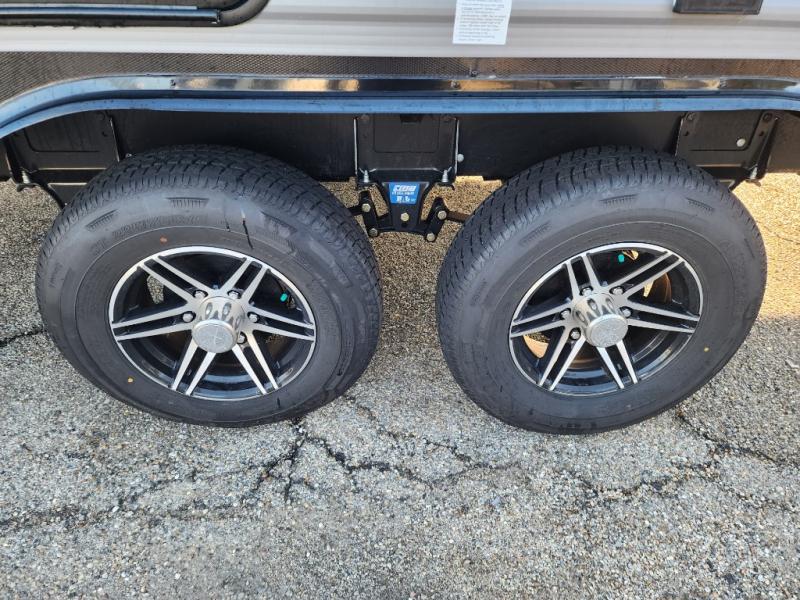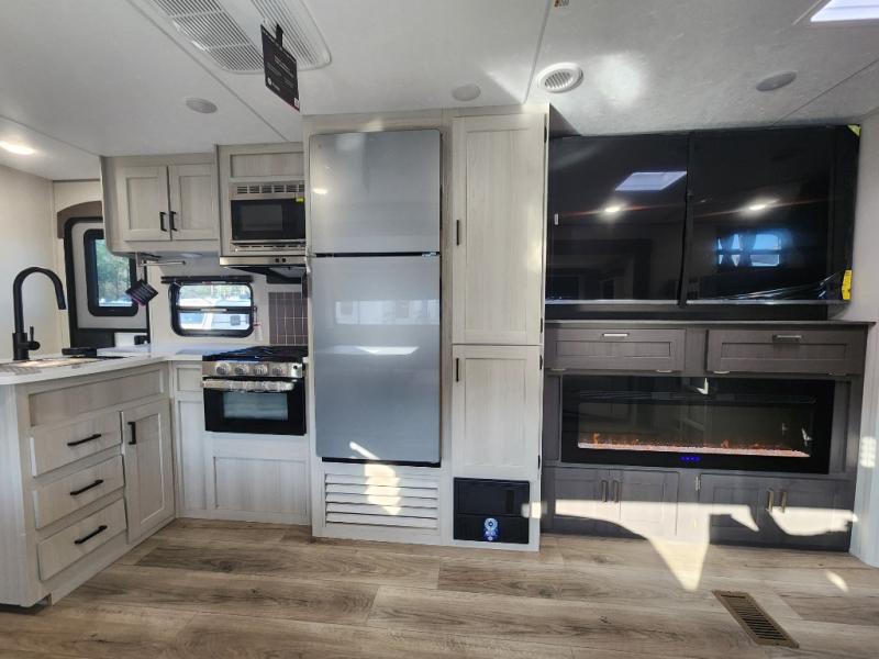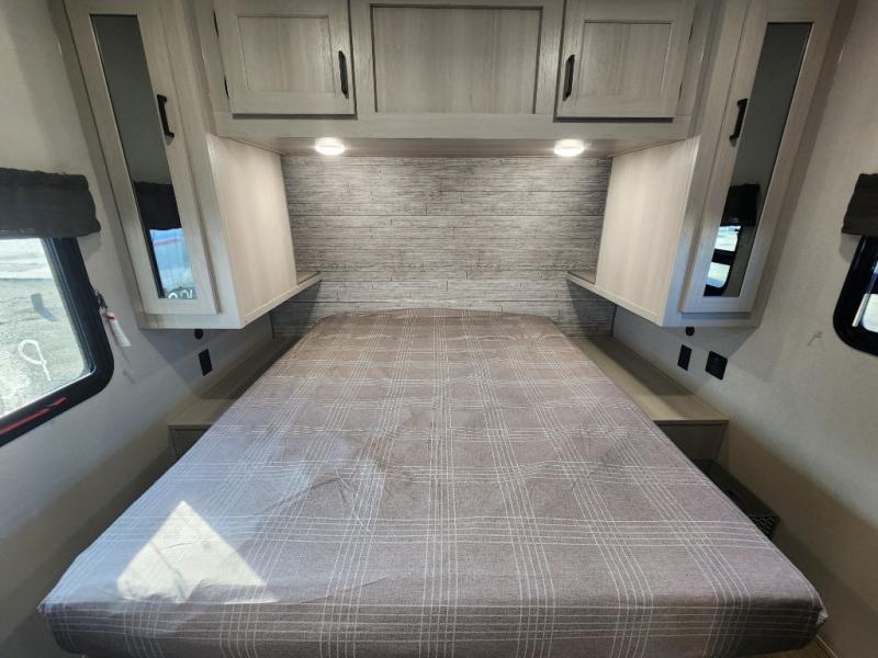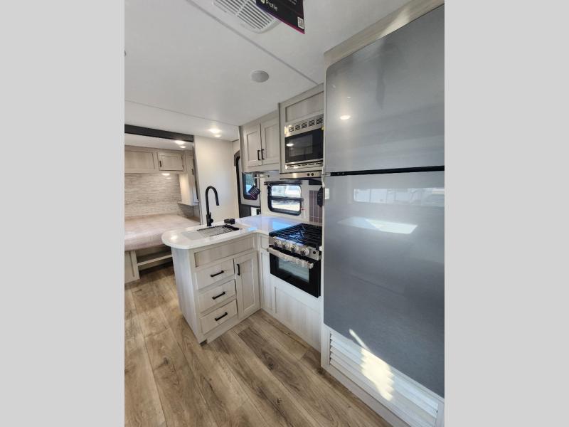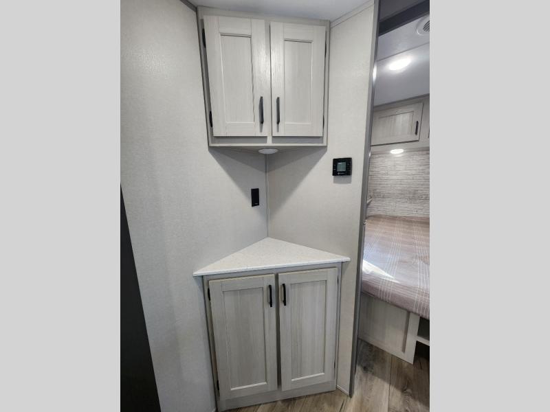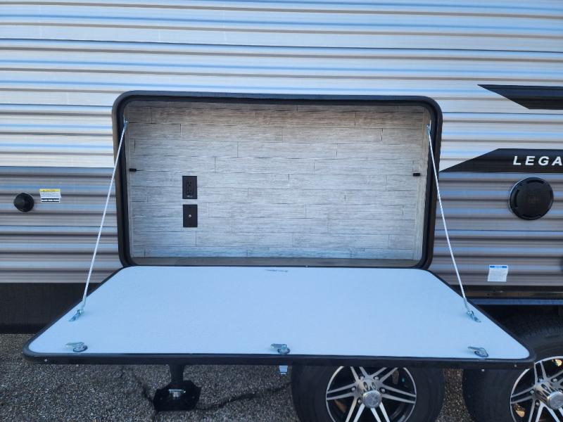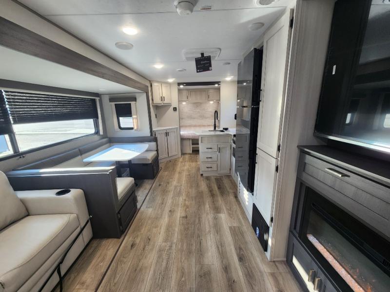 This travel trailer is perfect for your whole crew! Once you arrive at the campground, you can put out the 21' electric awning and start lunch on the exterior camper kitchen with a griddle and mini fridge. There is also a pass-thru storage plus additional exterior storage with a fold-down table and a TV hookup for added convenience. And since there are dual entry doors found on this unit, you can enter in through the full bath in the back, or the main living area towards the front! A large slide provides ample space to move about, and you'll find a trundle sofa and U-shaped dinette here for cozy seating and sleeping space. Speaking of sleeping, there is a front RV queen bed in the bedroom plus double-size bunks in the back for guests!