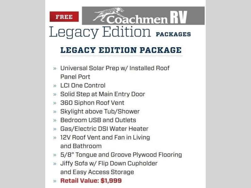Each Catalina Legacy travel trailer by Coachmen is constructed with a cambered structural steel I-beam frame for added strength and support, plus an enclosed and fully sealed corrugated underbelly to extend your camping season. There is also a seamless Alpha roof membrane, R-7 insulation throughout, full length frame outriggers, plus many more durable construction materials. You will love the 6' 9" interior height, along with Congoleum woodplank linoleum flooring, solid surface kitchen countertops, and hard valance window treatments. Choose a Catalina Legacy today!