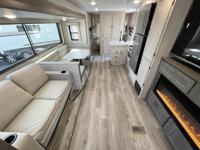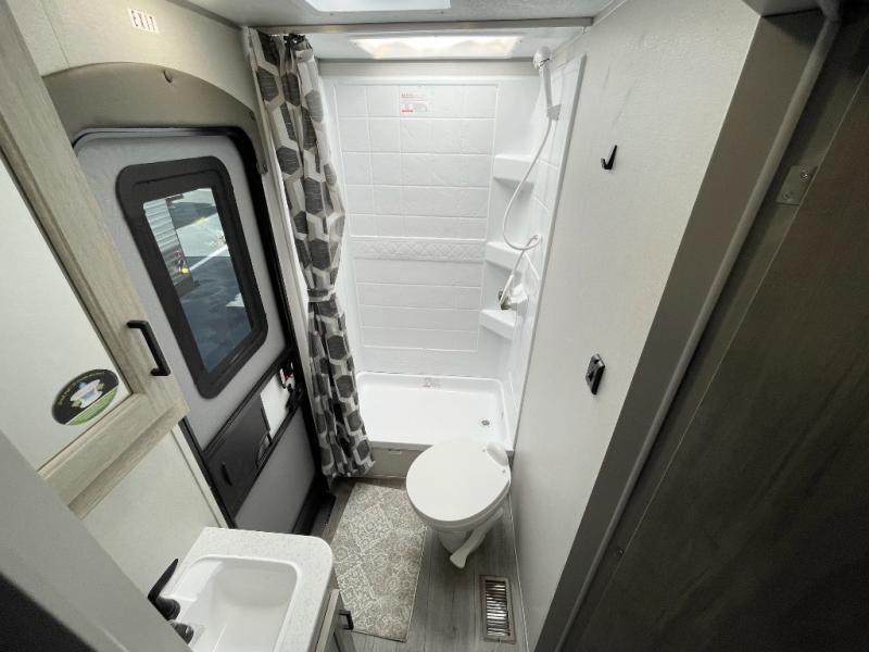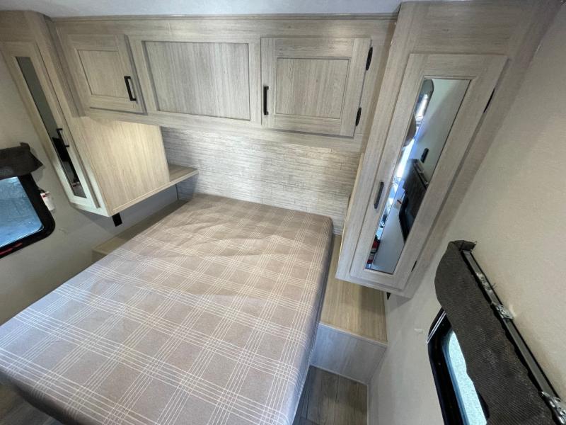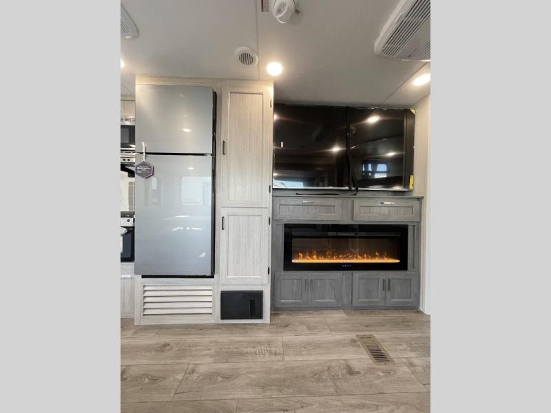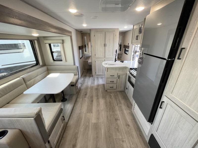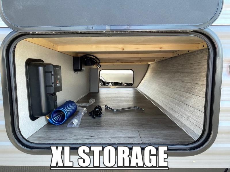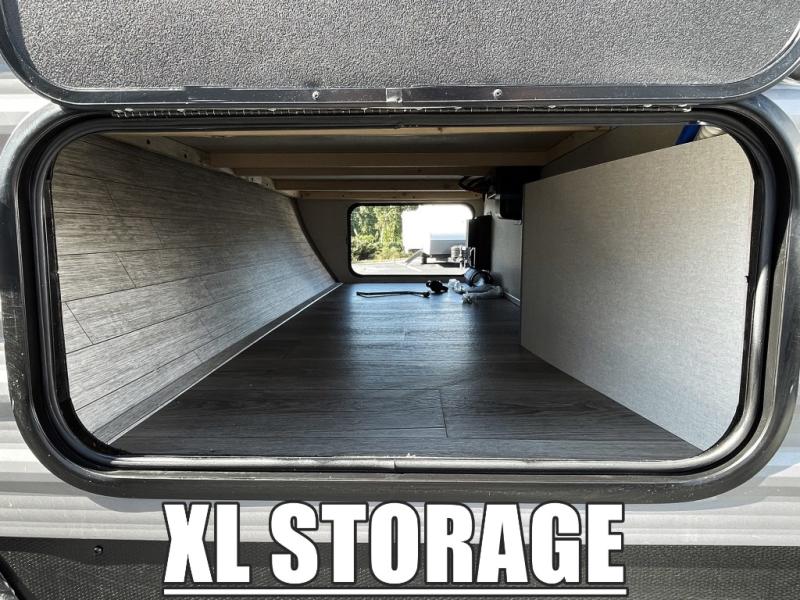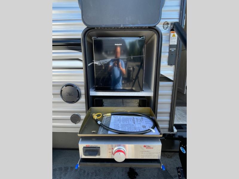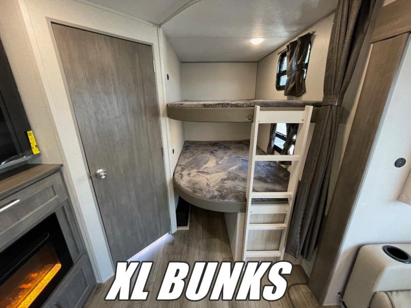 This travel trailer is perfect for your whole crew! Once you arrive at the campground, you can put out the 21' electric awning and start lunch on the exterior camper kitchen with a griddle and mini fridge. There is also a pass-thru storage plus additional exterior storage with a fold-down table and a TV hookup for added convenience. And since there are dual entry doors found on this unit, you can enter in through the full bath in the back, or the main living area towards the front! A large slide provides ample space to move about, and you'll find a trundle sofa and U-shaped dinette here for cozy seating and sleeping space. Speaking of sleeping, there is a front RV queen bed in the bedroom plus double-size bunks in the back for guests!