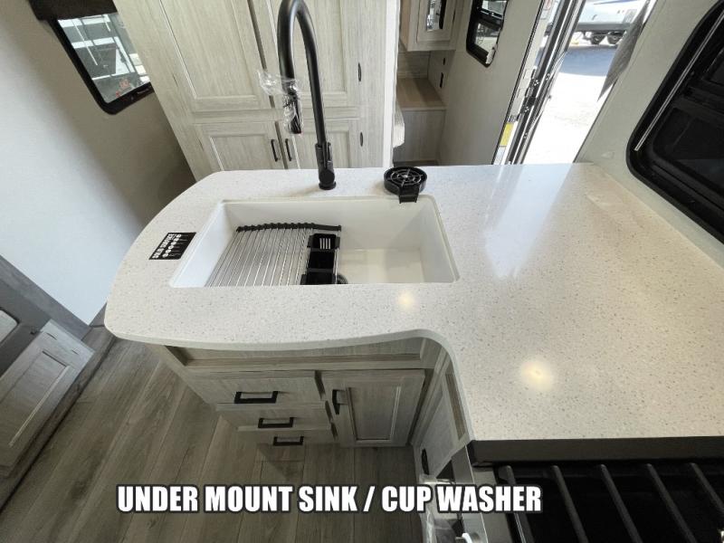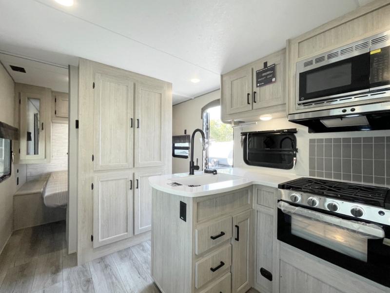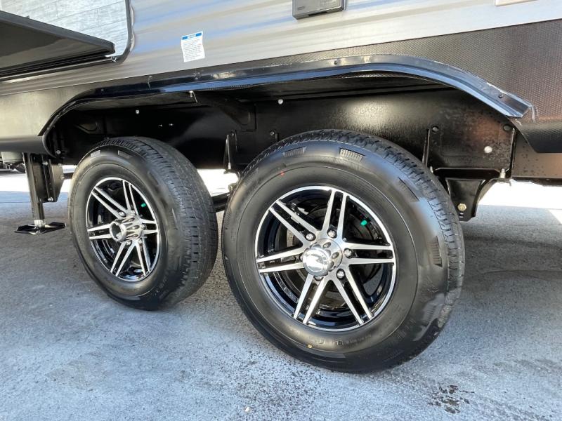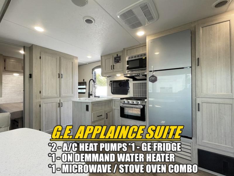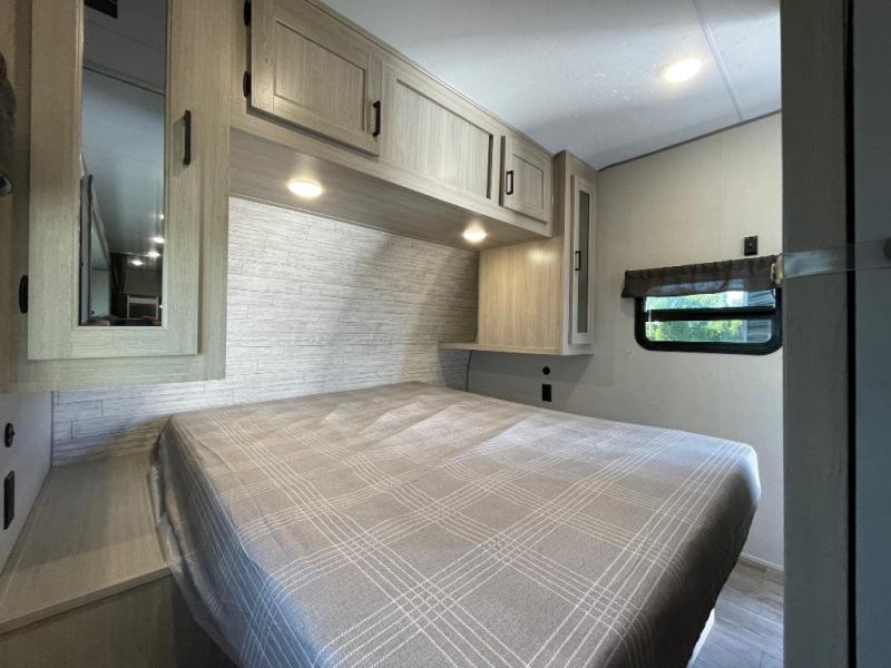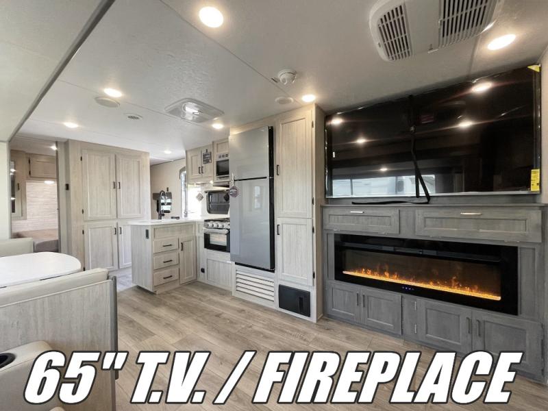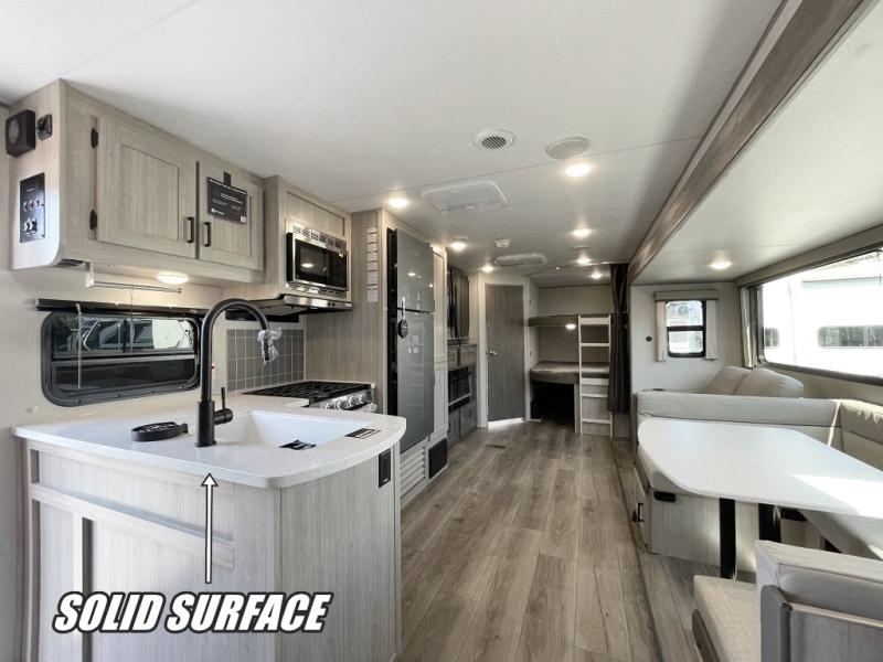 This travel trailer is perfect for your whole crew! Once you arrive at the campground, you can put out the 21' electric awning and start lunch on the exterior camper kitchen with a griddle and mini fridge. There is also a pass-thru storage plus additional exterior storage with a fold-down table and a TV hookup for added convenience. And since there are dual entry doors found on this unit, you can enter in through the full bath in the back, or the main living area towards the front! A large slide provides ample space to move about, and you'll find a trundle sofa and U-shaped dinette here for cozy seating and sleeping space. Speaking of sleeping, there is a front RV queen bed in the bedroom plus double-size bunks in the back for guests!