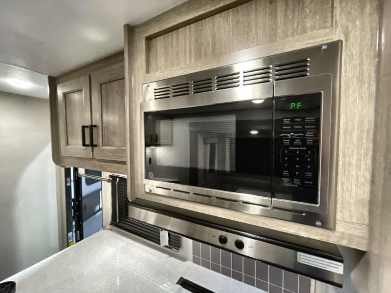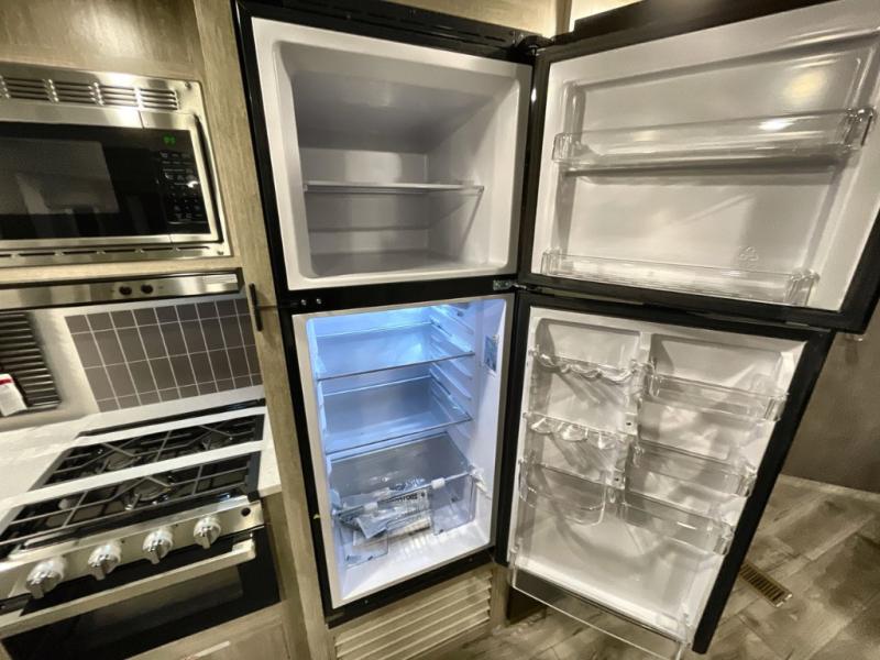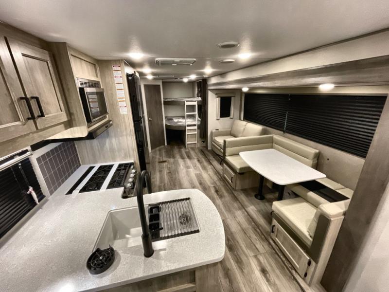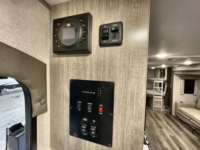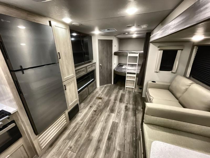 This travel trailer is perfect for your whole crew! Once you arrive at the campground, you can put out the 21' electric awning and start lunch on the exterior camper kitchen with a griddle and mini fridge. There is also a pass-thru storage plus additional exterior storage with a fold-down table and a TV hookup for added convenience. And since there are dual entry doors found on this unit, you can enter in through the full bath in the back, or the main living area towards the front! A large slide provides ample space to move about, and you'll find a trundle sofa and U-shaped dinette here for cozy seating and sleeping space. Speaking of sleeping, there is a front RV queen bed in the bedroom plus double-size bunks in the back for guests!