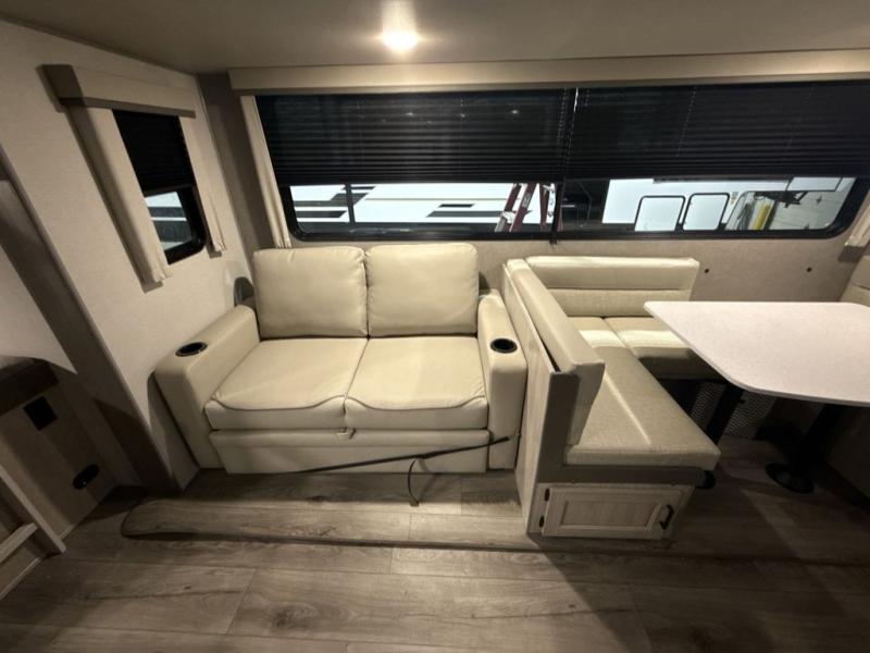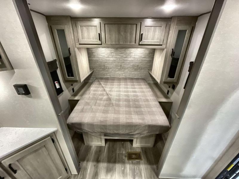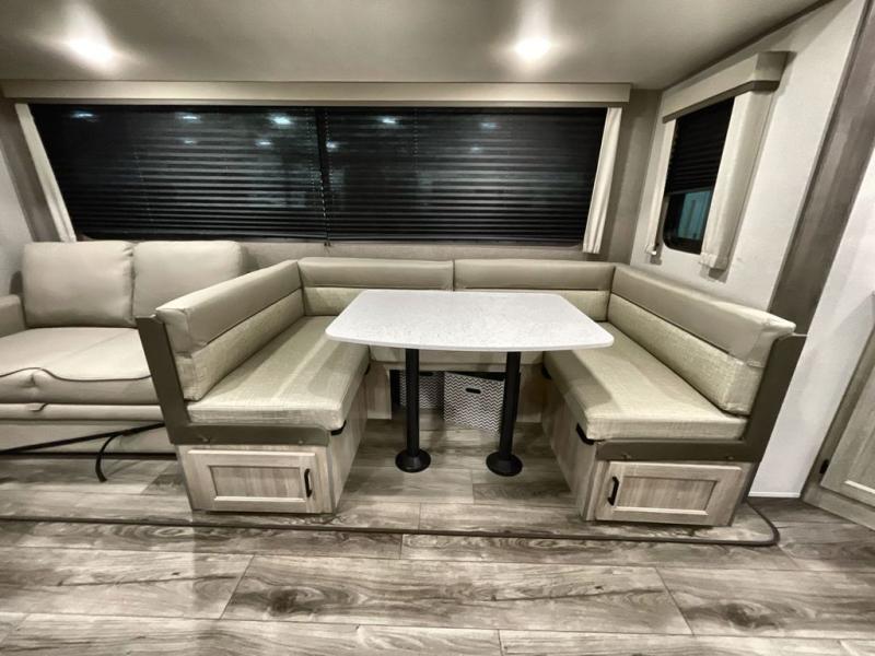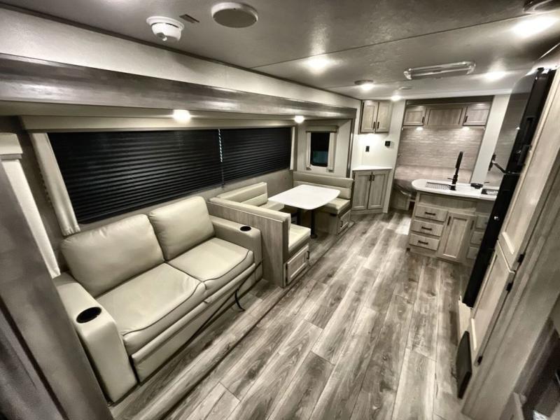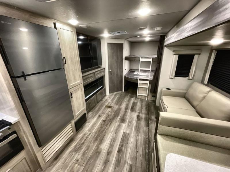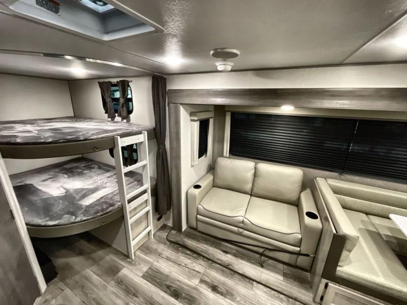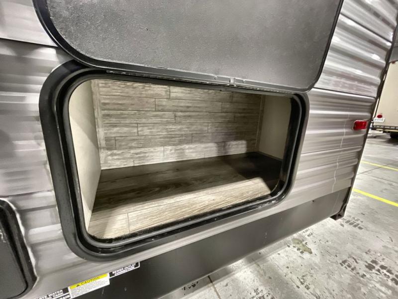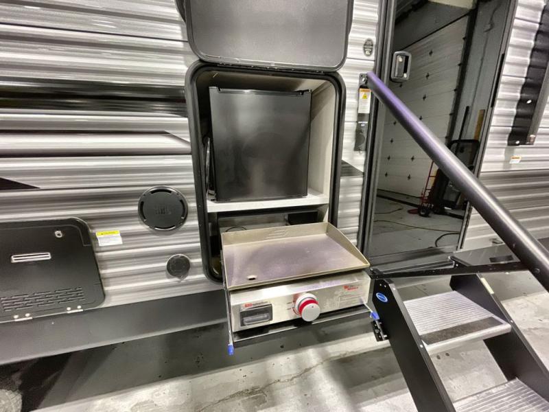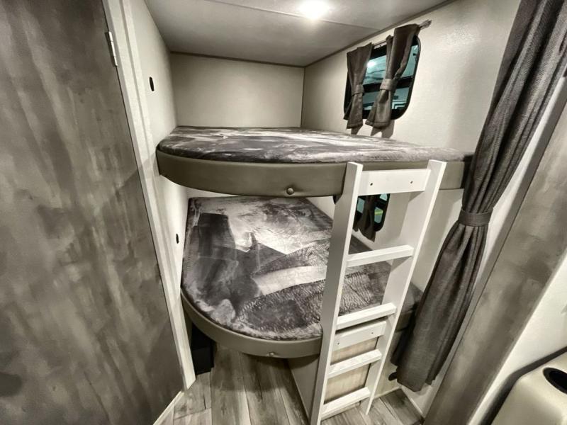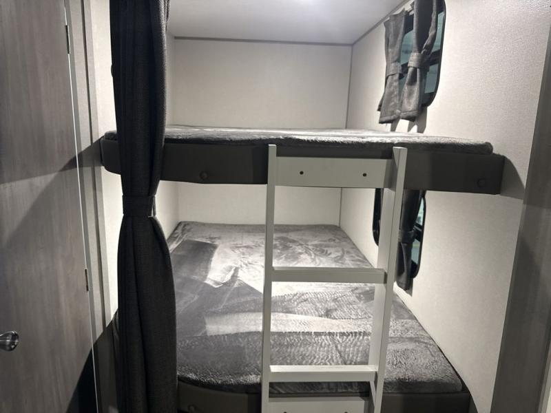 This travel trailer is perfect for your whole crew! Once you arrive at the campground, you can put out the 21' electric awning and start lunch on the exterior camper kitchen with a griddle and mini fridge. There is also a pass-thru storage plus additional exterior storage with a fold-down table and a TV hookup for added convenience. And since there are dual entry doors found on this unit, you can enter in through the full bath in the back, or the main living area towards the front! A large slide provides ample space to move about, and you'll find a trundle sofa and U-shaped dinette here for cozy seating and sleeping space. Speaking of sleeping, there is a front RV queen bed in the bedroom plus double-size bunks in the back for guests!