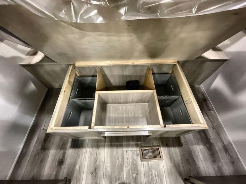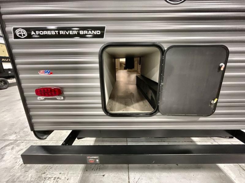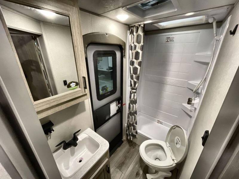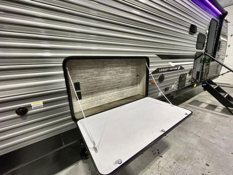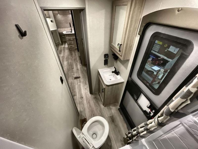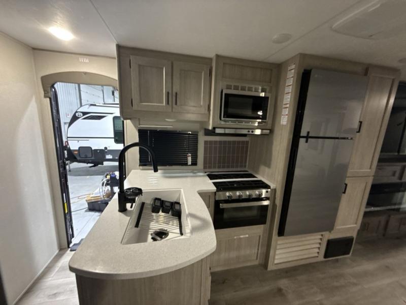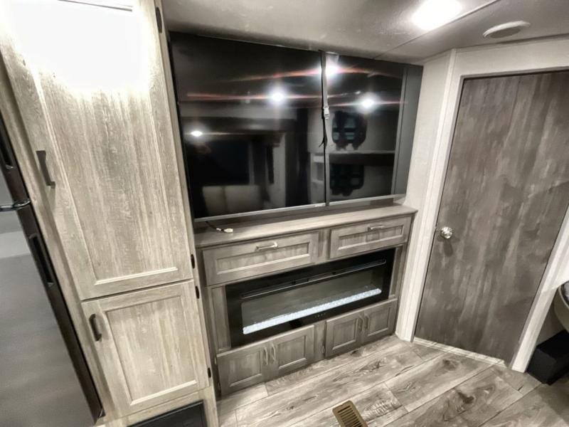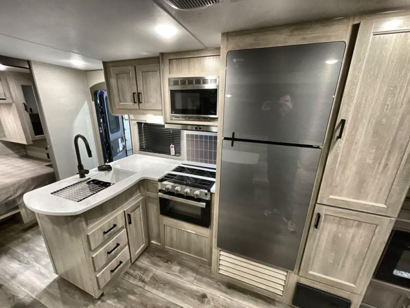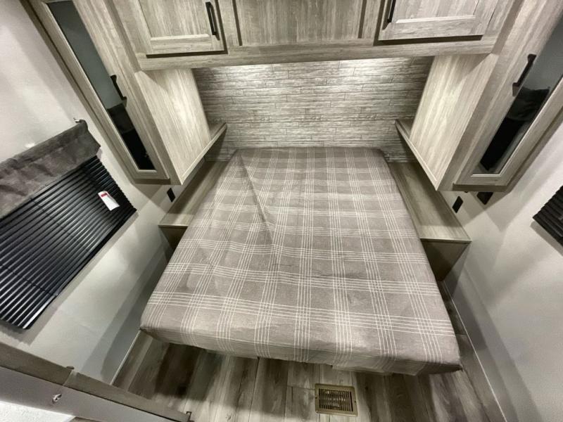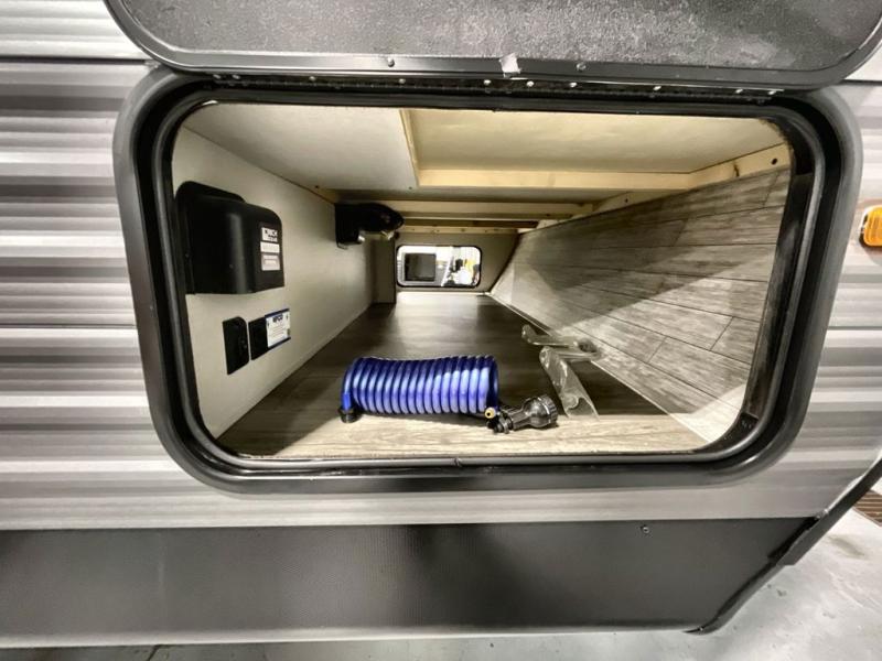 This travel trailer is perfect for your whole crew! Once you arrive at the campground, you can put out the 21' electric awning and start lunch on the exterior camper kitchen with a griddle and mini fridge. There is also a pass-thru storage plus additional exterior storage with a fold-down table and a TV hookup for added convenience. And since there are dual entry doors found on this unit, you can enter in through the full bath in the back, or the main living area towards the front! A large slide provides ample space to move about, and you'll find a trundle sofa and U-shaped dinette here for cozy seating and sleeping space. Speaking of sleeping, there is a front RV queen bed in the bedroom plus double-size bunks in the back for guests!