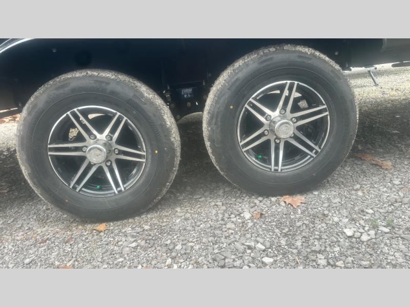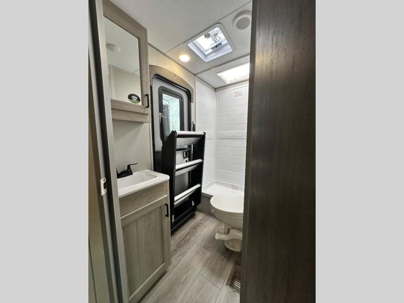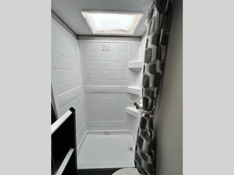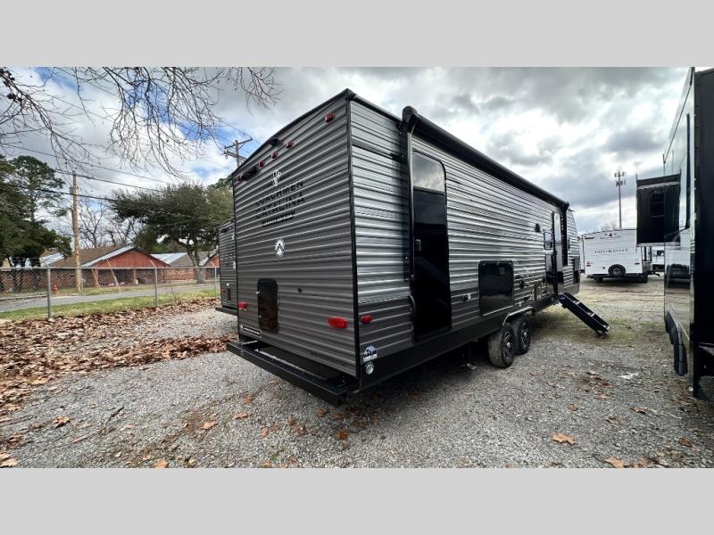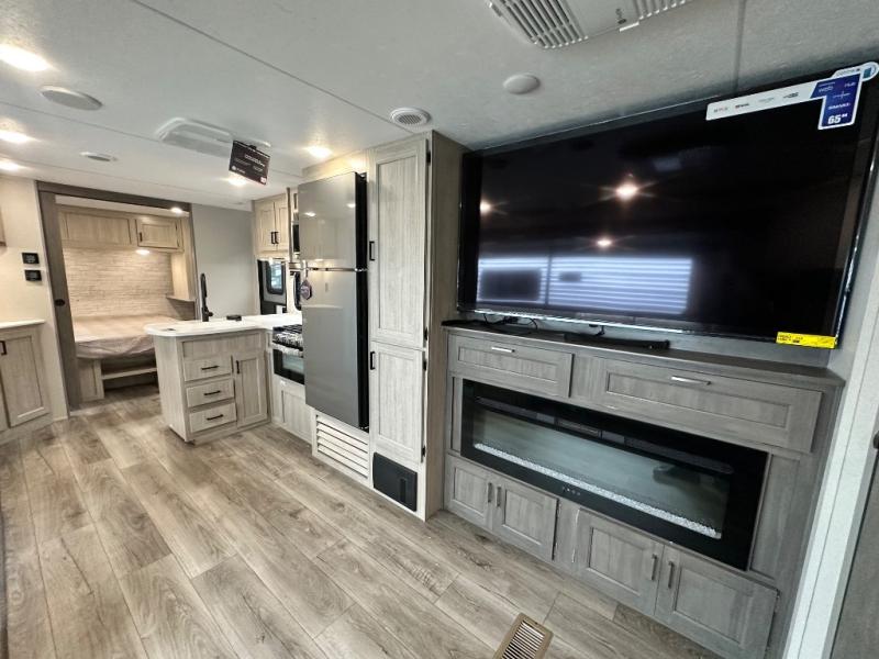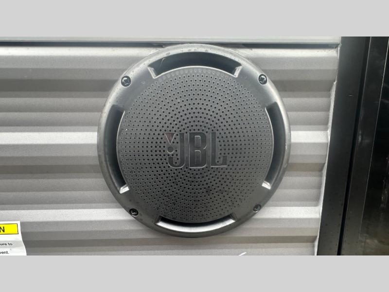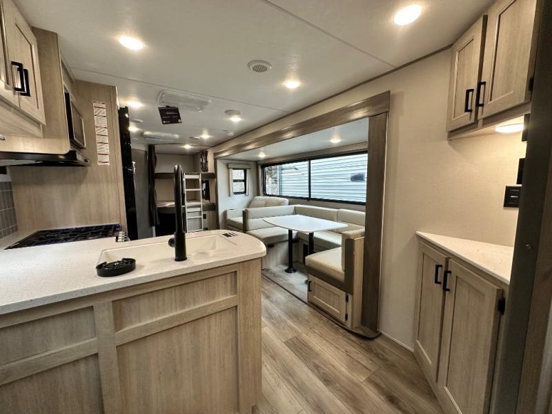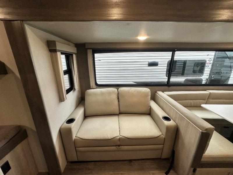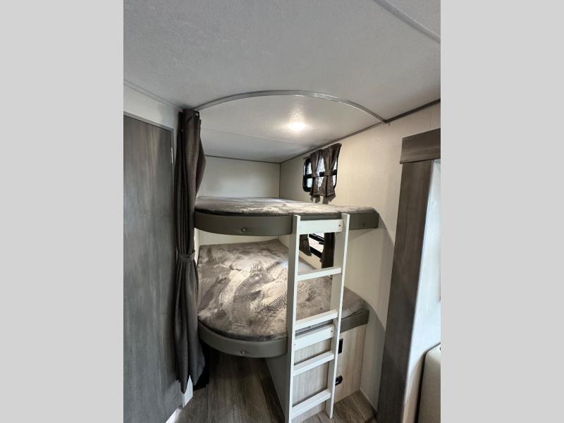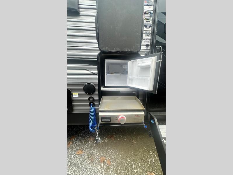 This travel trailer is perfect for your whole crew! Once you arrive at the campground, you can put out the 21' electric awning and start lunch on the exterior camper kitchen with a griddle and mini fridge. There is also a pass-thru storage plus additional exterior storage with a fold-down table and a TV hookup for added convenience. And since there are dual entry doors found on this unit, you can enter in through the full bath in the back, or the main living area towards the front! A large slide provides ample space to move about, and you'll find a trundle sofa and U-shaped dinette here for cozy seating and sleeping space. Speaking of sleeping, there is a front RV queen bed in the bedroom plus double-size bunks in the back for guests!