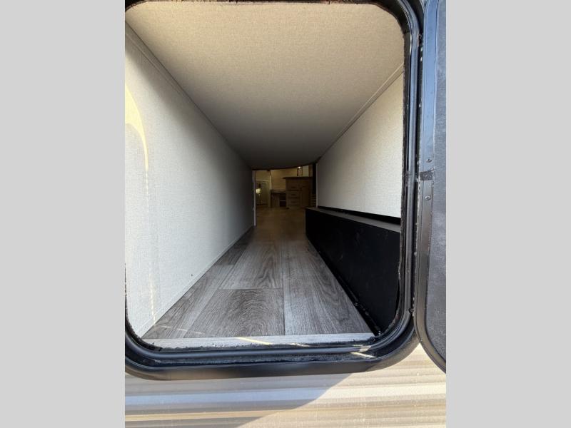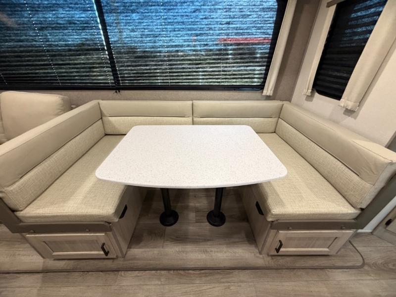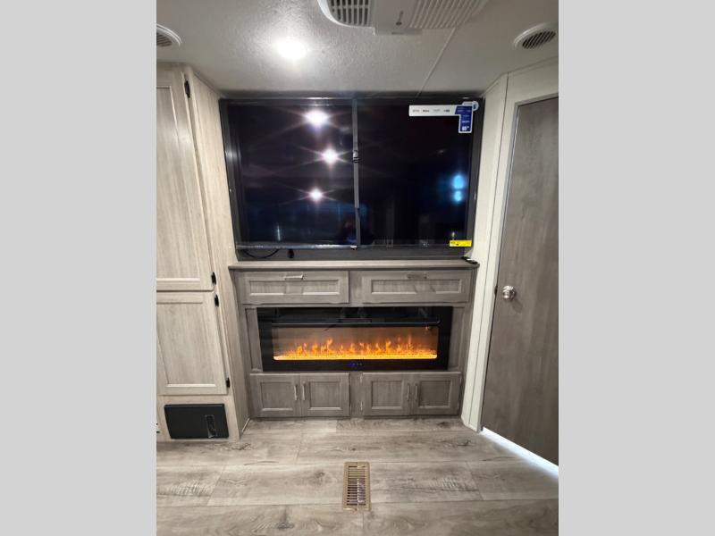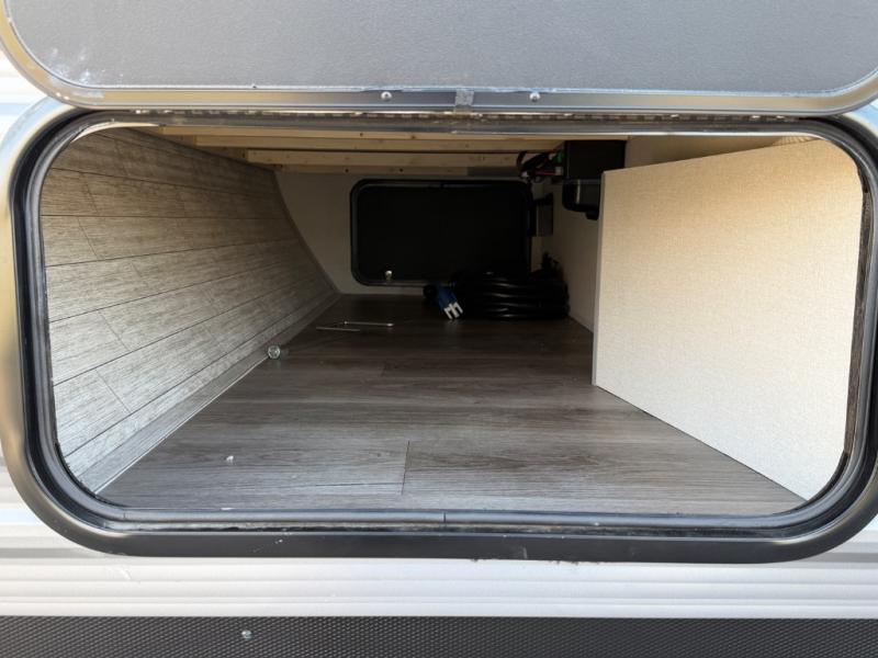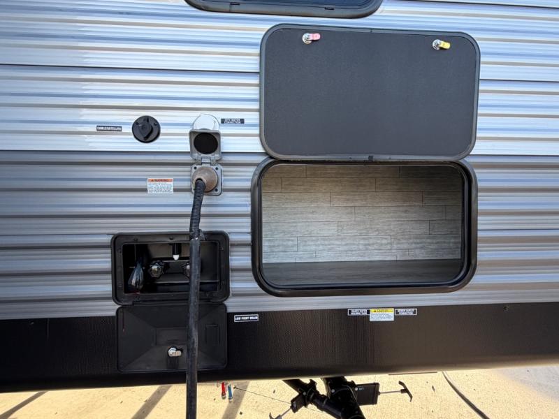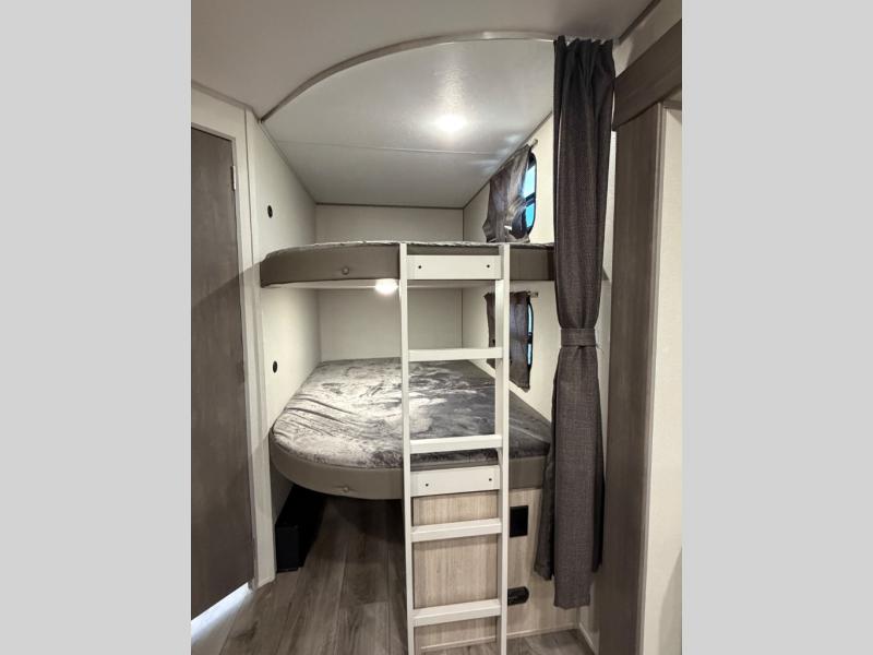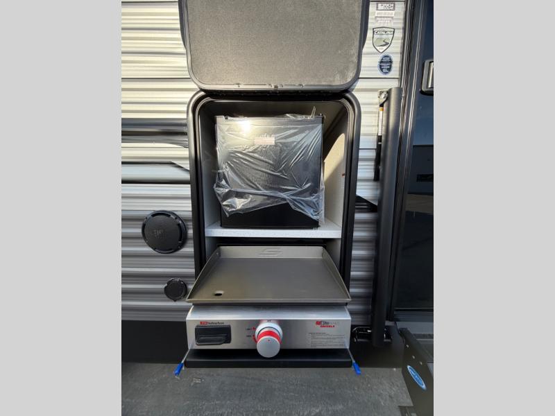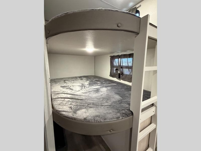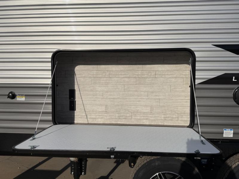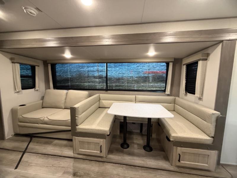 This travel trailer is perfect for your whole crew! Once you arrive at the campground, you can put out the 21' electric awning and start lunch on the exterior camper kitchen with a griddle and mini fridge. There is also a pass-thru storage plus additional exterior storage with a fold-down table and a TV hookup for added convenience. And since there are dual entry doors found on this unit, you can enter in through the full bath in the back, or the main living area towards the front! A large slide provides ample space to move about, and you'll find a trundle sofa and U-shaped dinette here for cozy seating and sleeping space. Speaking of sleeping, there is a front RV queen bed in the bedroom plus double-size bunks in the back for guests!