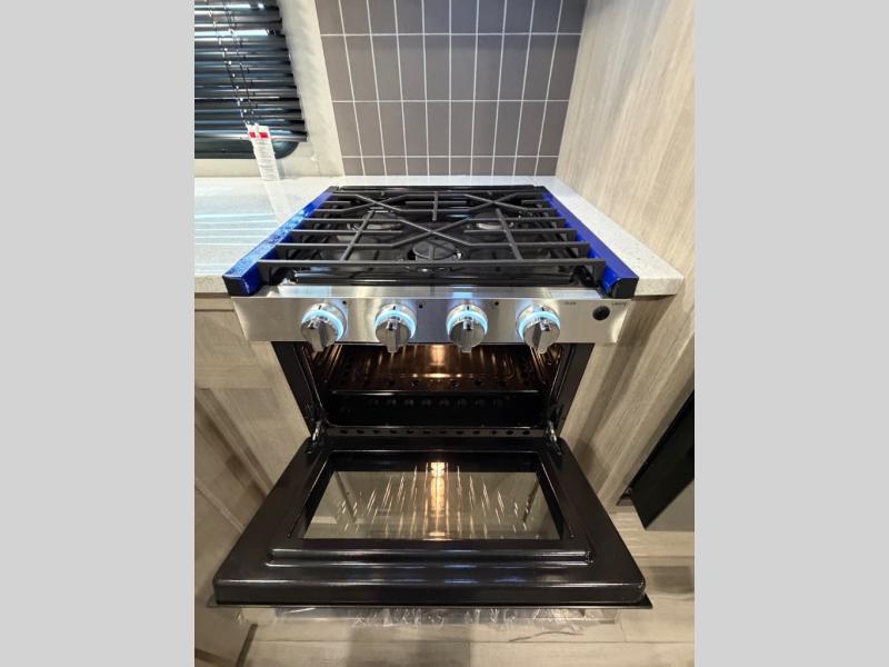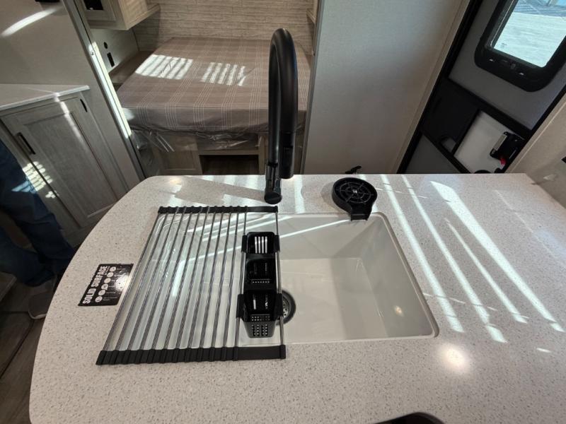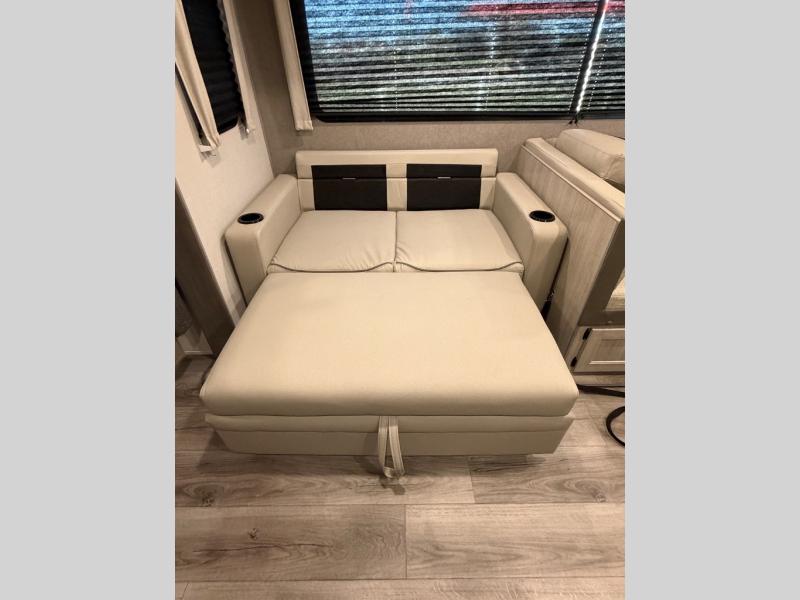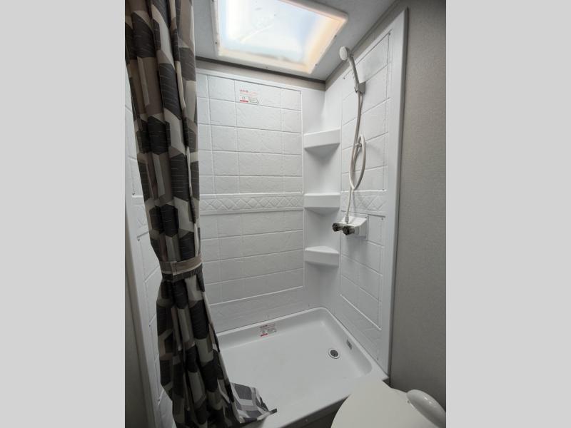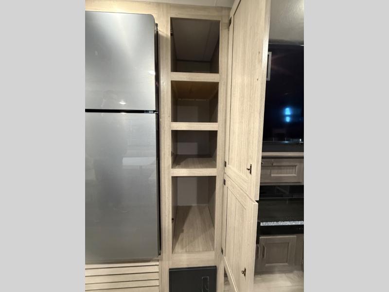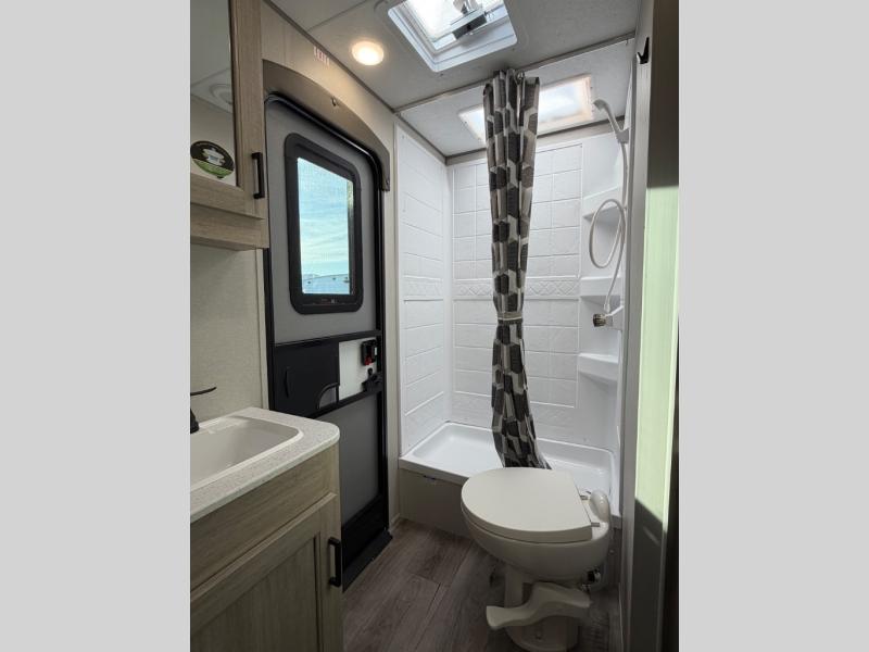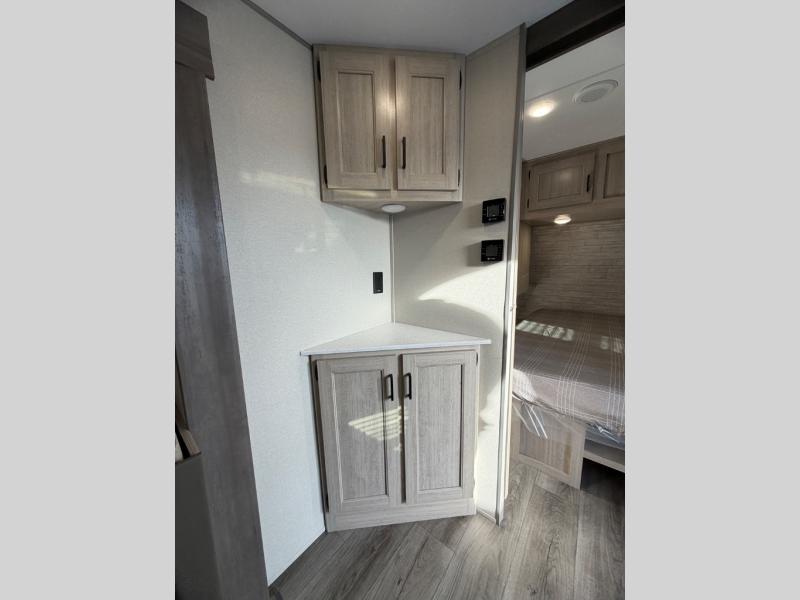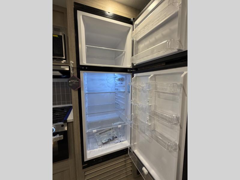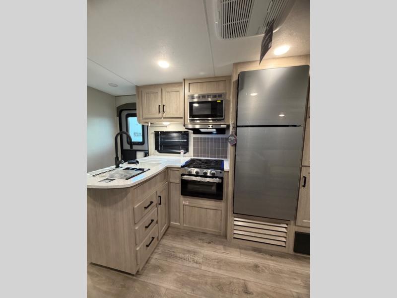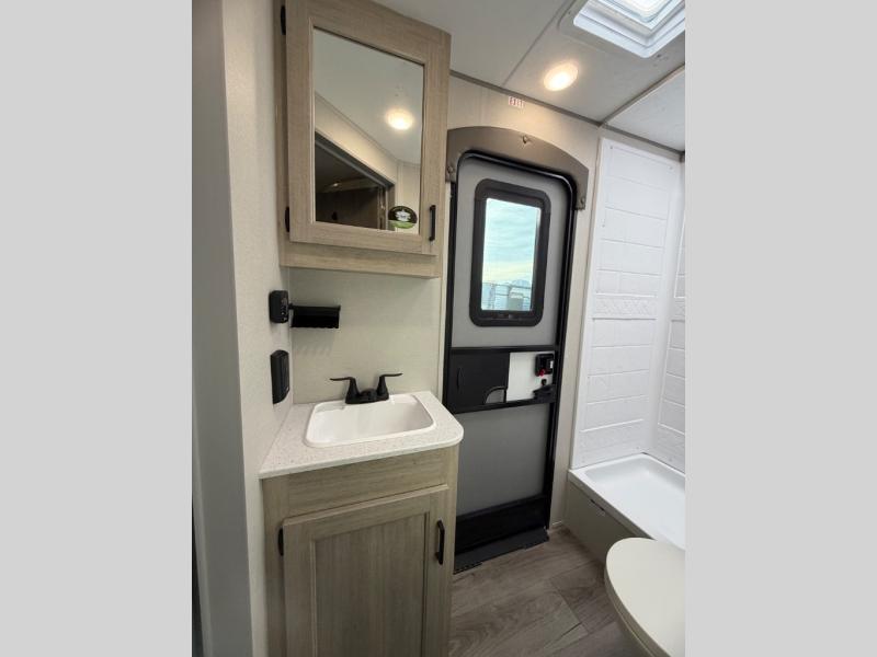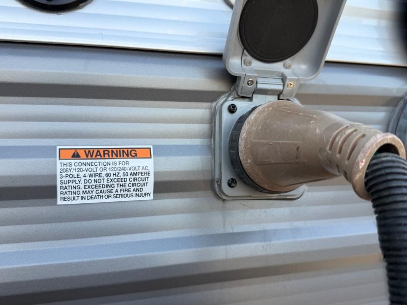 This travel trailer is perfect for your whole crew! Once you arrive at the campground, you can put out the 21' electric awning and start lunch on the exterior camper kitchen with a griddle and mini fridge. There is also a pass-thru storage plus additional exterior storage with a fold-down table and a TV hookup for added convenience. And since there are dual entry doors found on this unit, you can enter in through the full bath in the back, or the main living area towards the front! A large slide provides ample space to move about, and you'll find a trundle sofa and U-shaped dinette here for cozy seating and sleeping space. Speaking of sleeping, there is a front RV queen bed in the bedroom plus double-size bunks in the back for guests!