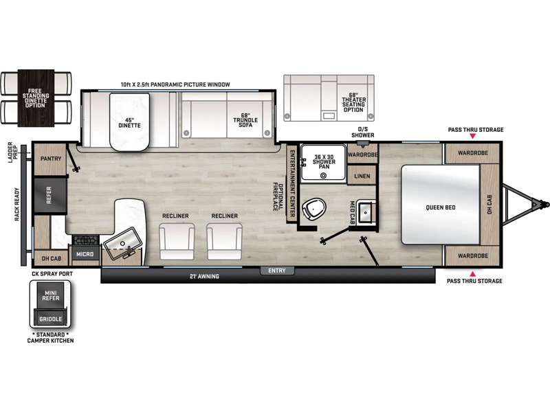 Whether you camp to relax indoors or play outdoors, this trailer offers interior comforts for a couple or a family of four! From the spacious rear kitchen thanks to the large slide out that includes a booth dinette and sofa. Yet you might like to choose the free standing dinette option in place of the booth dinette. There is a 10 cu. ft. refrigerator and pantry for food storage, plus ample counter space to prep your best meals. And the dual lounges will probably be popular seats. At night head to the front bedroom to sleep on the walk-around queen bed after stopping off at the full bathroom to get cleaned up.