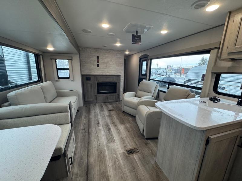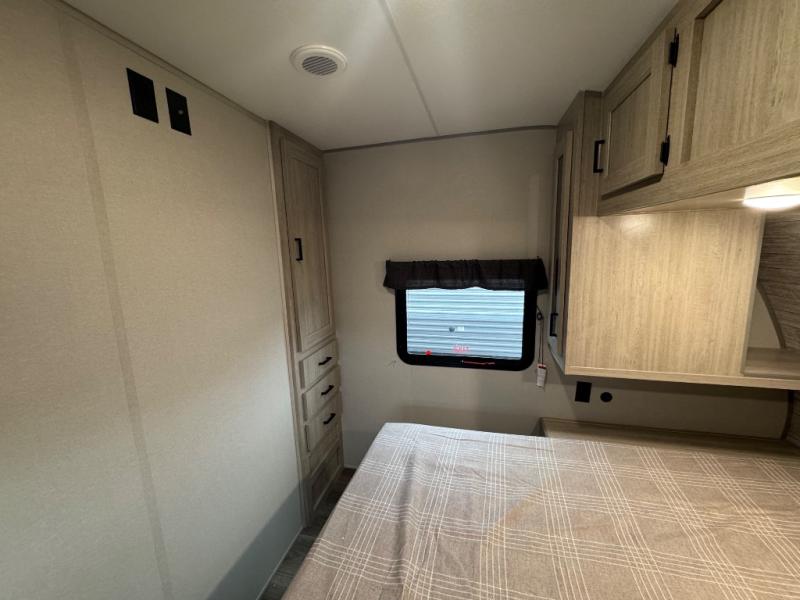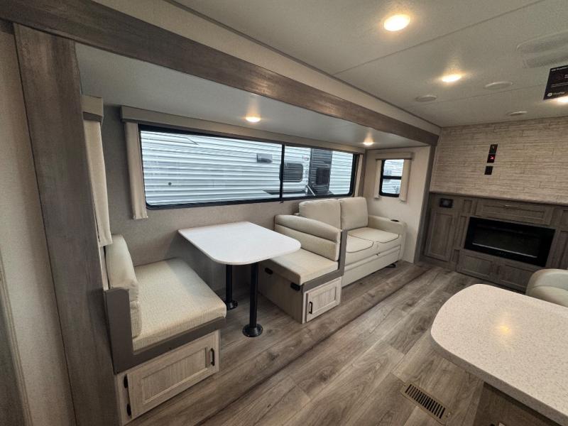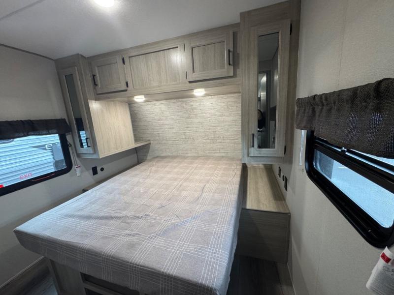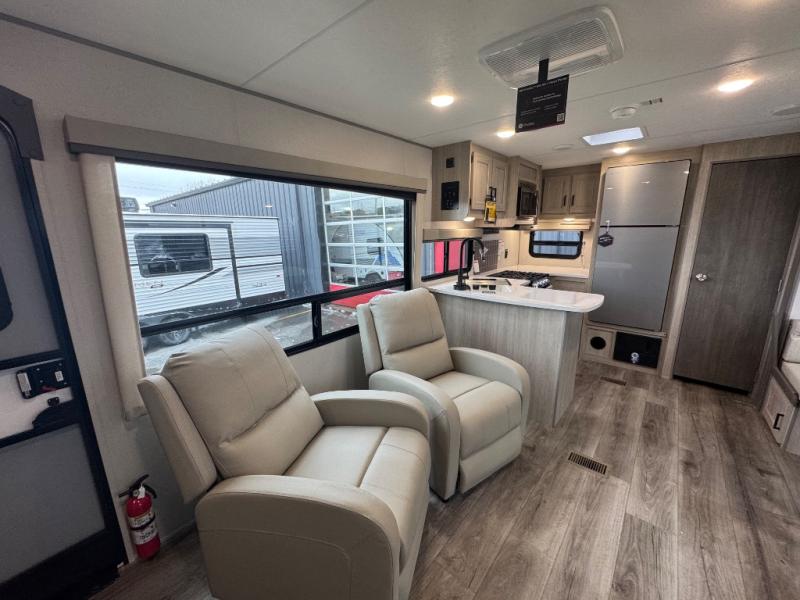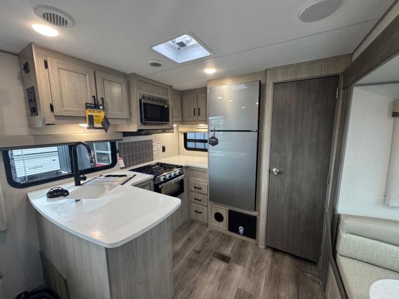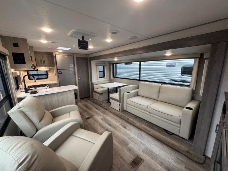 Whether you camp to relax indoors or play outdoors, this trailer offers interior comforts for a couple or a family of four or five! From the spacious rear kitchen thanks to the large slide out that includes a booth dinette and trundle sofa. Yet you might like to choose the free-standing dinette option in place of the booth dinette. There is a 10.7 cu. ft. refrigerator and pantry for food storage, plus ample counter space to prep your best meals. And the dual recliners are sure to be popular seats. At night head to the front bedroom to sleep on the walk-around queen bed after stopping off at the full bathroom to get cleaned up.