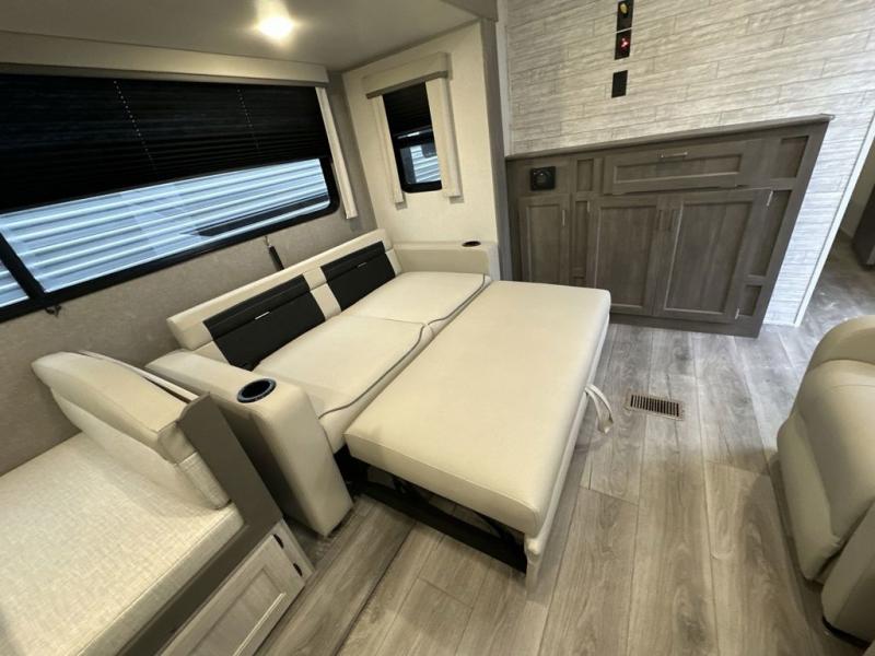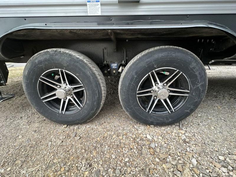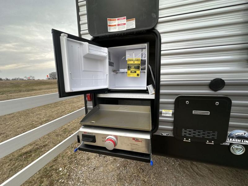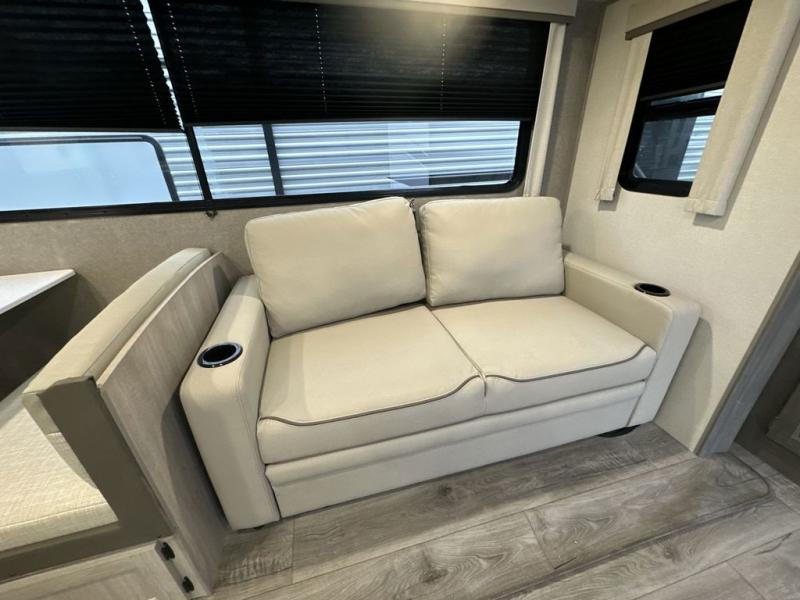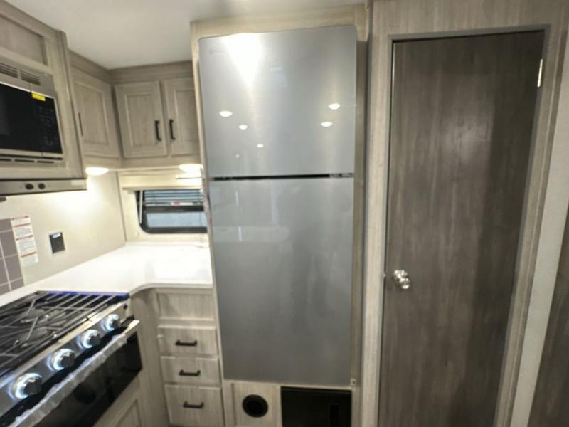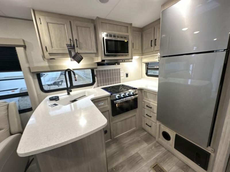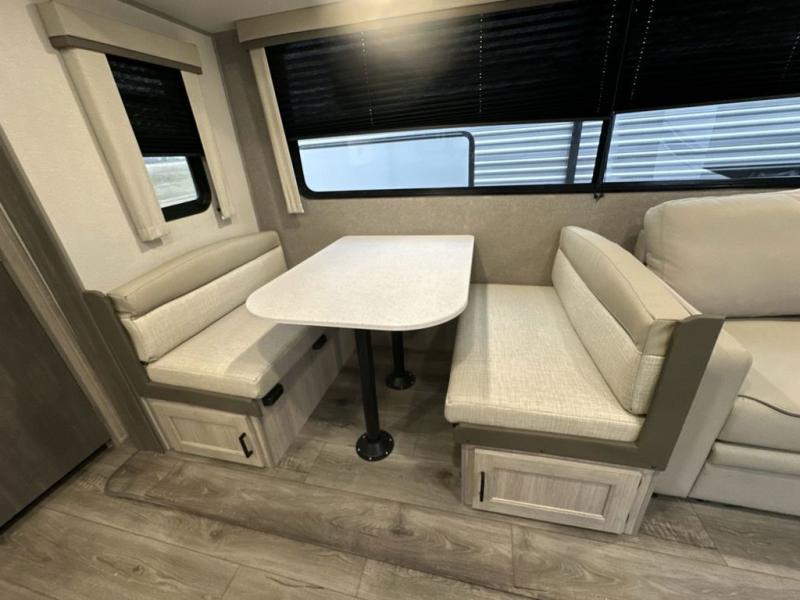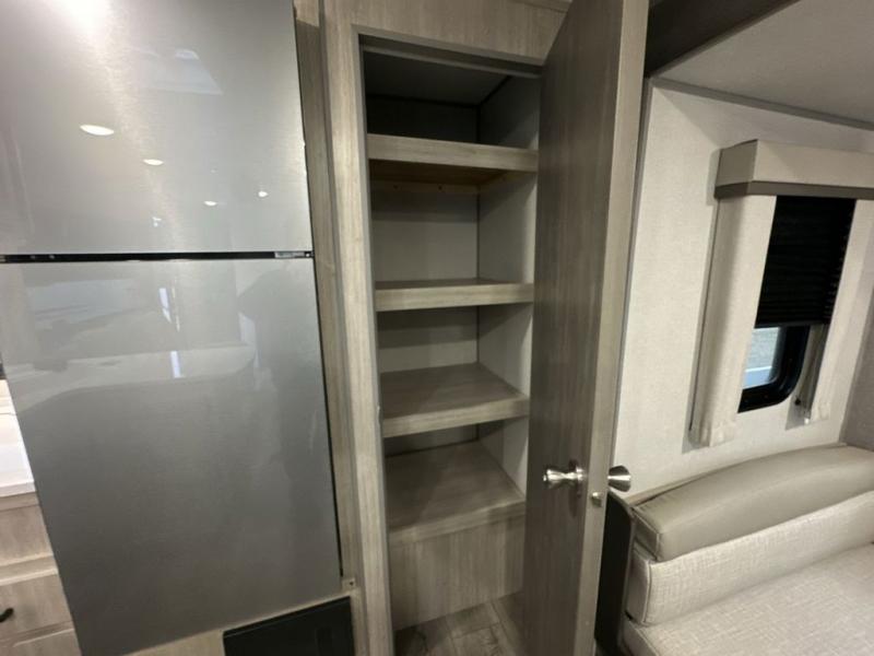 Whether you camp to relax indoors or play outdoors, this trailer offers interior comforts for a couple or a family of four or five! From the spacious rear kitchen thanks to the large slide out that includes a booth dinette and trundle sofa. Yet you might like to choose the free-standing dinette option in place of the booth dinette. There is a 10.7 cu. ft. refrigerator and pantry for food storage, plus ample counter space to prep your best meals. And the dual recliners are sure to be popular seats. At night head to the front bedroom to sleep on the walk-around queen bed after stopping off at the full bathroom to get cleaned up.