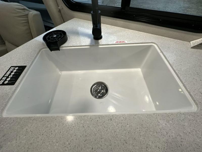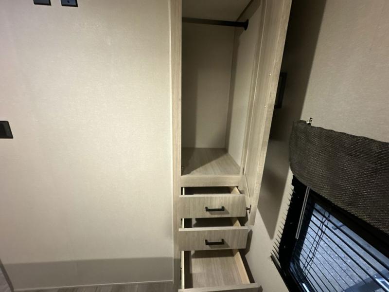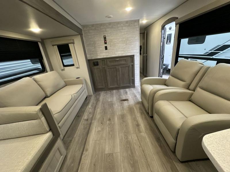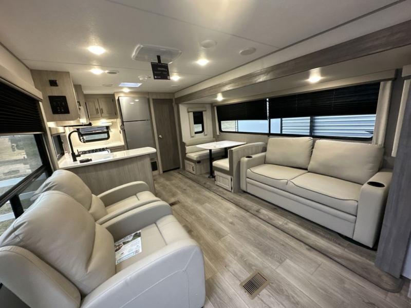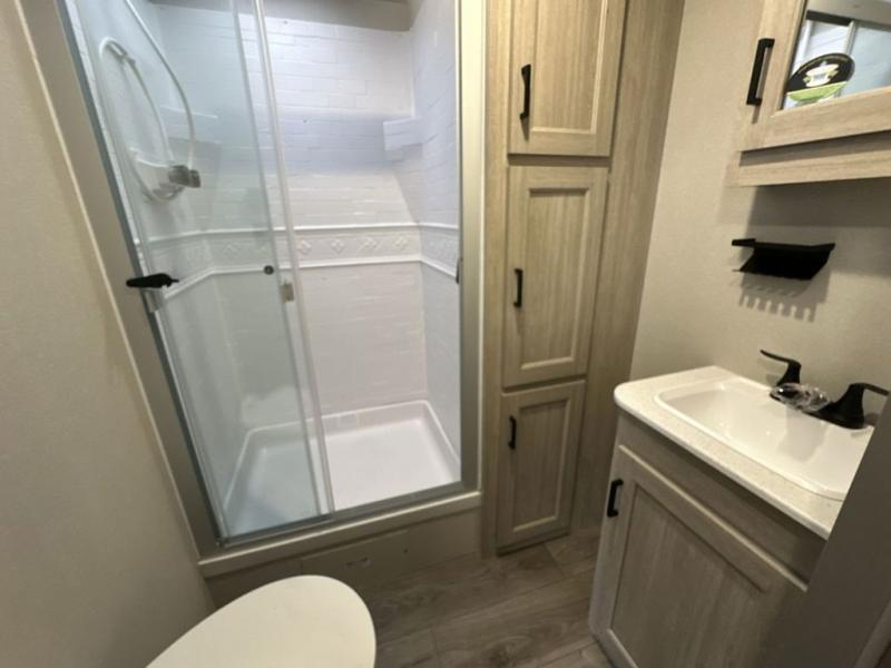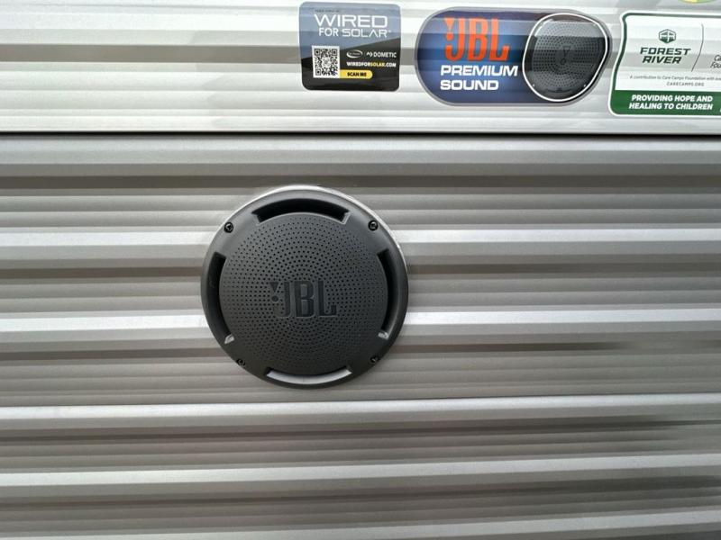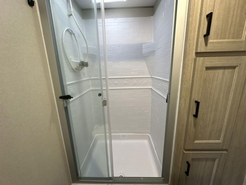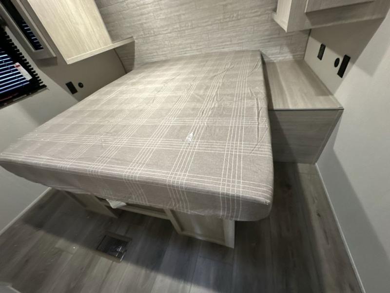 Whether you camp to relax indoors or play outdoors, this trailer offers interior comforts for a couple or a family of four or five! From the spacious rear kitchen thanks to the large slide out that includes a booth dinette and trundle sofa. Yet you might like to choose the free-standing dinette option in place of the booth dinette. There is a 10.7 cu. ft. refrigerator and pantry for food storage, plus ample counter space to prep your best meals. And the dual recliners are sure to be popular seats. At night head to the front bedroom to sleep on the walk-around queen bed after stopping off at the full bathroom to get cleaned up.