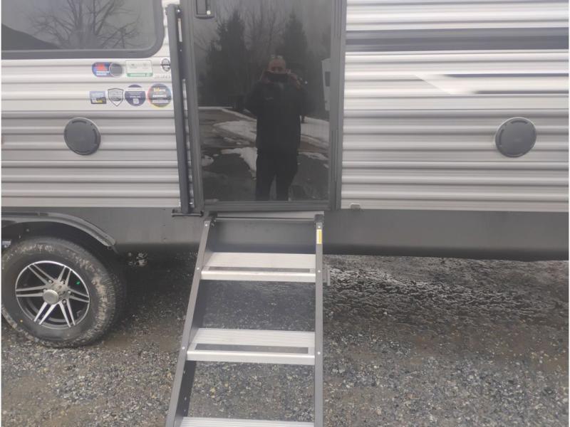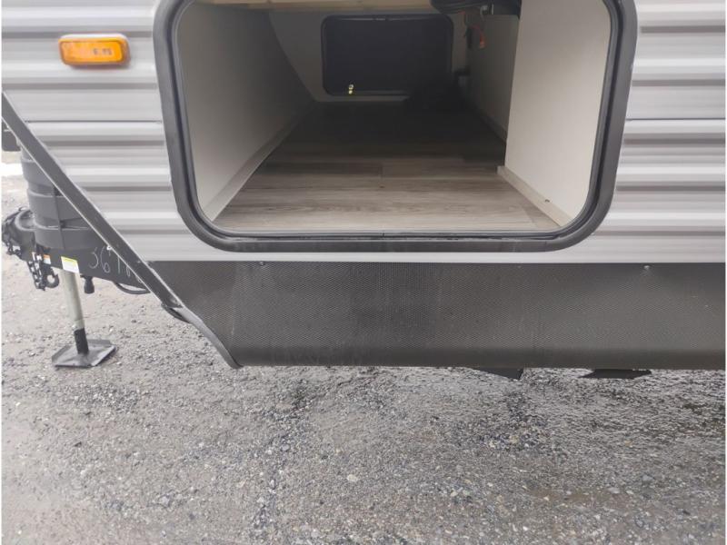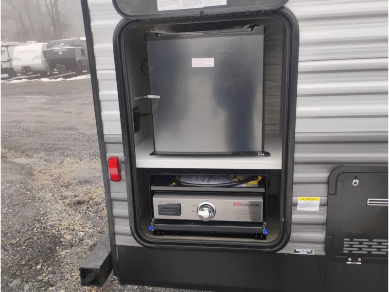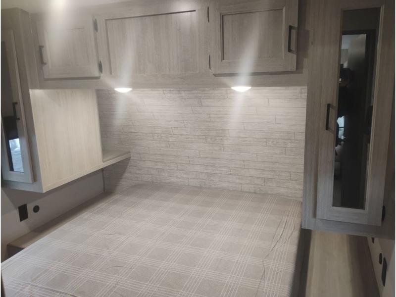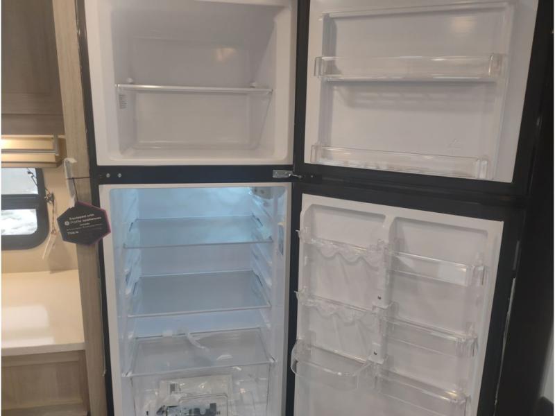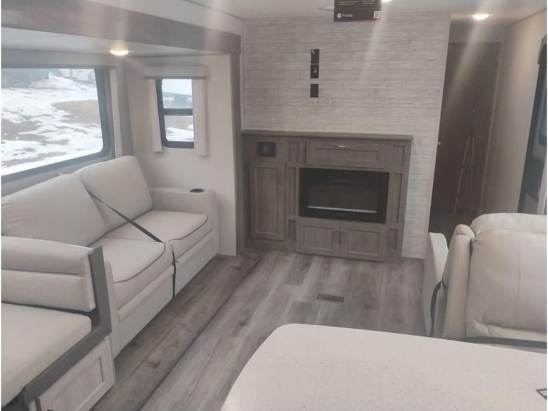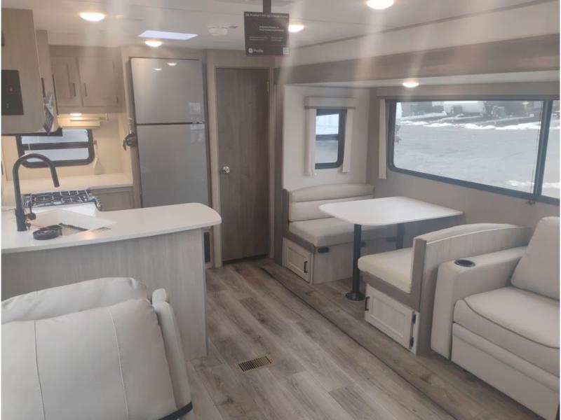 Whether you camp to relax indoors or play outdoors, this trailer offers interior comforts for a couple or a family of four or five! From the spacious rear kitchen thanks to the large slide out that includes a booth dinette and trundle sofa. Yet you might like to choose the free-standing dinette option in place of the booth dinette. There is a 10.7 cu. ft. refrigerator and pantry for food storage, plus ample counter space to prep your best meals. And the dual recliners are sure to be popular seats. At night head to the front bedroom to sleep on the walk-around queen bed after stopping off at the full bathroom to get cleaned up.