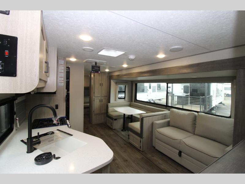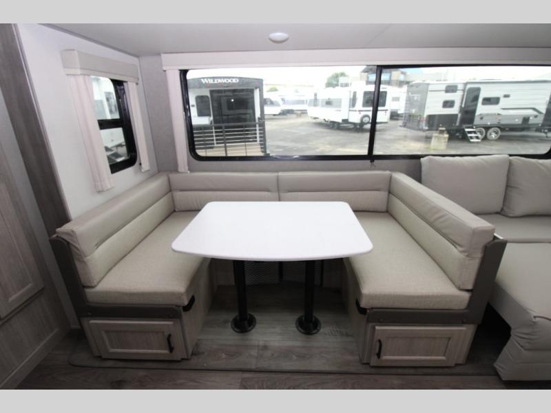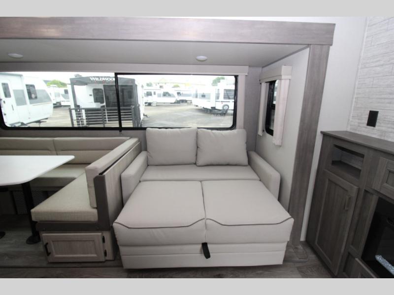 Not only will you be comfortable in this trailer, your friends will have comfort and privacy thanks to having their own bunkhouse, and you'll have a front bedroom where you can sleep like royalty! There are three bunk beds and a jack knife sofa with storage totes below plus a TV cabinet if you want to add a television here. The combined living and kitchen is spacious thanks to the slide out U-shaped dinette and sofa with drink holders. You can even add the fireplace option if you want that feature. The cook will have full amenities to whip up meals including overhead cabinets for dishes and snacks. And the exterior camper kitchen allows the cook to visit with everyone outside under the 18' electric awning that includes multicolor LED lights with a remote.